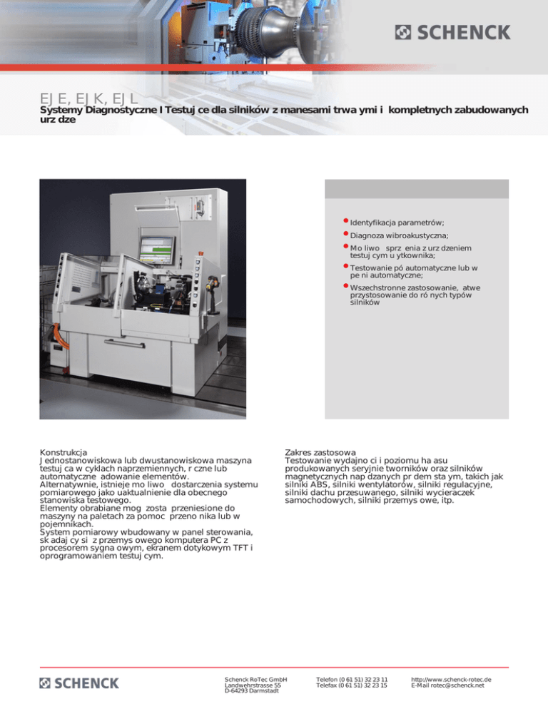 EJE, EJK, EJL Systemy Diagnostyczne I Testuj ce dla silników z manesami trwa ymi i kompletnych zabudowanych urz dze • Identyfikacja parametrów; • Diagnoza wibroakustyczna; • Mo liwo sprz enia z urz dzeniem testuj cym u ytkownika; • Testowanie pó automatyczne lub w pe ni automatyczne; • Wszechstronne zastosowanie, atwe przystosowanie do ró nych typów silników Konstrukcja Jednostanowiskowa lub dwustanowiskowa maszyna testuj ca w cyklach naprzemiennych, r czne lub automatyczne adowanie elementów. Alternatywnie, istnieje mo liwo dostarczenia systemu pomiarowego jako uaktualnienie dla obecnego stanowiska testowego. Elementy obrabiane mog zosta przeniesione do maszyny na paletach za pomoc przeno nika lub w pojemnikach. System pomiarowy wbudowany w panel sterowania, sk adaj cy si z przemys owego komputera PC z procesorem sygna owym, ekranem dotykowym TFT i oprogramowaniem testuj cym. Zakres zastosowa Testowanie wydajno ci i poziomu ha asu produkowanych seryjnie tworników oraz silników magnetycznych nap dzanych pr dem sta ym, takich jak silniki ABS, silniki wentylatorów, silniki regulacyjne, silniki dachu przesuwanego, silniki wycieraczek samochodowych, silniki przemys owe, itp. Schenck RoTec GmbH Landwehrstrasse 55 D-64293 Darmstadt Telefon (0 61 51) 32 23 11 Telefax (0 61 51) 32 23 15 http://www.schenck-rotec.de E-Mail [email protected] EJE, EJK, EJL Systemy Diagnostyczne I Testuj ce dla silników z manesami trwa ymi i kompletnych zabudowanych urz dze The PI system uses the parameter identification process to measure characteristic motor parameters such as resistance, magnetic flux, core loss, friction-moment, etc. This method makes it possible to determine the motor characteristic curves without load-coupling, whereby there are considerable speed advantages compared to conventional methods. Through deviations from specific parameters conclusions can be made concerning manufacturing errors like false or short-circuited windings, false magnetization, too high bearing or brush friction, etc. Fully automatic testing permits the EJL diagnostic system to include one or more of the following: Parameter identification, single or multi-channel objective noise testing and an air-borne sound test (optional). The easy change over for various motor types guarantees flexible application.As with all PI/VAD systems, a powerful industrial PC is used for measured data processing and control of the testing sequence. Software modules tailored to the application allow a precise evaluation and help to ensure product quality. The objective noise test provided by the diagnostic system can be used in many areas of industrial manufacturing and allows simple and cost-effective quality assurance. Within the framework of vibro-acoustic diagnosis the noise spectrum obtained from the test motor is analyzed to identify defective components through characteristic noise features. The VAD system is adaptive and can be calibrated to recognize quality-relevant noises or noise components on the basis of a reference noise pattern. No other method that can so effecttively test the constructional measures – for a quieter, vibration-free, more comfortable product. 1 Testing table with sliding protective hood2 Switch cabinet Schenck RoTec GmbH Landwehrstrasse 55 D-64293 Darmstadt Plan view (non-binding example: dimensions of the switch cabinet depend on the relevant application) Telefon (0 61 51) 32 23 11 Telefax (0 61 51) 32 23 15 http://www.schenck-rotec.de E-Mail [email protected] EJE, EJK, EJL Systemy Diagnostyczne I Testuj ce dla silników z manesami trwa ymi i kompletnych zabudowanych urz dze Technical data at a glance EJE Measuring unit EJK EJK-TWIN EJL EJL-TWIN PC with signal processor PC with signal processor PC with signal processor PC with signal processor PC with signal processor Number of test stations 1 2 Semi-automatic test sequence • • Fully automatic test sequence 1 2 • • Analysis of motor current • • • • • Determining of motor parameters • • • • • Evaluation of the motor characteristic curve • • • • • Statistics of all measured results • • • • • • • • • Motor support and protective cover Test object (Motor) Nominal voltage, max. [V] 30/60/250 30/60/250 30/60/250 30/60/250 30/60/250 Run-up current, max. [A] 150/100/20 150/100/20 150/100/20 150/100/20 150/100/20 No load speed, max. [min -1] 40.000 40.000 40.000 40.000 40.000 Width A [mm] 600 2200 2700 3000 3000 Depth B [mm] 600 2000 2000 2000 2000 Height C [mm] 2200 2200 2200 2200 2200 Measurement uncertainty [%] 1 1 1 1 1 Test time [s] 2,5 2,5 2,5 7 5 [min] 0 0-5 0-5 0-5 0-5 Order No. R0480100.01 R0490100.01 R0490200.01 R0500100.01 R0500200.01 Order No. R0480101.01 R0490101.01 R0490201.01 R0500101.01 R0500201.01 HV testing AC 5000V Order No. R0480102.01 R0490102.01 R0490202.01 R0500102.01 R0500202.01 Rotational direction test Order No. R0480103.01 R0490103.01 R0490203.01 R0500103.01 R0500203.01 Noise check Order No. R0480104.01 R0490104.01 R0490204.01 R0500104.01 R0500204.01 Continuity test Order No. R0480105.01 R0490105.01 R0490205.01 R0500105.01 R0500205.01 Process coupling via DIO Order No. R0480106.01 - - R0500106.01 R0500206.01 Network coupling Order No. R0480107.01 R0490107.01 R0490207.01 R0500107.01 R0500207.01 Tele-service Order No. R0480108.01 R0490108.01 R0490208.01 R0500108.01 R0500208.01 Transfer of measured values to external PC Order No. R0480109.01 R0490109.01 R0490209.01 R0500109.01 R0500209.01 Printer Order No. R0480110.01 R0490110.01 R0490210.01 R0500110.01 R0500210.01 Machine Change over time Schenck RoTec GmbH Landwehrstrasse 55 D-64293 Darmstadt Telefon (0 61 51) 32 23 11 Telefax (0 61 51) 32 23 15 http://www.schenck-rotec.de E-Mail [email protected] EJE, EJK, EJL Systemy Diagnostyczne I Testuj ce dla silników z manesami trwa ymi i kompletnych zabudowanych urz dze 2) Data non-binding, dependent on respective equipment 3) Measuring time 4) Without hand ing Schenck RoTec 