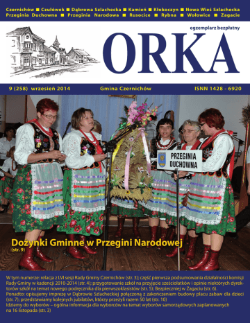 Czernichów X Czułówek X Dąbrowa Szlachecka X Kamień X Kłokoczyn X Nowa Wieś Szlachecka Przeginia Duchowna X Przeginia Narodowa X Rusocice X Rybna X Wołowice X Zagacie egzemplarz bezpłatny 9 (258) wrzesień 2014 ORKA Gmina Czernichów ISNN 1428 - 6920 Dożynki Gminne w Przegini Narodowej (str. 9) W tym numerze: relacja z LVI sesji Rady Gminy Czernichów (str. 3); część pierwsza podsumowania działalności komisji Rady Gminy w kadencji 2010-2014 (str. 4); przygotowanie szkół na przyjęcie sześciolatków i opinie niektórych dyrektorów szkół na temat nowego podręcznika dla pierwszoklasistów (str. 5); Bezpieczniej w Zagaciu (str. 6). Ponadto: opisujemy imprezę w Dąbrowie Szlacheckiej połączoną z zakończeniem budowy placu zabaw dla dzieci (str. 7); przedstawiamy kolejnych jubilatów, którzy przeżyli razem 50 lat (str. 10) Idziemy do wyborów – ogólna informacja dla wyborców na temat wyborów samorządowych zaplanowanych na 16 listopada (str. 3) MAGDALENA CICHOR - WÓJCIK RADCA PRAWNY Kraków, ul. Mogilska 40, pokój 22, tel: 512-328-683 - Zniesienie Współwłasności, zasiedzenie - Uwłaszczenie, spadek, zachowek - Odwołanie darowizny, księgi wieczyste - Rozwody i separacje, alimenty - Podział majątku małżeńskiego, - Skargi do sądów administracyjnych, - Odwołanie do ZUS, renty i emerytury, - Kompleksowa obsługa podmiotów gospodarczych, - Zwolnienie z kosztów sądowych, - Regulacja stanu prawnego nieruchomości. MAGDALENA CICHOR - WÓJCIK RADCA PRAWNY udziela mieszkańcom gminy Czernichów bezpłatnych porad prawnych w każdy poniedziałek w godz. 14.00-16.00 w Urzędzie Gminy Czernichów, pok. 4 (parter), tel. 12 270-28-78 SKŁAD BUDOWLANY „KRAKUS-BIS” CZERNICHÓW 465 12 270-26-03; 12 270-28-02 Oferujemy materiały budowlane, w tym: - kostkę brukową firm: Libet, Bruk-Bet - pokrycia dachowe - pustaki: pianowe, szalunkowe, żużlowe, - betonowe - okna dachowe - wapno - cement - tarcicę - styropian - betoniarki - art. instalacyjne - farby - lakiery - ceramikę - systemy kominowe firmy Schiedel - cegły - kamień - stal zbrojeniową - piasek - panele podłogowe - narzędzia elektroinstalacyjne - ubrania robocze - artykuły ogrodowe - kanalizację Dodatkowo prowadzimy wypożyczalnię sprzętu budowlanego: zagęszczarki, ubijarki, piły do cięcia betonu lub asfaltu, młot wyburzeniowy. Oferujemy wiercenie otworów w stropach żelbetowych, ścianach fundamentowych, kręgach betonowych oraz innych. F ZAPEWNIAMY TRANSPORT ZAKUPIONEGO TOWARU F Wydawca: Rada Gminy Czernichów, 32-070 Czernichów 2 Rada programowa: Ewa Kryńska Marian Dudek Michał Kudła Redaktor naczelny: Daniel Mamala Dyżur redakcyjny: Poniedziałek w godz. 16.30-17.30 tel. 698-882-118 Redakcja: Urząd Gminy Czernichów, 32-070 Czernichów 2 e-mail: [email protected] Reklama: tel. 12 270-26-09 Skład: Marian Szczepaniak Druk: Master Druk Kraków; ul. Szara 26c tel. 12 657-90-09 [email protected] Redakcja nie odpowiada za treść ogłoszeń i zastrzega sobie prawo do zmian i skrótów w nadesłanych tekstach. Artykułów niezamówionych nie zwracamy. ISSN 1428-6920 Nakład 1700 egz. Orka Relacja z LVI sesji Rady Gminy Czernichów 25 sierpnia odbyła się nadzwyczajna sesja Rady Gminy Czernichów. W tyczące realizacji programu pn. „Badania wad postawy uczniów klas I gimnazjów z powiatu krakowskiego oraz korekta wykrytej wady”. Porozumienie na lata 20142015 dzieli program na dwie części; pierwsza to diagnoza, którą finansuje gmina Czernichów (w tym roku przeznaczono na to 5 tys. zł), druga to zajęcia rehabilitacyjne, finansowane przez powiat krakowski. Jak podkreślił wójt Szymon Łytek, ważną sprawą jest zdrowie uczniów, dlatego gmina Czernichów co roku zawiera z powiatem krakowskim porozumienie do- Na sesji poddano pod głosowanie propozycję uchwały w sprawie udzielenia dotacji celowych dla Ochotniczych Straży Pożarnych w gminie Czernichów: - OSP w Rybnej – 30 tys. zł na zabudowę i wyposażenie samochodu bojowego, - OSP w Wołowicach – 15 tys. zł na zakup zestawu hydraulicznego, jej trakcie radni dokonali zmiany siedziby Obwodowej Komisji Wyborczej nr 3 w Przegini Narodowej. Teraz mieścić się ona będzie w remizie Ochotniczej Straży Pożarnej w tej miejscowości. Lokal ten jest dostępny dla osób niepełnosprawnych, również tych poruszających się na wózku. - OSP w Czułówku – 15 tys. zł na zakup pompy specjalistycznej, - OSP w Kamieniu – 15 tys. zł na zakup masztu oświetleniowego i wyposażenia bojowego, - OPS w Czernichowie – 3 tys. zł na zakup sań lodowych. Podczas sesji radni podjęli także uchwałę w sprawie zmiany uchwały budżetowej na rok 2014. Gmina złożyła wniosek do Ministerstwa Edukacji Narodowej o doposażenie świetlic w szkołach podstawowych i gimnazjach. Udało się zdobyć na ten cel ok. 100 tys. zł, stąd potrzeba wprowadzenia odpowiedniej zmiany w budżecie. DM Wybory samorządowe coraz bliżej P 16 listopada wybierać będziemy wójta, radnych gminy Czernichów, radnych powiatu krakowskiego oraz radnych sejmiku województwa małopolskiego. rawo zgłaszania kandydatów na radnych gminy Czernichów przysługuje wszystkim komitetom wyborczym o zasięgu ogólnopolskim, zarejestrowane przez Państwową Komisję Wyborczą, a także tym komitetom wyborczym, które zostały zarejestrowane przez Komisarza Wyborczego w Krakowie i zadeklarowały zamiar zgłaszania kandydatów na obszarze województwa małopolskiego lub na obszarze gminy Czernichów. Komisarz Wyborczy w Krakowie przyjął zgłoszenia o utworzeniu 11 komitetów wyborczych wyborców zamierzających zgłosić kandydatów wyłącznie do Rady Gminy Czernichów. Radni gminni będą wybierani w 15 okręgach wyborczych, po jednym z każdego okręgu (informacja o podziale gminy na okręgi wyborcze zamieszczona została w sierpniowym wydaniu „Orki”). Komitet wyborczy może zgłosić w każdym okręgu wyborczym tylko jednego kandydata na radnego. Aby ka