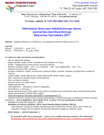 Biuro Turystyczne „Piotrek-tour” Piotr Zubrzycki ul. Stalowa 3/2, 53-425 Wrocław, NIP 894-191-89-29 www.piotrek-tour.pl Nr konta: mBank 36 1140 2004 0000 3602 3231 9368 Informacje dotyczące młodzieżowego obozu narciarsko-snowboardowego Bukowina Tatrzańska 2017 Zbiórka: Godzina 8:00 przy ul. Sztabowej (za budynkiem Szkoły Podstawowej nr 76) I turnus: Odjazd: 12.02.2017 r. godz. 8:15 Powrót: 18.02.2017 r. ok. godz. 20:00 Co zabrać na obóz narciarsko-snowboardowy: dres do spania lub piżamę, długie spodnie, ciepły sweter, kombinezon lub ocieplacz na śnieg, kurtkę - najlepiej przeciwdeszczową i przeciwwietrzną, bieliznę osobistą: majtki – min. 7 szt., skarpetki – min. 7 par, podkoszulki – min. 7 szt., bielizna termiczna mile wskazana, przybory toaletowe: mydło, szczoteczka i pasta do zębów, ręczniki, szampon, grzebień lub szczotka do włosów, ciepłą czapkę, ciepłe rękawiczki, szalik (rękawiczek można zabrać 2 pary), buty zmienne do ośrodka (kapcie lub tenisówki), buty na śnieg na zmianę, krem do twarzy na srogie mrozy, klapki pod prysznic, strój kąpielowy – planujemy wizytę w aquaparku, kieszonkowe z rozwagą ;-) sprzęt narciarski (narty, buty, gogle i kije, które są nieodzownym elementem nauki i doskonalenia jazdy), sprzęt snowboardowy (deska, buty, gogle), - kask obowiązkowo dla grupy narciarskiej i snowboardowej !!! - istnieje możliwość wypożyczenia sprzętu narciarskiego i snowboardowego na miejscu pod okiem naszego instruktora) – jest to dodatkowy koszt około 25 zł za narty i 35 zł za snowboard za dobę, pieniążki na kulig (dla chętnych) – 25 zł, pieniądze na karnety (jeżdżący 350 zł, dzieci bardzo dobrze jeżdżące 380 zł), ceny karnetów zależą od ośrodka narciarskiego jaki wybierzemy na dany dzień, jak również od warunków śniegowych na stokach. Rozliczenie karnetów nastąpi po ostatnim szusie. - dobry humor – zabrać koniecznie :) To oczywiście tylko nasze propozycje – reszta rzeczy według własnego uznania :) Do zobaczenia. Organizator oraz wychowawca nie ponosi odpowiedzialności za rzeczy wartościowe uczestnika.