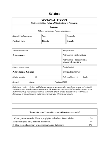 Sylabus WYDZIAŁ FIZYKI Uniwersytet im. Adama Mickiewicza w Poznaniu Instytut Obserwatorium Astronomiczne Stopień/tytuł naukowy Imię Nazwisko Prof. dr hab. Edwin Wnuk Kierunek studiów Specjalności: Astronomia Astronomia z informatyką Astronomia i zastosowania sztucznych satelitów Nazwa przedmiotu Rodzaj zajęć Astronomia Ogólna Wykład kursowy Liczba godzin Semestr 60 zimowy Rok studiów/tryb I rok Punkty ECTS Założenia i cele: Celem wykładu jest zapoznanie studentów z podstawowymi pojęciami i zagadnieniami współczesnej astronomii. W pierwszej części wykład uzupełniony jest o rys historyczny najważniejszych odkryć astronomicznych oraz o podstawowe wiadomości dotyczące promieniowania elektromagnetycznego i teorii grawitacji. Tematyka zajęć (słowa kluczowe)/ Odsetek czasu zajęć 1.Czym jest astronomia. Historia poglądów na budowę Wszechświata. - 2% 2.Najważniejsze fakty z historii astronomii. - 3% 3. Sfera niebieska, układy współrzędnych, czas, kalendarz. - 5% 4.Promieniowanie elektromagnetyczne, podstawowe informacje, rozkład, powstawanie widma i analiza widmowa, własności światła. - 5% 5. Instrumenty astronomiczne: budowa, podstawowe typy, teleskopy naziemne i kosmiczne, odbiorniki promieniowania. - 3% 6. Dynamika Układu Słonecznego, podstawy teorii grawitacji, równania ruchu i orbity ciał niebieskich, ruch keplerowski i perturbowany. - 3% 7. Ziemia i Księżyc. - 10% 8. Fizyka Układu Słonecznego: planety, księżyce, planetoidy, komety, meteoroidy, meteory, meteoryty, misje kosmiczne. - 20% 9. Słońce jako centralne ciało Układu Słonecznego i jako typowa gwiazda: budowa, reakcje termojądrowe, temperatura, skład chemiczny, atmosfera, aktywność słoneczna, związki Słońce-Ziemia. - 10% 10. Gwiazdy: własności fizyczne, podstawowe parametry, podstawowe typy, klasyfikacja harwardzka, diagram H-R, gwiazdy zmienne i wybuchowe. - 15% 11. Układy wielokrotne i gromady gwiazd. - 3% 12. Materia międzygwiazdowa. - 3% 13. Ewolucja gwiazd. - 5% 14. Droga Mleczna – Nasza Galaktyka: budowa, rozkład gwiazd i materii międzygwiazdowej, ruch Słońca w Galaktyce. - 3% 15. Astronomia pozagalaktyczna: typy galaktyk, klasyfikacje, aktywne obiekty pozagalaktyczne, grupy i gromady galaktyk, wyznaczanie odległości do galaktyk, prawo Hubble’a, budowa Wszechświata w wielkich skalach. - 5% 16. Elementy kosmologii: podstawowe pojęcia i zasady, modele kosmologiczne, teoria Wielkiego Wybuchu i ewolucja Wszechświata. Sposoby oceny pracy studenta - 5% Udział w ocenie końcowej ocena ciągła (bieżące przygotowanie do zajęć i aktywność) śródsemestralne kolokwia pisemne/ustne końcowe zaliczenie pisemne/ustne egzamin pisemny egzamin ustny 80% kontrola obecności 20% Praca końcowa semestralna/roczna inne: Literatura obowiązkowa 1. J.M. Kreiner, „Astronomia z Astrofizyką”, PWN, 1992 2. J.M.Kreiner, Ziemia i Wszechświat, Wyd. Nauk. U.P, Kraków, 2009 3. . W.J.Kaufmann, R.A.Freedman, „Universe”, W.H.Freeman and company, New York 4. E.Wnuk, Materiały do wykładu, pliki ppt na CD-ROM Literatura dodatkowa 1.F.H.Shu, „Galaktyki, gwiazdy, życie”, Prószyński i S-ka, 2003 2. http://www.wiw.pl/ - Wirtualny Wszechświat 3. http://bcs.whfreeman.com/universe6e/