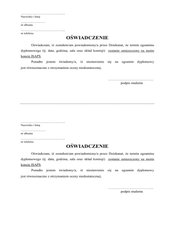 ……………………………….. Nazwisko i Imię ………………… nr albumu ……………………………….. nr telefonu OŚWIADCZENIE Oświadczam, iż zostałem/am powiadomiony/a przez Dziekanat, że termin egzaminu dyplomowego (tj. data, godzina, sala oraz skład komisji) zostanie umieszczony na moim koncie ISAPS. Ponadto jestem świadomy/a, iż niestawienie się na egzamin dyplomowy jest równoznaczne z otrzymaniem oceny niedostatecznej. ………………………………... podpis studenta ……………………………….. Nazwisko i Imię ………………… nr albumu ……………………………….. nr telefonu OŚWIADCZENIE Oświadczam, iż zostałem/am powiadomiony/a przez Dziekanat, że termin egzaminu dyplomowego (tj. data, godzina, sala oraz skład komisji) zostanie umieszczony na moim koncie ISAPS. Ponadto jestem świadomy/a, iż niestawienie się na egzamin dyplomowy jest równoznaczne z otrzymaniem oceny niedostatecznej. ………………………………... podpis studenta