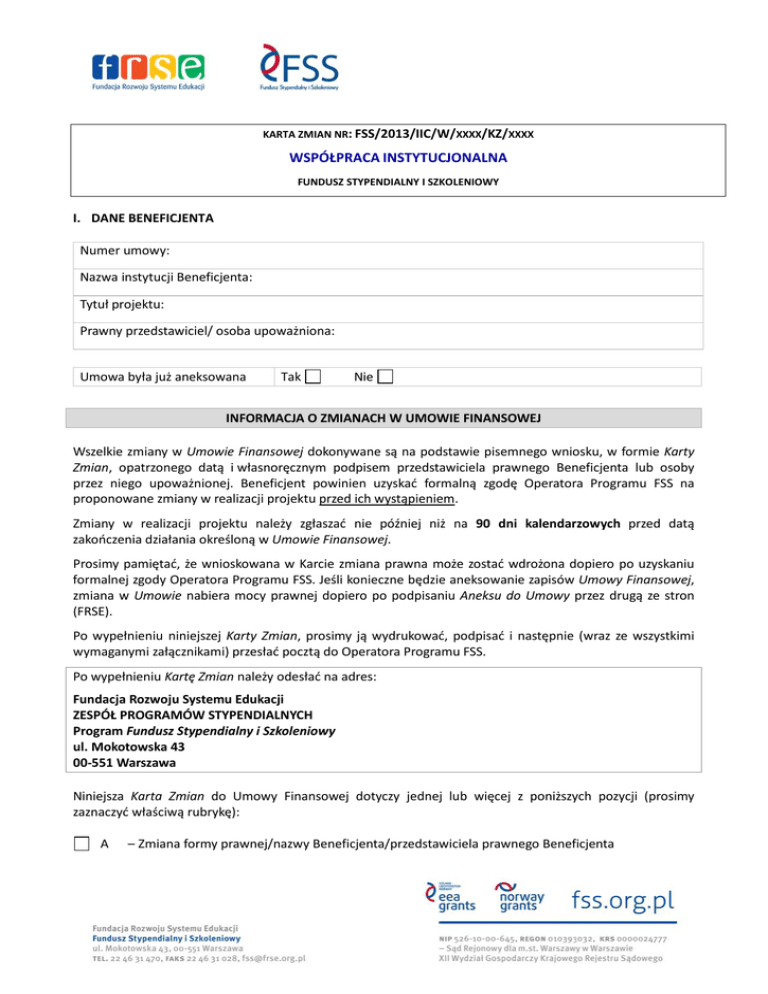 KARTA ZMIAN NR: FSS/2013/IIC/W/XXXX/KZ/XXXX WSPÓŁPRACA INSTYTUCJONALNA FUNDUSZ STYPENDIALNY I SZKOLENIOWY I. DANE BENEFICJENTA Numer umowy: Nazwa instytucji Beneficjenta: Tytuł projektu: Prawny przedstawiciel/ osoba upoważniona: Umowa była już aneksowana Tak Nie INFORMACJA O ZMIANACH W UMOWIE FINANSOWEJ Wszelkie zmiany w Umowie Finansowej dokonywane są na podstawie pisemnego wniosku, w formie Karty Zmian, opatrzonego datą i własnoręcznym podpisem przedstawiciela prawnego Beneficjenta lub osoby przez niego upoważnionej. Beneficjent powinien uzyskać formalną zgodę Operatora Programu FSS na proponowane zmiany w realizacji projektu przed ich wystąpieniem. Zmiany w realizacji projektu należy zgłaszać nie później niż na 90 dni kalendarzowych przed datą zakończenia działania określoną w Umowie Finansowej. Prosimy pamiętać, że wnioskowana w Karcie zmiana prawna może zostać wdrożona dopiero po uzyskaniu formalnej zgody Operatora Programu FSS. Jeśli konieczne będzie aneksowanie zapisów Umowy Finansowej, zmiana w Umowie nabiera mocy prawnej dopiero po podpisaniu Aneksu do Umowy przez drugą ze stron (FRSE). Po wypełnieniu niniejszej Karty Zmian, prosimy ją wydrukować, podpisać i następnie (wraz ze wszystkimi wymaganymi załącznikami) przesłać pocztą do Operatora Programu FSS. Po wypełnieniu Kartę Zmian należy odesłać na adres: Fundacja Rozwoju Systemu Edukacji ZESPÓŁ PROGRAMÓW STYPENDIALNYCH Program Fundusz Stypendialny i Szkoleniowy ul. Mokotowska 43 00-551 Warszawa Niniejsza Karta Zmian do Umowy Finansowej dotyczy jednej lub więcej z poniższych pozycji (prosimy zaznaczyć właściwą rubrykę): A – Zmiana formy prawnej/nazwy Beneficjenta/przedstawiciela prawnego Beneficjenta B C D E F G H – Zmiana rachunku bankowego przeznaczonego na potrzeby realizacji projektu FSS – Zmiana okresu realizacji projektu – Zmiana harmonogramu działań/ mobilności w projekcie – Zmiany w budżecie – Zmiany w planowanych rezultatach projektu – Zmiany dotyczące ekspertów zewnętrznych – Inne A. ZMIANA FORMY PRAWNEJ/NAZWY BENEFICJENTA/PRZEDSTAWICIELA PRAWNEGO Prosimy podać nowe dane Beneficjenta/ przedstawiciela prawnego. Dane Beneficjenta Nazwa urzędowa instytucji Numer NIP Numer REGON Typ instytucji EDU.1 - Nursery school EDU.2 - Primary school EDU.3 - Secondary school (including Vocational / technical) EDU.4 - Higher education institution EDU.5 - Adult or continuing education provider ASS.1 - Non-profit association (regional / national) ASS.2 - Non-profit association (European / international) ASS.3 - Association of Universities RES - Research institute PUB.1 - Public authority (local) PUB.2 - Public authority (regional) PUB.3 - Public authority (national) IND - Private company (manufacturing) SER - Private company (services) OTH - Other type of organisation Adres urzędowy Kod pocztowy Miejscowość Województwo Imię i nazwisko osoby do kontaktu w sprawie projektu Pan □ Pani □ Telefon ++ / Faks ++ / Adres e-mail Strona internetowa instytucji Dane przedstawiciela prawnego (jeśli dotyczy) Nazwa instytucji Numer NIP Numer REGON Adres Kod pocztowy Miejscowość Województwo Imię i nazwisko osoby do kontaktu w sprawie projektu Pan □ Pani □ Telefon ++ / Faks ++ / Adres e-mail Strona internetowa instytucji B. ZMIANA RACHUNKU BANKOWEGO PRZEZNACZONEGO NA POTRZEBY REALIZACJI PROJEKTU FSS Prosimy o podanie nowego numeru konta Beneficjenta wydzielonego na potrzeby projektu, prowadzonego w PLN, na które Operator Programu dokonywać będzie wpłaty środki zgodnie z zapisami Umowy finansowej. Posiadacz rachunku: Nazwa banku: IBAN – pełny numer rachunku Waluta rachunku: PLN UWAGA! Rachunek bankowy, na który przekazywane będą środki z przyznanego dofinansowania FSS, musi być rachunkiem otwartym i prowadzonym w imieniu instytucji Beneficjenta wyłącznie na potrzeby FSS (w żadnym wypadku nie może to być rachunek prywatny) przez instytucję bankową działająca w Polsce. C. ZMIANA OKRESU REALIZACJI PROJEKTU Data rozpoczęcia realizacji projektu według Umowy (rrrr/mm/dd): Data zakończenia realizacji projektu według Umowy (rrrr/mm/dd): Wnioskowana zmiana (w miesiącach) 1 Nowa data rozpoczęcia realizacji projektu (rrrr/mm/dd): Nowa data zakończenia realizacji projektu (rrrr/mm/dd): Prosimy o podanie przyczyn zmiany okresu realizacji projektu [limit znaków: 2000] Pozostała liczba znaków: xxxx/2000 Przypominamy, że rozpoczęcie realizacji projektu może nastąpić najwcześniej 19 listopada 2013 r. lub 27 stycznia 2014 r. Data zakończenia realizacji projektu może nastąpić najwcześniej 6 miesięcy po dacie rozpoczęcia realizacji projektu. W przypadku działania Współpraca Instytucjonalna działania projektowe powinny zakończyć się nie później niż 31/05/2016. Wszelkie działania w projekcie oraz koszty, które będą miały miejsce poza datami wskazanymi w Umowie finansowej i/lub Aneksie/Aneksach zmieniających postanowienia Umowy, zostaną uznane za niekwalifikowalne. 2 Liczba ujemna, jeżeli wymagane jest skrócenie okresu realizacji projektu. D. ZMIANA HARMONOGRAMU DZIAŁAŃ/ MOBILNOŚCI W PROJEKCIE Prosimy przedstawić zmiany w harmonogramie projektu. Jeśli zmiana w harmonogramie skutkuje przesunięciami w budżecie projektu, prosimy pamiętać o wyborze opcji E - Zmiany w budżecie oraz dokonaniu korekty w tabeli budżetowej w części E. Zmiana nr 1 Zmiana dotyczy działania/mobilności Przewidywana data rozpoczęcia działania/mobilności po proponowanej zmianie Prosimy podać krótki opis działania [limit: 250 znaków] Przewidywana data zakończenia działania/mobilności po proponowanej zmianie Opis działań / mobilności Prosimy podać przyczynę wprowadzania zmiany w harmonogramie projektu. Prosimy podać krótki opis działania/ mobilności uwzględniający proponowane zmiany. [limit: 2000 znaków] Pozostała liczba znaków: xxxx/2000 Zaangażowane instytucje (w tym partnerzy) i ich rola w realizacji dzia