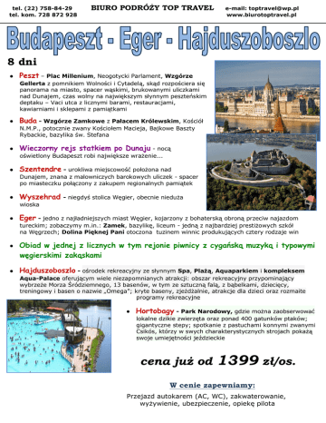 tel. (22) 758-84-29 tel. kom. 728 872 928 BIURO PODRÓŻY TOP TRAVEL e-mail: [email protected] www.biurotoptravel.pl 8 dni Peszt – Plac Millenium, Neogotycki Parlament, Wzgórze Gellerta z pomnikiem Wolności i Cytadelą, skąd rozpościera się panorama na miasto, spacer wąskimi, brukowanymi uliczkami nad Dunajem, czas wolny na największym słynnym peszteńskim deptaku – Vaci utca z licznymi barami, restauracjami, kawiarniami i sklepami z pamiątkami Buda - Wzgórze Zamkowe z Pałacem Królewskim, Kościół N.M.P., potocznie zwany Kościołem Macieja, Bajkowe Baszty Rybackie, bazylika św. Stefana Wieczorny rejs statkiem po Dunaju - nocą oświetlony Budapeszt robi największe wrażenie... Szentendre - urokliwa miejscowość położona nad Dunajem, znana z malowniczych barokowych uliczek - spacer po miasteczku połączony z zakupem regionalnych pamiątek Wyszehrad - niegdyś stolica Węgier, obecnie nieduża wioska Eger - jedno z najładniejszych miast Węgier, kojarzony z bohaterską obroną przeciw najazdom tureckim; zobaczymy m.in.: Zamek, bazylikę, liceum - jedną z najbardziej prestiżowych szkół na Węgrzech; Dolina Pięknej Pani otoczona tuzinem winnic produkujących cztery rodzaje win Obiad w jednej z licznych w tym rejonie piwnicy z cygańską muzyką i typowymi węgierskimi zakąskami Hajduszoboszlo - ośrodek rekreacyjny ze słynnym Spa, Plażą, Aquaparkiem i kompleksem Aqua-Palace oferującym wiele niezapomnianych atrakcji: obszar rekreacyjny przypominający wybrzeże Morza Śródziemnego, 13 basenów, w tym ze sztuczną falą, z bąbelkami, dziecięcy, treningowy i basen o nazwie „Omega”; kryte baseny, zjeżdżalnie, atrakcje dla dzieci oraz rozmaite programy rekreacyjne Hortobagy - Park Narodowy, gdzie można zaobserwować lokalne dzikie zwierzęta oraz ponad 400 gatunków ptaków; gigantyczne stepy; spotkanie z pastuchami konnymi zwanymi Csikós, którzy w swych charakterystycznych strojach pokażą swoje umiejętności jeździeckie cena już od 1399 zł/os. W cenie zapewniamy: Przejazd autokarem (AC, WC), zakwaterowanie, wyżywienie, ubezpieczenie, opiekę pilota