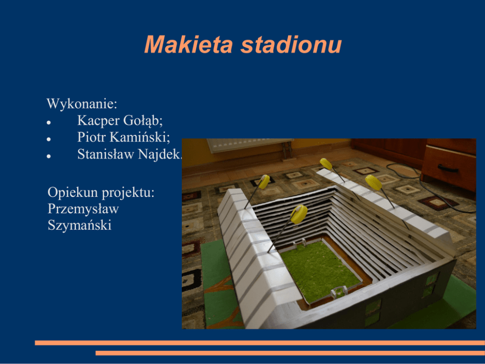 Makieta stadionu Wykonanie: Kacper Gołąb; Piotr Kamiński; Stanisław Najdek. Opiekun projektu: Przemysław Szymański Uznaliśmy, iż najodpowiedniejszy kształt naszego stadionu to prostokąt. Makieta została wykonana na kartonowej podstawie, na której jako pierwsze stanęły dźwigary wykonane z cieńszego kartonu. Początkowo było ich 6, lecz w dalszym etapie budowy okazało się, że nie zapewnia to odpowiedniej stabilności. Następnym krokiem było wykonanie trybun. Zostały one wykonane z tego samego kartonu, co dźwigary, a następnie oklejone kartkami. Był to najbardziej czasochłonny proces. Następnym krokiem było wykonanie ścian i dachu. Uznaliśmy, iż najodpowiedniejszym kolorem dla naszego stadionu będzie szary, natomiast dla dachu – biały. Pomalowaliśmy także podstawę i strefę wokół boiska. Ostatnim elementem do wykonania było oświetlenie. Zrobiliśmy je z nakrętek od napojów i długich patyczków. W ten sposób zakończyliśmy proces powstawania naszej makiety. Koszty jej wykonania zamknęły się w 50 złotych. Ten projekt nauczył nas wielu rzeczy. Przede wszystkim poprawił u nas zdolność pracy w grupie. Wielokrotnie występowały u nas odmienne poglądy związane z makietą, lecz potrafiliśmy się w tych sytuacjach porozumieć. Z początku mieliśmy także problem z organizacją czasu, lecz dobraliśmy terminy spotkań, które wszystkim odpowiadały. Najważniejsze jest jednak, że poprawiło to nasze relacje – nauczyliśmy się słuchać siebie nawzajem.