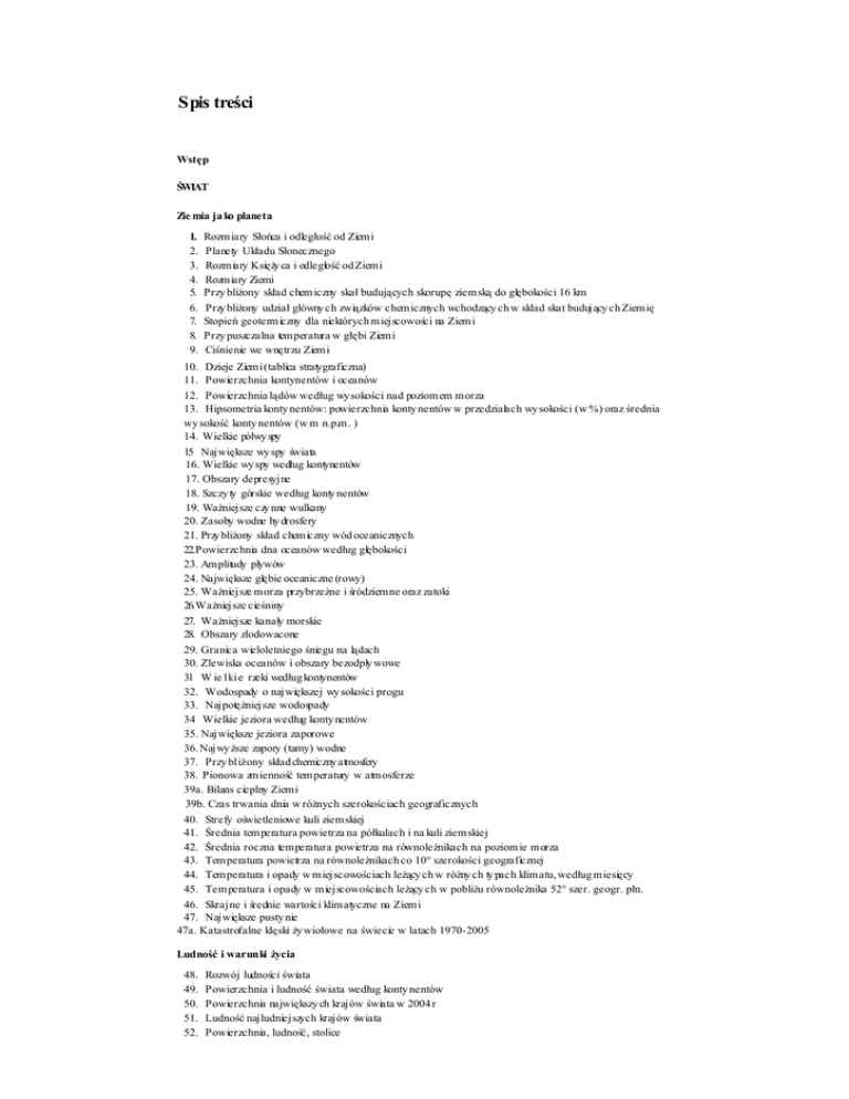 Spis treści Wstęp ŚWIAT Zie mia ja ko planeta 1. 2. 3. 4. 5. 6. 7. 8. 9. Rozmiary Słońca i odległość od Ziemi Planety Układu Słonecznego Rozmiary KsięŜy ca i odległość od Ziemi Rozmiary Ziemi Przy bliŜony skład chemiczny skał budujących skorupę ziemską do głębokości 16 km Przy bliŜony udział główny ch związków chemicznych wchodzący ch w sklad skat budujący ch Ziemię Stopień geotermiczny dla niektórych miejscowości na Ziemi Przy puszczalna temperatura w głębi Ziemi Ciśnienie we wnętrzu Ziemi 10. Dzieje Ziemi (tablica stratygraficzna) 11. Powierzchnia kontynentów i oceanów 12. Powierzchnia lądów według wy sokości nad poziomem morza 13. Hipsometria konty nentów: powierzchnia konty nentów w przedziałach wy sokości (w %) oraz średnia wy sokość konty nentów (w m n.p.m. ) 14. Wielkie półwy spy 15 Największe wy spy świata 16. Wielkie wy spy według kontynentów 17. Obszary depresyjne 18. Szczy ty górskie według konty nentów 19. WaŜniejsze czy nne wulkany 20. Zasoby wodne hy drosfery 21. Przy bliŜony skład chemiczny wód oceanicznych 22.Powierzchnia dna oceanów według głębokości 23. Amplitudy pływów 24. Największe głębie oceaniczne (rowy) 25. WaŜniejsze morza przybrzeŜne i śródziemne oraz zatoki 26.WaŜniejsze cieśniny 27. WaŜniejsze kanały morskie 28. Obszary zlodowacone 29. Granica wieloletniego śniegu na lądach 30. Zlewiska oceanów i obszary bezodpły wowe 31 W ie lkie rzeki według kontynentów 32. Wodospady o największej wy sokości progu 33. NajpotęŜniejsze wodospady 34 Wielkie jeziora według konty nentów 35. Największe jeziora zaporowe 36. Najwy Ŝsze zapory (tamy) wodne 37. Przy bliŜony skład chemiczny atmosfery 38. Pionowa zmienność temperatury w atmosferze 39a. Bilans cieplny Ziemi 39b. Czas trwania dnia w róŜnych szerokościach geograficznych 40. Strefy oświetleniowe kuli ziemskiej 41. Średnia temperatura powietrza na półkulach i na kuli ziemskiej 42. Średnia roczna temperatura powietrza na równoleŜnikach na poziomie morza 43. Temperatura powietrza na równoleŜnikach co 10° szerokości geograficznej 44. Temperatura i opady w miejscowościach leŜący ch w róŜny ch ty pach klimatu, według miesięcy 45. Temperatura i opady w miejscowościach leŜący ch w pobliŜu równoleŜnika 52° szer. geogr. płn. 46. Skrajne i średnie wartości klimatyczne na Ziemi 47. Największe pusty nie 47a. Katastrofalne klęski Ŝy wiołowe na świecie w latach 1970-2005 Ludność i warunki Ŝycia 48. 49. 50. 51. 52. Rozwój ludności świata Powierzchnia i ludność świata według konty nentów Powierzchnia największy ch krajów świata w 2004 r Ludność najludniejszych krajów świata Powierzchnia, ludność, stolice 53. Wielkie miasta świata 54a. Ludność miejska w niektórych krajach 54b. Przeciętna długość Ŝy cia w niektórych krajach 55. WaŜniejsze języ ki według liczby ludności posługującej się danym języ kiem 56. Główne religie według liczby wy znawców 57. Urodzenia, zgony i przy rost naturalny w niektórych krajach na 1000 ludności 58. 59. 60. 61. Ludność według wieku Zatrudnienie według sektorów gospodarki narodowej w % pracujący ch ogółem w 2003 r Bezrobotni Analfabeci 62. Studenci szkół wy Ŝszych 63. Mieszkania 64. Lekarze 65. 66. 67. 68. 69. ŁóŜka w szpitalach Telefony Telewizory Komputery osobiste i uŜy tkownicy internetu Samochody osobowe w uŜy tkowaniu 70. Tury sty ka zagraniczna 71. SpoŜy cie niektórych arty kułów na 1 mieszkańca w wy branych krajach 72a. Emisja przemy słowych zanieczy szczeń powietrza w niektórych krajach 72b. Stan czy stości wy brany ch rzek 73. Ludność korzy stająca z komunalnych oczy szczalni ścieków 74. Stan lasów 75. Odpady komunalne wy tworzone 76. Obszary chronionej przyrody 77. Produkt krajowy brutto według pary tetu siły naby wczej walut na 1 mieszkańca (ceny bieŜące) 78. Produkt krajowy brutto na 1 mieszkańca (ceny bieŜące) 79. Struktura wartości dodanej brutto według rodzajów działalności w % 80. Zagraniczne długi państwowe Przemysł 81. 82. 83. 84. 85. 86. 87. 88. 89. 90. 91. 92. 93. 94. 95. 96. 97. 98. 99. Wy dobycie węgla kamiennego Wy doby cie węgla brunatnego Wy dobycie ropy naftowej Produkcja surowców energety czny ch Wy doby cie gazu ziemnego Produkcja energii elektry cznej Produkcja energii elektry cznej według rodzajów elektrowni w wybranych krajach Największe elektrownie wodne Wy dobycie rud Ŝelaza Produkcji stali surowej Wy doby cie rud manganu w przeliczeniu na czy sty składnik Wy doby cie rud chromu w przeliczeniu na czy sty składnik Wy doby cie rud molibdenu w przeliczeniu na czy sty składnik Wy doby cie rud wolframu w przeliczeniu na czy sty składnik Wy dobycie rud kobaltu w przeliczeniu na czy sty składnik Wy doby cie rud uranu w przeliczeniu na czy sty składnik Wy dobycie rud niklu w przeliczeniu na czy sty składnik Wy doby cie rud miedzi w przeliczeniu na czy sty składnik Produkcja miedzi rafinowanej 100. Produkcja cy nku 101. Produkcja ołowiu 102. Wy doby cie rud cy ny (zawartość metalu w rudach i koncentratach) 103. Wy dobycie boksy tów 104. Produkcja aluminium 105. Wy dobycie złota w przeliczeniu na czy sty składnik 106. Wy dobycie srebra 107. Wy dobycie rud rtęci 108. Wy dobycie diamentów 108a. Wy dobycie platy ny 109. Produkcja samochodów cięŜarowych 110. Produkcja samochodów osobowych 111 a. Produkcja rowerów 111 b. Produkcja chłodziarek i zamraŜarek domowych 111 с. Produkcja pralek domowych 112. Statki wodowane 113. Produkcja odbiorników radiowy ch 114. Produkcja odbiorników telewizyjnych 115. Produkcja siarki rodzimej 116. Produkcja kwasu siarkowego w przeliczeniu na 100% 117. Wy dobycie soli kamiennej, potasowej i fosfory tów w przeliczeniu na czy sty składnik 118. Produkcja nawozów mineralnych w przeliczeniu na czy sty składnik 119. Produkcja włókien chemiczny ch 120. 121. 122. 123. 124. 125. 126. 127. 128. 129. Produkcja c