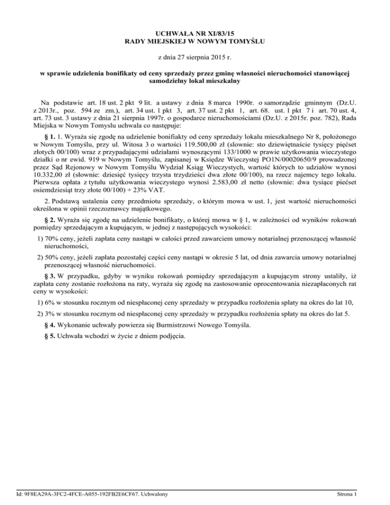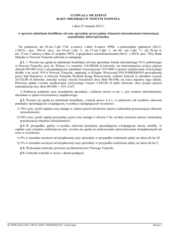 UCHWAŁA NR XI/83/15 RADY MIEJSKIEJ W NOWYM TOMYŚLU z dnia 27 sierpnia 2015 r. w sprawie udzielenia bonifikaty od ceny sprzedaży przez gminę własności nieruchomości stanowiącej samodzielny lokal mieszkalny Na podstawie art. 18 ust. 2 pkt 9 lit. a ustawy z dnia 8 marca 1990r. o samorządzie gminnym (Dz.U. z 2013r., poz. 594 ze zm.), art. 34 ust. 1 pkt 3, art. 37 ust. 2 pkt 1, art. 68. ust. 1 pkt 7 i art. 70 ust. 4, art. 73 ust. 3 ustawy z dnia 21 sierpnia 1997r. o gospodarce nieruchomościami (Dz.U. z 2015r. poz. 782), Rada Miejska w Nowym Tomyslu uchwala co następuje: § 1. 1. Wyraża się zgodę na udzielenie bonifiakty od ceny sprzedaży lokalu mieszkalnego Nr 8, położonego w Nowym Tomyślu, przy ul. Witosa 3 o wartości 119.500,00 zł (slownie: sto dziewiętnaście tysięcy pięćset złotych 00/100) wraz z przypadającymi udziałami wynoszącymi 133/1000 w prawie użytkowania wieczystego działki o nr ewid. 919 w Nowym Tomyślu, zapisanej w Księdze Wieczystej PO1N/00020650/9 prowadzonej przez Sąd Rejonowy w Nowym Tomyślu Wydział Ksiąg Wieczystych, wartość których to udziałów wynosi 10.332,00 zł (słownie: dziesięć tysięcy trzysta trzydzieści dwa złote 00/100), na rzecz najemcy tego lokalu. Pierwsza opłata z tytułu użytkowania wieczystego wynosi 2.583,00 zł netto (słownie: dwa tysiące piećset osiemdziesiąt trzy złote 00/100) + 23% VAT. 2. Podstawą ustalenia ceny przedmiotu sprzedaży, o którym mowa w ust. 1, jest wartość nieruchomości określona w opinii rzeczoznawcy majątkowego. § 2. Wyraża się zgodę na udzielenie bonifikaty, o której mowa w § 1, w zależności od wyników rokowań pomiędzy sprzedającym a kupującym, w jednej z następujących wysokości: 1) 70% ceny, jeżeli zapłata ceny nastąpi w całości przed zawarciem umowy notarialnej przenoszącej własność nieruchomości, 2) 50% ceny, jeżeli zapłata pozostałej części ceny nastąpi w okresie 5 lat, od dnia zawarcia umowy notarialnej przenoszącej własność nieruchomości. § 3. W przypadku, gdyby w wyniku rokowań pomiędzy sprzedającym a kupującym strony ustaliły, iż zapłata ceny zostanie rozłożona na raty, wyraża się zgodę na zastosowanie oprocentowania niezapłaconych rat ceny w wysokości: 1) 6% w stosunku rocznym od niespłaconej ceny sprzedaży w przypadku rozłożenia splaty na okres do lat 10, 2) 3% w stosunku rocznym od niespłaconej ceny sprzedaży w przypadku rozłożenia spłaty na okres do lat 5. § 4. Wykonanie uchwały powierza się Burmistrzowi Nowego Tomyśla. § 5. Uchwała wchodzi w życie z dniem podjęcia. Id: 9F8EA29A-3FC2-4FCE-A055-192FB2E6CF67. Uchwalony Strona 1 UZASADNIENIE do uchwały Nr XI/83/15 Rady Miejskiej w Nowym Tomyślu z dnia 27 sierpnia 2015r. w sprawie udzielenia bonifikaty od ceny sprzedaży przez gminę własności nieruchomości stanowiącej samodzielny lokal mieszkalny sprzedawanej w drodze bezprzedatrgowej. Zgodnie z art. 68 ust. 1 pkt 7) ustawy z dnia 21 sierpnia 1997r. o gospodarce nieruchomościami, burmistrz może za zgodą Rady miejskiej udzielić bonifikaty od ceny sprzedaży lokalu mieszkalnego, sprzedawanego jego najemcy. Z kolei art. 70 ust. 4 tejże ustawy uprawnia Radę do wyrażenia zgody na zastosowanie innej niż określona w tej ustawie stopy procentowej rozłożonej na raty cześci ceny sprzedaży nieruchomości zbywanej w tym trybie. Z wnioskiem o wykup lokalu zwrócił się jego najemca. Wartość lokalu oraz udziału w prawie własności gruntu została określona w operacie szacunkowym przez rzeczoznawcę majątkowego. Niniejsza uchwała pozwala Burmistrzowi - w drodze rokowań ustalić z kupującym lokal jego najemcą, wysokość bonifikaty od ceny lokalu ustalonej wedlug jego wartości oraz określić warunku zapłaty jego ceny. Mając na uwadze powyższefakty podjęcie niniejszej uchwały jest zasadne. Id: 9F8EA29A-3FC2-4FCE-A055-192FB2E6CF67. Uchwalony Strona 1