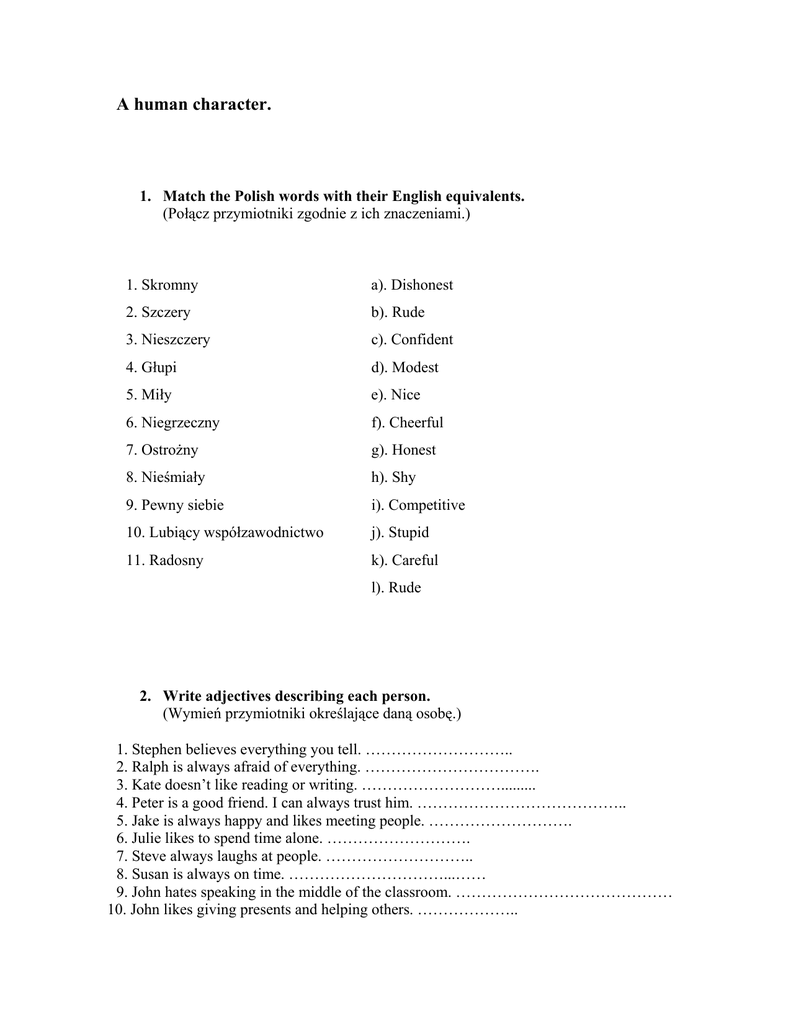 A human character. 1. Match the Polish words with their English equivalents. (Połącz przymiotniki zgodnie z ich znaczeniami.) 1. Skromny a). Dishonest 2. Szczery b). Rude 3. Nieszczery c). Confident 4. Głupi d). Modest 5. Miły e). Nice 6. Niegrzeczny f). Cheerful 7. Ostrożny g). Honest 8. Nieśmiały h). Shy 9. Pewny siebie i). Competitive 10. Lubiący współzawodnictwo j). Stupid 11. Radosny k). Careful l). Rude 2. Write adjectives describing each person. (Wymień przymiotniki określające daną osobę.) 1. Stephen believes everything you tell. ……………………….. 2. Ralph is always afraid of everything. ……………………………. 3. Kate doesn’t like reading or writing. ………………………......... 4. Peter is a good friend. I can always trust him. ………………………………….. 5. Jake is always happy and likes meeting people. ………………………. 6. Julie likes to spend time alone. ………………………. 7. Steve always laughs at people. ……………………….. 8. Susan is always on time. …………………………...…… 9. John hates speaking in the middle of the classroom. …………………………………… 10. John likes giving presents and helping others. ……………….. 3. Cross out a word which does not complete the sentence properly. (Wykreśl wyraz, który nie uzupełnia poprawnie zdania.) 1. When you are pleased, you feel ... delighted, happy , glad, anxious 2. When you are angry, you feel ... mad, furious, cross, nervous 3. When you are sad, you feel ... miserable, devastated, excited, depressed 4. When you are worried, you are ... frightened, nervous, afraid, fed up 5. When you are shy, you feel ... embarrassed, tongue-tied, disgusted, timid 4. Choose a correct preposition. (Wybierz odpowiedni przyimek.) 1. Ellyn is afraid about/of flying. 2. I am keen on/with grammar. 3. Amy is excited about/with going to Italy. 4. Jane is fed up on/with going to school. 5. Mark is bad in/at chemistry. 6. John is pleased of/with the result of his test. 7. Tony is fond about/of fishing. 8. Roll up/off your sleeves and get to work. 5. Match the questions 1-5 to the answers a-g. Two answers do not match. (Dopasuj pytania 1-5 do odpowiedzi a-g. Dwie odpowiedzi są podane dodatkowo.) 1. Do you know him? What is he like? a). It’s Josh. 2. You know Josh. What does he like? b). Don’t worry. 3. Who is that guy over there standing near Andy? c). He is a real chocolate addict. He loves hot chocolate. 4. Who is she coming to the meeting with? d). It’s Tom. He is very responsible, isn’t he? 5. What do you think about Josh and Merry? e). I think he likes her very much. f). In my opinion they love. g). Josh. He is her boyfriend.