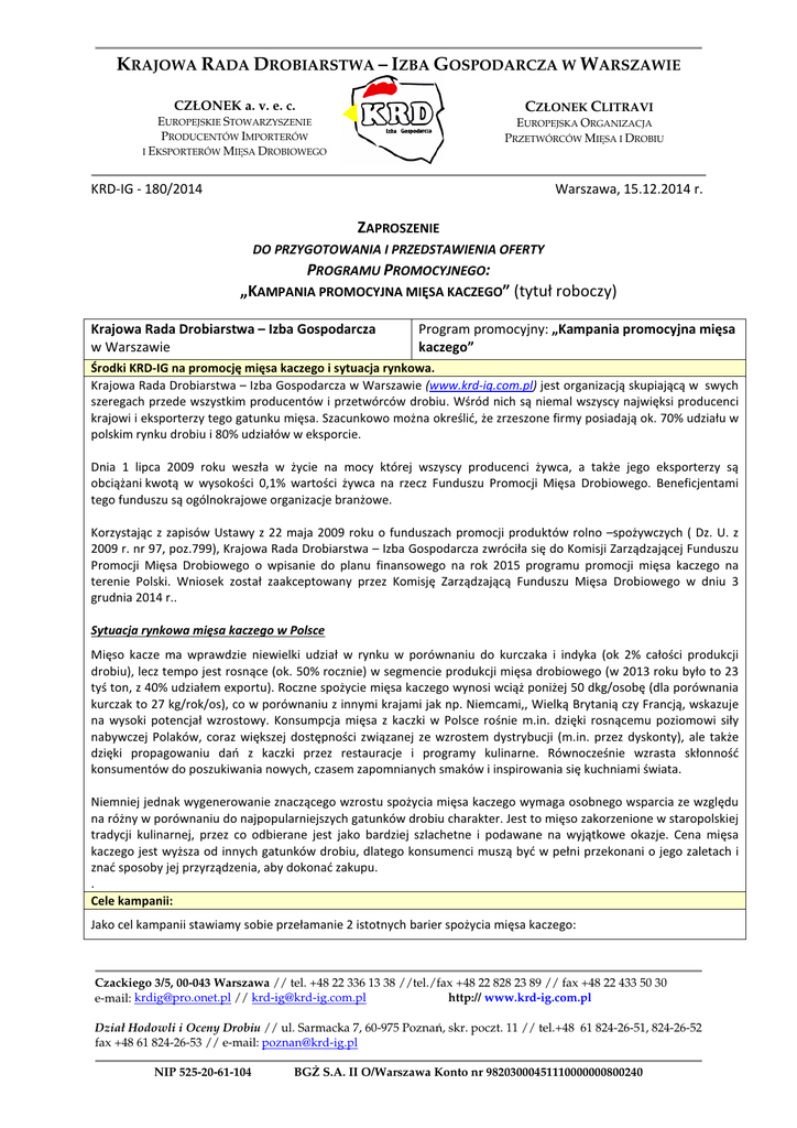 KRAJOWA RADA DROBIARSTWA – IZBA GOSPODARCZA W WARSZAWIE CZŁONEK a. v. e. c. CZŁONEK CLITRAVI EUROPEJSKA ORGANIZACJA PRZETWÓRCÓW MIĘSA I DROBIU EUROPEJSKIE STOWARZYSZENIE PRODUCENTÓW IMPORTERÓW I EKSPORTERÓW MIĘSA DROBIOWEGO KRD-IG - 180/2014 Warszawa, 15.12.2014 r. ZAPROSZENIE DO PRZYGOTOWANIA I PRZEDSTAWIENIA OFERTY PROGRAMU PROMOCYJNEGO: „KAMPANIA PROMOCYJNA MIĘSA KACZEGO” (tytuł roboczy) Krajowa Rada Drobiarstwa – Izba Gospodarcza w Warszawie Program promocyjny: „Kampania promocyjna mięsa kaczego” Środki KRD-IG na promocję mięsa kaczego i sytuacja rynkowa. Krajowa Rada Drobiarstwa – Izba Gospodarcza w Warszawie (www.krd-ig.com.pl) jest organizacją skupiającą w swych szeregach przede wszystkim producentów i przetwórców drobiu. Wśród nich są niemal wszyscy najwięksi producenci krajowi i eksporterzy tego gatunku mięsa. Szacunkowo można określić, że zrzeszone firmy posiadają ok. 70% udziału w polskim rynku drobiu i 80% udziałów w eksporcie. Dnia 1 lipca 2009 roku weszła w życie na mocy której wszyscy producenci żywca, a także jego eksporterzy są obciążani kwotą w wysokości 0,1% wartości żywca na rzecz Funduszu Promocji Mięsa Drobiowego. Beneficjentami tego funduszu są ogólnokrajowe organizacje branżowe. Korzystając z zapisów Ustawy z 22 maja 2009 roku o funduszach promocji produktów rolno –spożywczych ( Dz. U. z 2009 r. nr 97, poz.799), Krajowa Rada Drobiarstwa – Izba Gospodarcza zwróciła się do Komisji Zarządzającej Funduszu Promocji Mięsa Drobiowego o wpisanie do planu finansowego na rok 2015 programu promocji mięsa kaczego na terenie Polski. Wniosek został zaakceptowany przez Komisję Zarządzającą Funduszu Mięsa Drobiowego w dniu 3 grudnia 2014 r.. Sytuacja rynkowa mięsa kaczego w Polsce Mięso kacze ma wprawdzie niewielki udział w rynku w porównaniu do kurczaka i indyka (ok 2% całości produkcji drobiu), lecz tempo jest rosnące (ok. 50% rocznie) w segmencie produkcji mięsa drobiowego (w 2013 roku było to 23 tyś ton, z 40% udziałem exportu). Roczne spożycie mięsa kaczego wynosi wciąż poniżej 50 dkg/osobę (dla porównania kurczak to 27 kg/rok/os), co w porównaniu z innymi krajami jak np. Niemcami,, Wielką Brytanią czy Francją, wskazuje na wysoki potencjał wzrostowy. Konsumpcja mięsa z kaczki w Polsce rośnie m.in. dzięki rosnącemu poziomowi siły nabywczej Polaków, coraz większej dostępności związanej ze wzrostem dystrybucji (m.in. przez dyskonty), ale także dzięki propagowaniu dań z kaczki przez restauracje i programy kulinarne. Równocześnie wzrasta skłonność konsumentów do poszukiwania nowych, czasem zapomnianych smaków i inspirowania się kuchniami świata. Niemniej jednak wygenerowanie znaczącego wzrostu spożycia mięsa kaczego wymaga osobnego wsparcia ze względu na różny w porównaniu do najpopularniejszych gatunków drobiu charakter. Jest to mięso zakorzenione w staropolskiej tradycji kulinarnej, przez co odbierane jest jako bardziej szlachetne i podawane na wyjątkowe okazje. Cena mięsa kaczego jest wyższa od innych gatunków drobiu, dlatego konsumenci muszą być w pełni przekonani o jego zaletach i znać sposoby jej przyrządzenia, aby dokonać zakupu. . Cele kampanii: Jako cel kampanii stawiamy sobie przełamanie 2 istotnych barier spożycia mięsa kaczego: Czackiego 3/5, 00-043 Warszawa // tel. +48 22 336 13 38 //tel./fax +48 22 828 23 89 // fax +48 22 433 50 30 http:// www.krd-ig.com.pl e-mail: [email protected] // [email protected] Dział Hodowli i Oceny Drobiu // ul. Sarmacka 7, 60-975 Poznań, skr. poczt. 11 // tel.+48 61 824-26-51, 824-26-52 fax +48 61 824-26-53 // e-mail: [email protected] NIP 525-20-61-104 BGŻ S.A. II O/Warszawa Konto nr 98203000451110000000800240 - wciąż niska popularność w handlu jak i wśród konsumentów, prowadząca do ograniczonej dostępności i braku świadomości konsumentów związanej z mięsem kaczym, co skutkuje wyłączeniem go z listy produktów rozważanych do zakupu; - brak wiedzy na temat sposobu przyrządzania i walorów smakowych kaczki. Istotnym celem kampanii jest zbudowanie wizerunku mięsa kaczego w oparciu o unikalny smak i staropolską tradycję, wiążącą się z serwowaniem mięsa kaczego na specjalne okazje, święta, uroczystości rodzinne. Taki obraz kaczki usprawiedliwi wysoką w porównaniu do innych rodzajów drobiu cenę. Główne akcenty kampanii: - smak i szlachetność mięsa - edukacja w zakresie przyrządzania. Aby uwiarygodnić przekaz rozważamy wykorzystanie wizerunku osoby uważanej za autorytet w kwestii walorów smakowych produktu, a także kucharza do pokazów dla prasy i działań w Sejmie. Założenia kampanii: Biorąc pod uwagę niszowy charakter mięsa kaczego rekomendujemy dobór mediów pod kątem możliwości zbudowania świadomości i wizerunku w grupie docelowej: ludzi lepiej sytuowanych, ciekawych świata, otwartych na nowe doznania smakowe i kulinarne. • Kampania prasowa wraz z akcją PR (lunch prasowy, publikacje). Prasa to medium ważne w kampanii, gdyż najlepiej sprawdza się jako nośnik w edukacji kulinarnej. Umożliwia budowanie wizerunku korespondującego z wiarygodnością przekazu. Jednocześnie inwestycje w prasie ułatwią i podniosą skuteczność wsparcia PR, Koszt dotarcia powinien zostać obniżony poprzez zakup pakietów danego wydawnictwa oraz wykorzystanie stron redakcyjnych do promocji produktu (rekomendowane dopasowanie materiałów promocyjnych do treści redakcyjnej i specyfikacji każdego z tytułów). Uwiarygodnieniem przekazu będzie lunch prasowy dla dziennikarzy i liderów opinii, dotyczący walorów mięsa kaczego razem z pokazem kulinarnym i degustacją dan z kaczki. Plan prasowy powinien zapewnić maksymalizację zasięgów 2+ i 3+ w grupie docelowej. • Działania Internetowe – blogosfera i dedykowana strona Internetowa: rosnąca wciąż popularność blogów kulinarnych oraz sięganie konsumentów po internet jako źródło