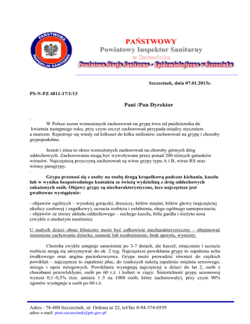PAŃSTWOWY Powiatowy Inspektor Sanitarny w Szczecinku Szczecinek, dnia 07.01.2013r. PS-N-PZ 4811-17/1/13 Pani /Pan Dyrektor . W Polsce sezon wzmoŜonych zachorowań na grypę trwa od października do kwietnia następnego roku, przy czym szczyt zachorowań przypada między styczniem a marcem. Rejestruje się wtedy od kilkuset do kilku milionów zachorowań na grypę i choroby grypopodobne. Jesień i zima to okres wzmoŜonych zachorowań na choroby górnych dróg oddechowych. Zachorowania mogą być wywoływane przez ponad 200 róŜnych gatunków wirusów. Najczęstszą przyczyną zachorowań są wirus grypy typu A i B, wirus RS oraz wirusy paragrypy. . Grypa przenosi się z osoby na osobę drogą kropelkową podczas kichania, kaszlu lub w wyniku bezpośredniego kontaktu ze świeŜą wydzieliną z dróg oddechowych zakaŜonych osób. Objawy grypy są niecharakterystyczne, lecz najczęstsze jest gwałtowne wystąpienie: - objawów ogólnych – wysokiej gorączki, dreszczy, bólów mięśni, bólów głowy (najczęściej okolicy czołowej i zagałkowy), uczucia rozbicia i osłabienia, złego ogólnego samopoczucia; - objawów ze strony układu oddechowego – suchego kaszlu, bólu gardła i nieŜytu nosa (zwykle o nieduŜym nasileniu). U małych dzieci obraz kliniczny moŜe być całkowicie niecharakterystyczny – obejmować zmienione zachowanie dziecka, senność lub rozdraŜnienie, brak apetytu, wymioty. Choroba zwykle ustępuje samoistnie po 3-7 dniach, ale kaszel, zmęczenie i uczucie rozbicia mogą się utrzymywać do ok. 2 tyg. Najczęstsze powikłania grypy to zapalenia ucha środkowego oraz angina paciorkowcowa. Grypa moŜe prowadzić równieŜ do cięŜkich powikłań – najczęstsze to zapalenie płuc, do rzadszych naleŜą zapalenie mięśnia sercowego, mózgu i opon mózgowych. Powikłania występują najczęściej u dzieci do lat 2, osób z chorobami przewlekłymi, osób po 60 r.Ŝ. i kobiet w ciąŜy. Śmiertelność grypy sezonowej wynosi 0,1–0,5% (tzn. umiera 1–5 na 1000 osób, które zachorowały), przy czym 90% zgonów występuje u osób po 60 r.Ŝ. Adres : 78-400 Szczecinek, ul. Ordona nr 22, tel/fax 0-94-374-0559 adres e-mail: [email protected] Tak jak w przypadku innych chorób wywoływanych przez wirusy antybiotyki są nieskuteczne i leczenie jest głównie objawowe. Zaleca się pozostanie w domu i odpoczynek, picie duŜej ilości płynów, stosowanie niesterydowych środków przeciwzapalnych. U małych dzieci niezwykle istotne jest nawadnianie i obniŜanie gorączki, która moŜe doprowadzić do wystąpienia drgawek gorączkowych. W przypadku osób naleŜących do grup ryzyka lekarz moŜe zadecydować o zastosowaniu leków antywirusowych. NaleŜy jednak podkreślić, iŜ najskuteczniejszą metodą uniknięcia zachorowania i związanych z nim powikłań jest profilaktyka pod postacią corocznego szczepienia poprzedzającego sezon zachorowań na grypę. W Polsce dostępne są (na receptę) szczepionki przeciwko grypie produkowane przez kilka firm. Ich skład jest zgodny z zaleceniami Światowej Organizacji Zdrowia i obejmuje 3 szczepy wirusa, krąŜące w danym sezonie. Osoby, u których występuje jeden lub więcej z poniŜszych objawów takich jak gorączka, bóle głowy, bóle mięśni, ból gardła, katar, dreszcze, poczucie ogólnego rozbicia – mogą być chore na grypę. W celu zapobieŜenia zachorowaniu i dalszemu szerzeniu się grypy sezonowej zaleca się: 1. Regularne, coroczne szczepienie przeciwko grypie. 2. Regularne mycie rąk. Częste mycie rąk wodą i mydłem, a w przypadku, gdy nie jest to moŜliwe środkiem dezynfekującymi na bazie alkoholu, zmniejsza ryzyko zakaŜenia. 3. Unikanie bliskiego kontaktu z osobami chorymi. 4. W przypadku wystąpienia objawów grypowych pozostanie w domu, a gdy konieczne jest przebywania poza domem – unikanie tłumu i masowych zgromadzeń. 5. Zakrywanie ust i nosa podczas kaszlu oraz kichania, najlepiej przy pomocy chusteczki, ewentualnie rękoma, które następnie naleŜy umyć wodą i mydłem lub środkiem dezynfekującym na bazie alkoholu. Państwowa Inspekcja Sanitarna w Szczecinku PRZYPOMINA ! Nie lekcewaŜ grypy – chroń siebie i innych – przy wystąpieniu objawów takich jak gorączka, bóle głowy, bóle mięśniowo – stawowe, kaszel, ból gardła zostań w domu, w przypadku nasilenia objawów – zwłaszcza wystąpienia duszności – niezwłocznie skontaktuj się z lekarzem. Z powaŜaniem Państwowy Powiatowy Inspektor Sanitarny w Szczecinku mgr Barbara Szysz Adres : 78-400 Szczecinek, ul. Ordona nr 22, tel/fax 0-94-374-0559 adres e-mail: [email protected]