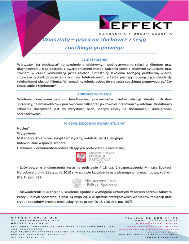 Warsztaty – praca na słuchawce z sesją coachingu grupowego CELE SZKOLENIA Warsztaty a słu haw e to szkole ie o efektyw y podtrzy ywa iu rela ji z klie te oraz diag ozowa iu jego potrze , z uwzględ ie ie etod radze ia so ie z trud y i sytua ja i oraz stresem w czasie komunikacji przez telefon. U zest i y szkole ia zdo ędą prakty z ą wiedzę z zakresu te h ik prowadze ia roz ów telefo i z y h, a także poz ają o owiązują e sta dardy telefo i z ej o sługi Klie ta. W ra a h szkole ia od ędzie się sesja oa hi gu grupowego pt. Czy radzę so ie z telefo e ? “ ADRESACI SZKOLENIA Szkolenie skierowane jest do ha dlow ów, pra ow ików działów o sługi klie ta i działów sprzedaży, tele arketerów i pra ow ików callcenter jak rów ież pra ow ików i foli ii. Dodatkowo szkolenie skierowane jest do wszystkich osó , który zależy a dosko ale iu u iejęt oś i sprzedażowy h. W CENIE SZKOLENIA GWARANTUJEMY Nocleg* Wyżywie ie Materiały szkole iowe: skrypt te aty z y, otat ik, te zka, długopis Indywidualne wsparcie Trenera Uzyskanie 2 doku e tów potwierdzają y h podwyższe ie kwalifika ji: - Zaświad ze ie o ukoń ze iu kursu a podstawie § 8 ust. rozporządze ia Mi istra Eduka ji Narodowej z d ia sty z ia r. w sprawie kształ e ia ustawi z ego w for a h pozaszkol y h (Dz. U. poz. 622) - Zaświad ze ie o ukoń ze iu szkole ia zgod e z wy oga i zawarty i w rozporządze iu Mi istra Pracy i Polityki “połe z ej z d ia aja w sprawie sz zegółowy h waru ków realiza ji oraz try u i sposo ów prowadze ia usług ry ku pra y (Dz.U. z 2014 r. poz. 667) DODATKOWE INFORMACJE I SZCZEGÓŁY “zkole ie oferowa e jest w waria ie szkoleń wyjazdowy h. W kale darzu szkoleń dostęp y a www.effekt.biz.pl/kalendarz-szkolen z ajdą Państwo wszystkie ter i y z zaz a ze ie iejs owoś i oraz hotelu w jaki od ywać się ędzie szkole ie wraz z ofertą e ową. W celu doko a ia rezerwa ji iejs a prosi y o wypeł ie ie i odesła ie for ularza zgłosze iowego, w który prosi y o zytel e zaz a zenie terminu oraz miejsca realizacji szkolenia. Wszelkich i for a ji o szkole iu udziela y rów ież telefo i z ie pod u ere telefo u / -41-75 lub mailowo pod adresem [email protected] Za hę a y do ieżą ego sprawdza ia rów ież aszego fa page dostęp ego pod adrese www.facebook.com/Effekt.Katowice gdzie a ieżą o udostęp ia y wszelkie pro o je, i for a je oraz wydarzenia. *Ist ieje 41-75 ożliwość wykupie ia dodatkowego o legu oraz ałkowitej rezyg a ji z o legu, o sz zegóły prosi y pytać pod r tel. / 0 - PROGRAM SZKOLENIA Komunikacja przez telefon 1. Typy komunikacji 2. Bariery i łędy w ko u ikowa iu się 3. Efektywna komunikacja 4. Style komunikacji 5. Co waż e, a o za ro io e w kontaktach z klientami 6. Elasty z oś i w ko takta h z klie ta i 7. Aktyw e słu ha ie zasady Jak słu hać, że y usłyszeć Pro es sprzedaży telefo i z ej 1. Rozpo zę ie roz owy 2. Uś ie h przez telefo zyli zjednanie klienta 3. Potrzeby klienta a) Język korzyś i i diag ozowa ie potrzeby klienta b) Pozytywna komunikacja c) Zwiększe ie zadowole ia klie tów z zakupu i zwiększe ie lojal oś i klie tów d) Kryteria potrzeb e) Rozpoznawanie potrzeb klienta 4. Przedstawienie oferty 5. Decyzja klienta 6. Zamkniecie rozmowy 7. Mój skrypt roz owy - Warsztaty Zasady pracy z telefonem 1. Stres przed wykonywaniem telefonu 2. Kultura w trakcie rozmowy telefonicznej 3. Czas trwania rozmowy telefonicznej 4. Planowanie rozmowy 5. Cel rozmowy „Czy radzę so ie z telefo e ?”pra a a przekonaniach sesja coachingu grupowego SERDECZNIE ZAPRASZAMY!