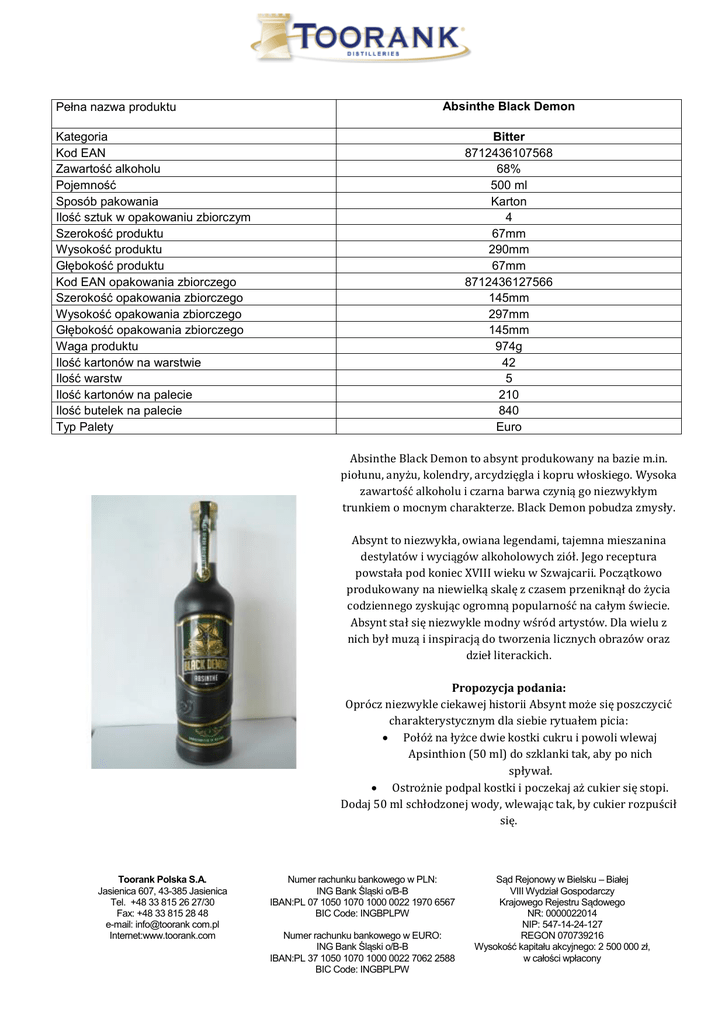 Pełna nazwa produktu Absinthe Black Demon Bitter 8712436107568 68% 500 ml Karton 4 67mm 290mm 67mm 8712436127566 145mm 297mm 145mm 974g 42 5 210 840 Euro Kategoria Kod EAN Zawartość alkoholu Pojemność Sposób pakowania Ilość sztuk w opakowaniu zbiorczym Szerokość produktu Wysokość produktu Głębokość produktu Kod EAN opakowania zbiorczego Szerokość opakowania zbiorczego Wysokość opakowania zbiorczego Głębokość opakowania zbiorczego Waga produktu Ilość kartonów na warstwie Ilość warstw Ilość kartonów na palecie Ilość butelek na palecie Typ Palety Absinthe Black Demon to absynt produkowany na bazie m.in. piołunu, anyżu, kolendry, arcydzięgla i kopru włoskiego. Wysoka zawartość alkoholu i czarna barwa czynią go niezwykłym trunkiem o mocnym charakterze. Black Demon pobudza zmysły. Absynt to niezwykła, owiana legendami, tajemna mieszanina destylatów i wyciągów alkoholowych ziół. Jego receptura powstała pod koniec XVIII wieku w Szwajcarii. Początkowo produkowany na niewielką skalę z czasem przeniknął do życia codziennego zyskując ogromną popularność na całym świecie. Absynt stał się niezwykle modny wśród artystów. Dla wielu z nich był muzą i inspiracją do tworzenia licznych obrazów oraz dzieł literackich. Propozycja podania: Oprócz niezwykle ciekawej historii Absynt może się poszczycić charakterystycznym dla siebie rytuałem picia: Połóż na łyżce dwie kostki cukru i powoli wlewaj Apsinthion (50 ml) do szklanki tak, aby po nich spływał. Ostrożnie podpal kostki i poczekaj aż cukier się stopi. Dodaj 50 ml schłodzonej wody, wlewając tak, by cukier rozpuścił się. Toorank Polska S.A. Jasienica 607, 43-385 Jasienica Tel. +48 33 815 26 27/30 Fax: +48 33 815 28 48 e-mail: info@toorank com.pl Internet:www.toorank.com Numer rachunku bankowego w PLN: ING Bank Śląski o/B-B IBAN:PL 07 1050 1070 1000 0022 1970 6567 BIC Code: INGBPLPW Numer rachunku bankowego w EURO: ING Bank Śląski o/B-B IBAN:PL 37 1050 1070 1000 0022 7062 2588 BIC Code: INGBPLPW Sąd Rejonowy w Bielsku – Białej VIII Wydział Gospodarczy Krajowego Rejestru Sądowego NR: 0000022014 NIP: 547-14-24-127 REGON 070739216 Wysokość kapitału akcyjnego: 2 500 000 zł, w całości wpłacony