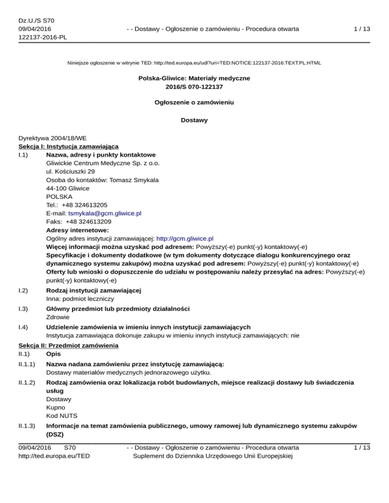Dz.U./S S70 09/04/2016 122137-2016-PL - - Dostawy - Ogłoszenie o zamówieniu - Procedura otwarta 1 / 13 Niniejsze ogłoszenie w witrynie TED: http://ted.europa.eu/udl?uri=TED:NOTICE:122137-2016:TEXT:PL:HTML Polska-Gliwice: Materiały medyczne 2016/S 070-122137 Ogłoszenie o zamówieniu Dostawy Dyrektywa 2004/18/WE Sekcja I: Instytucja zamawiająca I.1) Nazwa, adresy i punkty kontaktowe Gliwickie Centrum Medyczne Sp. z o.o. ul. Kościuszki 29 Osoba do kontaktów: Tomasz Smykala 44-100 Gliwice POLSKA Tel.: +48 324613205 E-mail: [email protected] Faks: +48 324613209 Adresy internetowe: Ogólny adres instytucji zamawiającej: http://gcm.gliwice.pl Więcej informacji można uzyskać pod adresem: Powyższy(-e) punkt(-y) kontaktowy(-e) Specyfikacje i dokumenty dodatkowe (w tym dokumenty dotyczące dialogu konkurencyjnego oraz dynamicznego systemu zakupów) można uzyskać pod adresem: Powyższy(-e) punkt(-y) kontaktowy(-e) Oferty lub wnioski o dopuszczenie do udziału w postępowaniu należy przesyłać na adres: Powyższy(-e) punkt(-y) kontaktowy(-e) I.2) Rodzaj instytucji zamawiającej Inna: podmiot leczniczy I.3) Główny przedmiot lub przedmioty działalności Zdrowie I.4) Udzielenie zamówienia w imieniu innych instytucji zamawiających Instytucja zamawiająca dokonuje zakupu w imieniu innych instytucji zamawiających: nie Sekcja II: Przedmiot zamówienia II.1) Opis II.1.1) Nazwa nadana zamówieniu przez instytucję zamawiającą: Dostawy materiałów medycznych jednorazowego użytku. II.1.2) Rodzaj zamówienia oraz lokalizacja robót budowlanych, miejsce realizacji dostawy lub świadczenia usług Dostawy Kupno Kod NUTS II.1.3) Informacje na temat zamówienia publicznego, umowy ramowej lub dynamicznego systemu zakupów (DSZ) 09/04/2016 S70 http://ted.europa.eu/TED - - Dostawy - Ogłoszenie o zamówieniu - Procedura otwarta Suplement do Dziennika Urzędowego Unii Europejskiej 1 / 13 Dz.U./S S70 09/04/2016 122137-2016-PL - - Dostawy - Ogłoszenie o zamówieniu - Procedura otwarta 2 / 13 Ogłoszenie dotyczy zamówienia publicznego II.1.4) Informacje na temat umowy ramowej II.1.5) Krótki opis zamówienia lub zakupu Zaopatrzenie medyczne szpitala, w tym: rękawice medyczne, chirurgiczne, igły, strzykawki, system próżniowego pobierania krwi, cewniki, dreny itp.. II.1.6) Wspólny Słownik Zamówień (CPV) 33140000 II.1.7) Informacje na temat Porozumienia w sprawie zamówień rządowych (GPA) Zamówienie jest objęte Porozumieniem w sprawie zamówień rządowych (GPA): nie II.1.8) Części To zamówienie podzielone jest na części: tak Oferty można składać w odniesieniu do wszystkich części II.1.9) Informacje o ofertach wariantowych Dopuszcza się składanie ofert wariantowych: nie II.2) Wielkość lub zakres zamówienia II.2.1) Całkowita wielkość lub zakres: II.2.2) Informacje o opcjach Opcje: nie II.2.3) Informacje o wznowieniach Jest to zamówienie podlegające wznowieniu: nie II.3) Czas trwania zamówienia lub termin realizacji Okres w miesiącach: 12 (od udzielenia zamówienia) Informacje o częściach zamówienia Część nr: 1 Nazwa: Pakiet 1 1) Krótki opis Elektrody do monitorowania, podkładki do defibrylacji. 2) Wspólny Słownik Zamówień (CPV) 33140000 3) Wielkość lub zakres 4) Informacje o różnych datach dotyczących czasu trwania lub rozpoczęcia/realizacji zamówienia 5) Informacje dodatkowe na temat części zamówienia Część nr: 2 Nazwa: Pakiet 2 1) Krótki opis Systemy do inhalacji, filtry oddechowe, wapno sodowe, filtry elektrostatyczne itp. 2) Wspólny Słownik Zamówień (CPV) 33140000 3) Wielkość lub zakres 4) Informacje o różnych datach dotyczących czasu trwania lub rozpoczęcia/realizacji zamówienia 5) Informacje dodatkowe na temat części zamówienia 09/04/2016 S70 http://ted.europa.eu/TED - - Dostawy - Ogłoszenie o zamówieniu - Procedura otwarta Suplement do Dziennika Urzędowego Unii Europejskiej 2 / 13 Dz.U./S S70 09/04/2016 122137-2016-PL - - Dostawy - Ogłoszenie o zamówieniu - Procedura otwarta 3 / 13 Część nr: 3 Nazwa: Pakiet 3 1) Krótki opis Rurka intubacyjna, cewnik do odsysania, dreny, maski anestetyczne, igłyaspiracyjne. 2) Wspólny Słownik Zamówień (CPV) 33140000 3) Wielkość lub zakres 4) Informacje o różnych datach dotyczących czasu trwania lub rozpoczęcia/realizacji zamówienia 5) Informacje dodatkowe na temat części zamówienia Część nr: 4 Nazwa: Pakiet 4 1) Krótki opis Układy oddechowe, rurki intubacyjne, cewniki, prowadnice itp. 2) Wspólny Słownik Zamówień (CPV) 33140000 3) Wielkość lub zakres 4) Informacje o różnych datach dotyczących czasu trwania lub rozpoczęcia/realizacji zamówienia 5) Informacje dodatkowe na temat części zamówienia Część nr: 5 Nazwa: Pakiet 5 1) Krótki opis Igły do znieczuleń, zestawy epiduralne itp. 2) Wspólny Słownik Zamówień (CPV) 33140000 3) Wielkość lub zakres 4) Informacje o różnych datach dotyczących czasu trwania lub rozpoczęcia/realizacji zamówienia 5) Informacje dodatkowe na temat części zamówienia Część nr: 6 Nazwa: Pakiet 6 1) Krótki opis Wkłady workowe. 2) Wspólny Słownik Zamówień (CPV) 33140000 3) Wielkość lub zakres 4) Informacje o różnych datach dotyczących czasu trwania lub rozpoczęcia/realizacji zamówienia 5) Informacje dodatkowe na temat części zamówienia Część nr: 7 Nazwa: Pakiet 7 1) Krótki opis Cewniki, worki do zbiórki moczu. 2) Wspólny Słownik Zamówień (CPV) 09/04/2016 S70 http://ted.europa.eu/TED - - Dostawy - Ogłoszenie o zamówieniu - Procedura otwarta Suplement do Dziennika Urzędowego Unii Europejskiej 3 / 13 Dz.U./S S70 09/04/2016 122137-2016-PL - - Dostawy - Ogłoszenie o zamówieniu - Procedura otwarta 4 / 13 33140000 3) Wielkość lub zakres 4) Informacje o różnych datach dotyczących czasu trwania lub rozpoczęcia/realizacji zamówienia 5) Informacje dodatkowe na temat części zamówienia Część nr: 8 Nazwa: Pakiet 8 1) Krótki opis Elektrody jednorazowe do diatermii. 2) Wspólny S