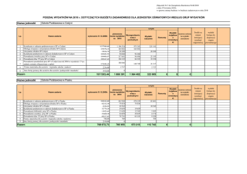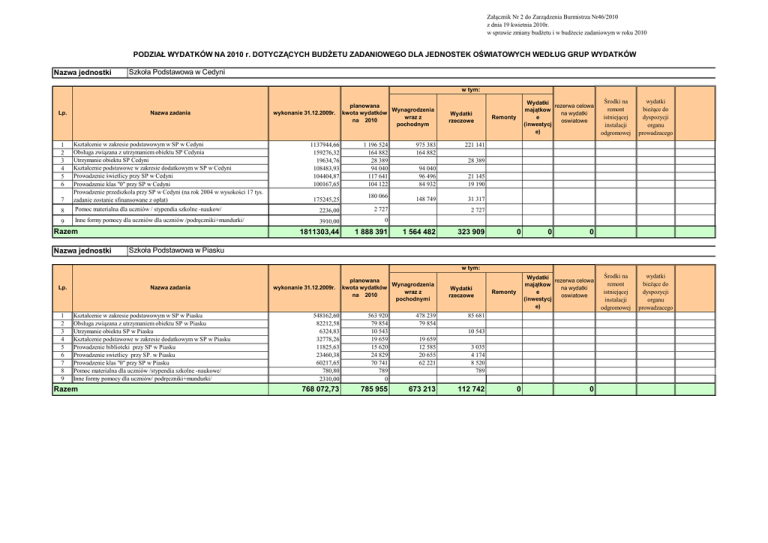 Załącznik Nr 2 do Zarządzenia Burmistrza Nr46/2010 z dnia 19 kwietnia 2010r. w sprawie zmiany budżetu i w budżecie zadaniowym w roku 2010 PODZIAŁ WYDATKÓW NA 2010 r. DOTYCZĄCYCH BUDŻETU ZADANIOWEGO DLA JEDNOSTEK OŚWIATOWYCH WEDŁUG GRUP WYDATKÓW Nazwa jednostki Szkoła Podstawowa w Cedyni w tym: Nazwa zadania Lp. wykonanie 31.12.2009r. planowana Wynagrodzenia kwota wydatków wraz z na 2010 pochodnym 7 Kształcenie w zakresie podstawowym w SP w Cedyni Obsługa związana z utrzymaniem obiektu SP Cedynia Utrzymanie obiektu SP Cedyni Kształcenie podstawowe w zakresie dodatkowym w SP w Cedyni Prowadzenie świetlicy przy SP w Cedyni Prowadzenie klas "0" przy SP w Cedyni Prowadzenie przedszkola przy SP w Cedyni (na rok 2004 w wysokości 17 tys. zadanie zostanie sfinansowane z opłat) 8 Pomoc materialna dla uczniów / stypendia szkolne -naukow/ 2236,00 2 727 9 Inne formy pomocy dla uczniów dla uczniów /podręczniki+mundurki/ 3910,00 0 1811303,44 1 888 391 1 2 3 4 5 6 Razem Nazwa jednostki 1137944,66 159276,32 19634,76 108483,93 104404,87 100167,65 175245,25 1 196 524 164 882 28 389 94 040 117 641 104 122 180 066 975 383 164 882 Wydatki rzeczowe Wydatki rezerwa celowa majątkow na wydatki e oswiatowe (inwestycj e) Remonty Środki na remont istniejącej instalacji odgromowej wydatki bieżące do dyspozycji organu prowadzacego Środki na remont istniejącej instalacji odgromowej wydatki bieżące do dyspozycji organu prowadzacego 221 141 28 389 94 040 96 496 84 932 21 145 19 190 148 749 31 317 2 727 1 564 482 323 909 0 0 0 Szkoła Podstawowa w Piasku w tym: Lp. 1 2 3 4 5 6 7 8 9 Nazwa zadania Kształcenie w zakresie podstawowym w SP w Piasku Obsługa związana z utrzymaniem obiektu SP w Piasku Utrzymanie obiektu SP w Piasku Kształcenie podstawowe w zakresie dodatkowym w SP w Piasku Prowadzenie biblioteki przy SP w Piasku Prowadzenie swietlicy przy SP. w Piasku Prowadzenie klas "0" przy SP w Piasku Pomoc materialna dla uczniów /stypendia szkolne -naukowe/ Inne formy pomocy dla uczniów/ podręczniki+mundurki/ Razem wykonanie 31.12.2009r. planowana Wynagrodzenia kwota wydatków wraz z na 2010 pochodnymi 548162,60 82212,58 6324,83 32778,26 11825,63 23460,38 60217,65 780,80 2310,00 563 920 79 854 10 543 19 659 15 620 24 829 70 741 789 0 478 239 79 854 768 072,73 785 955 673 213 Wydatki rzeczowe Wydatki rezerwa celowa majątkow na wydatki e oswiatowe (inwestycj e) Remonty 85 681 10 543 19 659 12 585 20 655 62 221 3 035 4 174 8 520 789 112 742 0 0 Nazwa jednostki Gimnazjum w Cedyni w tym: Lp. 1 2 3 4 5 6 7 8 9 Nazwa zadania Kształcenie w zakresie podstawowym w Gimnazjum w Cedyni Obsługa związana z utrzymaniem obiektu Gimnazjum w Cedyni Utrzymanie obiektu Gimnazjum w Cedyni Kształcenie podstawowe w zakresie dodatkowym w Gimnazjum w Cedyni Prowadzenie świetlicy przy Gimnazjum w Cedyni pomoc materialna dla uczniów /stypendia socjalne/ Pozostała dzilalnośc Pomoc materialna dla uczniów /stypenida szkolne - naukowe/ Inne formy pomocy dla uczniów/ mundurki/ Razem Nazwa jednostki wykonanie 31.12.2009r. planowana Wynagrodzenia kwota wydatków wraz z na 2010 pochodnymi 1036908,31 113393,52 12773,08 96510,18 91087,33 51999,71 19542,84 2304,00 2892,00 1 134 634 122 115 18 449 59 123 98 494 33 950 22 977 3 059 0 975 856 122 115 1427410,97 1 492 801 1 261 678 Wydatki rzeczowe Wydatki rezerwa celowa majątkow na wydatki e oswiatowe (inwestycj e) Remonty Środki na remont istniejącej instalacji odgromowej wydatki bieżące do dyspozycji organu prowadzacego Środki na remont istniejącej instalacji odgromowej wydatki bieżące do dyspozycji organu prowadzacego 158 778 18 449 59 123 86 049 18 535 12 445 33 950 4 442 3 059 231 123 0 0 0 Gmina Cedynia w tym: Nazwa zadania Lp. 1. 2 wykonanie 31.12.2009r. planowana Wynagrodzenia kwota wydatków wraz z na 2010 pochodnymi Wydatki rzeczowe Wydatki rezerwa celowa majątkow na wydatki e oswiatowe (inwestycj e) Remonty Rezerwy UM rozdział Rezerwy UM rozdział Razem 0 0 0 0 0 0 0 0 Nazwa jednostki w tym: Lp. 1. 2. 3. 4. 5. 6. 7. 8 9 10 11 Nazwa zadania Administracja ZAS Utrzymanie obiektu SP w Cedyni Obsługa związana z utrzymaniem obiektu SP w Cedyni Utrzymanie obiektu SP w Piasku Obsługa związana z utrzymaniem obiektu SP w Piasku Utrzymanie obiektu Gimnazjum w Cedyni Obsługa związana z utrzymaniem obiektu Gimnazjum w Cedyni Utrzymanie - dowożenie dzieci do szkół Obsługa związana z dowozem dzieci do szkół Ddowożenie dzieci do szkół Utrzymanie "orlik" Razem wykonanie 31.12.2009r. planowana Wynagrodzenia kwota wydatków wraz z na 2010 pochodnymi 337810,94 225604,24 9301,09 22040,81 4577,73 125295,19 6265,76 2816,37 30563,60 231604,36 675,00 368 446 171 244 7 321 41 250 1 774 137 175 2 400 3 425 73 073 256 950 14 000 312 220 996 555,09 1 077 058 396 788 Wydatki rzeczowe Wydatki rezerwa celowa majątkow na wydatki e oswiatowe (inwestycj e) Remonty wpi 56 226 171 244 7 321 41 250 1 774 137 175 2 400 3 425 73 073 256 950 14 000 680 270 0 0 Środki na remont istniejącej instalacji odgromowej wydatki bieżące do dyspozycji organu prowadzacego 0 Razem wydatki oświatowe 5 003 342,23 5 244 205 2 923 908 2 984 754 Źródła finansowania Subwencja oświatowa 1% z rezerwy subwencji oświatowej dotacja z MENIS dofinansowanie zakupu podręczników dotacja stypendia szkolne -socjalne 10 450,00 9 112,00 51 999,71 33 950 Najmy 2 270,90 1 207 Wpływy z usług rożnych 5 581,17 4 400 dotacja język angielski klasy pierwsze środki z paow PIASKI /elewacja + stolarka okienna/ wpływy z różnych opłat wpływy z różnych dochodów odsetki Wpływy z opłat za przedszkole ŹRÓDŁA FINANSOWANIA /RAZEM/ Dofinansowanie - różnica pomiędzy subwencją i opłatami a kwotą wydatków 327,00 352 9 381,31 955 5 604,27 4 670 49 092,00 82 300 3 067 726,36 3 112 588 -1 935 615,87 -2 131 617 3 896 161 1 348 044 0 0 0 0 0 0