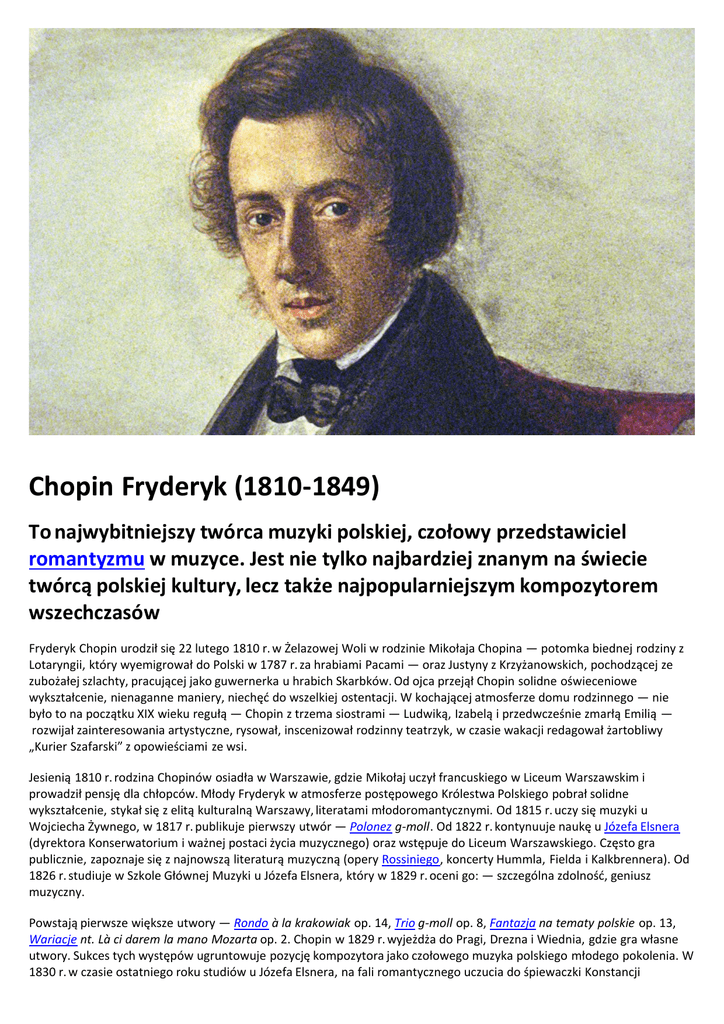 Chopin Fryderyk (1810-1849) To najwybitniejszy twórca muzyki polskiej, czołowy przedstawiciel romantyzmu w muzyce. Jest nie tylko najbardziej znanym na świecie twórcą polskiej kultury, lecz także najpopularniejszym kompozytorem wszechczasów Fryderyk Chopin urodził się 22 lutego 1810 r. w Żelazowej Woli w rodzinie Mikołaja Chopina — potomka biednej rodziny z Lotaryngii, który wyemigrował do Polski w 1787 r. za hrabiami Pacami — oraz Justyny z Krzyżanowskich, pochodzącej ze zubożałej szlachty, pracującej jako guwernerka u hrabich Skarbków. Od ojca przejął Chopin solidne oświeceniowe wykształcenie, nienaganne maniery, niechęć do wszelkiej ostentacji. W kochającej atmosferze domu rodzinnego — nie było to na początku XIX wieku regułą — Chopin z trzema siostrami — Ludwiką, Izabelą i przedwcześnie zmarłą Emilią — rozwijał zainteresowania artystyczne, rysował, inscenizował rodzinny teatrzyk, w czasie wakacji redagował żartobliwy „Kurier Szafarski” z opowieściami ze wsi. Jesienią 1810 r. rodzina Chopinów osiadła w Warszawie, gdzie Mikołaj uczył francuskiego w Liceum Warszawskim i prowadził pensję dla chłopców. Młody Fryderyk w atmosferze postępowego Królestwa Polskiego pobrał solidne wykształcenie, stykał się z elitą kulturalną Warszawy, literatami młodoromantycznymi. Od 1815 r. uczy się muzyki u Wojciecha Żywnego, w 1817 r. publikuje pierwszy utwór — Polonez g-moll. Od 1822 r. kontynuuje naukę u Józefa Elsnera (dyrektora Konserwatorium i ważnej postaci życia muzycznego) oraz wstępuje do Liceum Warszawskiego. Często gra publicznie, zapoznaje się z najnowszą literaturą muzyczną (opery Rossiniego, koncerty Hummla, Fielda i Kalkbrennera). Od 1826 r. studiuje w Szkole Głównej Muzyki u Józefa Elsnera, który w 1829 r. oceni go: — szczególna zdolność, geniusz muzyczny. Powstają pierwsze większe utwory — Rondo à la krakowiak op. 14, Trio g-moll op. 8, Fantazja na tematy polskie op. 13, Wariacje nt. Là ci darem la mano Mozarta op. 2. Chopin w 1829 r. wyjeżdża do Pragi, Drezna i Wiednia, gdzie gra własne utwory. Sukces tych występów ugruntowuje pozycję kompozytora jako czołowego muzyka polskiego młodego pokolenia. W 1830 r. w czasie ostatniego roku studiów u Józefa Elsnera, na fali romantycznego uczucia do śpiewaczki Konstancji Gładkowskiej, powstają przełomowe utwory wczesnoromantycznej fazy twórczości — Koncert fortepianowy f-moll op. 21 i e-moll op. 11. 20-letni kompozytor w mistrzowski sposób połączył w nich klasyczną formę z modnym stylem brillant i nowatorską fakturą fortepianową. Na tle epoki były to utwory wstrząsające — współczesna im twórczość jest już dawno zapomniana, a one po blisko 200 latach zachowały blask i świeżość. Fryderyk Chopin, Koncert fortepianowy nr 1 e-moll op. 11 Kolosalny sukces Koncertu e-moll stanowił w istocie pożegnanie Chopina. Opuszczając Warszawę w przeddzień Powstania Listopadowego, miał już nigdy nie powrócić do ojczyzny. Przez Wiedeń i Stuttgart dotarł do Francji. Pomimo uznania krytyki (słynne —Panowie, czapki z głów, oto geniusz! — Roberta Schumanna w recenzji z Wariacji op. 2) pierwsze lata w Paryżu, stającym się ówczesną muzyczną stolicą Europy, nie były łatwe. Chopin powoli wchodzi w dobre towarzystwo, pisze serię konwencjonalnych utworów, uważanych za najsłabsze w jego dorobku. W celach zarobkowych zaczyna dawać lekcje gry na fortepianie. Pierwszy koncert jako pianista daje w lutym 1832 r. i odnosi ogromny sukces, stając się jednym z najbardziej cenionych wykonawców. Czołowi artyści i intelektualiści epoki — Berlioz, Heine, Fétis, Delacroix, Liszt — uważali go za pianistę jedynego w swoim rodzaju, potrafiącego z instrumentu wydobyć niezwykłe niuanse, chwytającego za serce, lecz bez nadużywania siły i pianistycznych efektów typowych dla modnych wówczas wirtuozów fortepianu; pisano: — jego sukces był ogromny, a przecie trzeba czegoś zupełnie wyjątkowego, ażeby wywrzeć wrażenie po tych świetnych pianistach, jakich posiada Paryż. Kariera pianistyczna nie odpowiadała jednak Chopinowi, który w 1835 r. wycofuje się z estrady; — ja się nie nadaję do występów publicznych, audytorium mnie onieśmiela — wyznał Lisztowi. Poświęca się kompozycji — publikuje przełomowe w historii muzyki utwory, jak Etiudy op. 10 i op. 25, Balladę g-moll op. 23, Scherzo h-moll op. 20, kolejne zeszyty Mazurków. W 1838 r. związuje się ze znaną pisarką i skandalistką George Sand. Jej troskliwa opieka, intelektualny impuls i spokój wiejskiej posiadłości George Sand w Nohant pozwalają Chopinowi na trwający siedem lat rozkwit dojrzałej twórczości. Powstają Preludia op. 28, Sonata b-moll op. 35, polonezy, mazurki, Fantazja f-moll op. 49, Sonata h-moll op. 58. Dwa półpubliczne występy Chopina przed kulturalną elitą Paryża w 1841 r. i 1842 r. potwierdzają jego pozycję największego pianisty epoki: — Chopin osiągnął swój szczyt — pisano. Fryderyk Chopin, Andante spianato i Wielki Polonez Es-Dur W 1847 r. rozstaje się z George Sand; osamotniony i schorowany wchodzi w ostatni okres życia i twórczości. Komponuje Poloneza-Fantazję op. 61, Sonatę wiolonczelową op. 65, ostatnie nokturny i mazurki. W 1848 r. w celach zarobkowych wyjeżdża do Anglii i Szkocji, gdzie daje kilka koncertów i odnosi komercyjny sukces, lecz fatalny klimat jedynie przyspiesza postępy gruźlicy. Umiera 17 października 1849 r. w Paryżu. Miejsce Chopina w historii muzyki jest arcyważne, niepodważalne. Polską sztukę z prowincjonalnej izolacji wysforował na światowe salony i nadał jej bieg aż do początku XX wieku. W Europie — przypieczętował przełom romantyczny, rozwinął styl brillant i impulsy obecne w twórczości Schuberta i Webera, lecz poszedł dalej, otwierając przed muzyką instrumentalną zupełnie nowe drogi. Nie na darmo uważa się go za pr