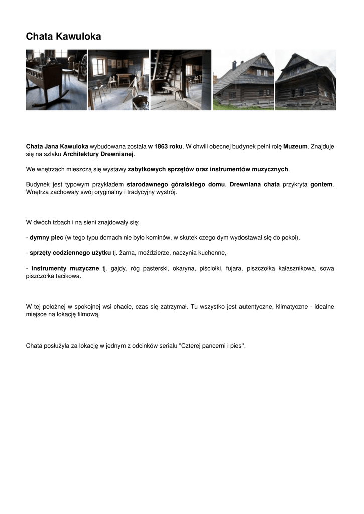 Chata Kawuloka Chata Jana Kawuloka wybudowana została w 1863 roku. W chwili obecnej budynek pełni rolę Muzeum. Znajduje się na szlaku Architektury Drewnianej. We wnętrzach mieszczą się wystawy zabytkowych sprzętów oraz instrumentów muzycznych. Budynek jest typowym przykładem starodawnego góralskiego domu. Drewniana chata przykryta gontem. Wnętrza zachowały swój oryginalny i tradycyjny wystrój. W dwóch izbach i na sieni znajdowały się: - dymny piec (w tego typu domach nie było kominów, w skutek czego dym wydostawał się do pokoi), - sprzęty codziennego użytku tj. żarna, moździerze, naczynia kuchenne, - instrumenty muzyczne tj. gajdy, róg pasterski, okaryna, piściołki, fujara, piszczołka kałasznikowa, sowa piszczołka tacikowa. W tej położnej w spokojnej wsi chacie, czas się zatrzymał. Tu wszystko jest autentyczne, klimatyczne - idealne miejsce na lokację filmową. Chata posłużyła za lokację w jednym z odcinków serialu "Czterej pancerni i pies". Informacje dodatkowe Wymagane zezwolenie: Tak Natężenie światła: Małe Natężenie hałasu: Małe Media Odległość od bazy produkcyjnej: Na miejscu Możliwość dojazdu: Nie Powered by TCPDF (www.tcpdf.org)