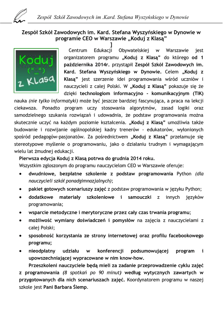 Zespół Szkół Zawodowych im .Kard. Stefana Wyszyńskiego w Dynowie Zespół Szkół Zawodowych im. Kard. Stefana Wyszyńskiego w Dynowie w programie CEO w Warszawie „Koduj z Klasą” ] Centrum Edukacji Obywatelskiej w Warszawie jest organizatorem programu „Koduj z Klasą” do którego od 1 października 2014r. przystąpił Zespół Szkół Zawodowych im. Kard. Stefana Wyszyńskiego w Dynowie. Celem „Koduj z Klasą” jest szerzenie idei programowania wśród uczniów i nauczycieli z całej Polski. W „Koduj z Klasą” pokazuje się że dzięki technologiom informacyjno - komunikacyjnym (TIK) nauka (nie tylko informatyki) może być jeszcze bardziej fascynująca, a praca na lekcji ciekawsza. Ponadto program uczy stosowania algorytmów, zasad logiki oraz samodzielnego szukania rozwiązań i udowadnia, że podstaw programowania można skutecznie uczyć na każdym poziomie kształcenia. „Koduj z Klasą” umożliwia także budowanie i rozwijanie ogólnopolskiej kadry trenerów - edukatorów, wyłonionych spośród pedagogów-pasjonatów. Za pośrednictwem „Koduj z Klasą” przełamuje się stereotypowe myślenie o programowaniu, jako o działaniu trudnym i wymagającym wielu lat żmudnej edukacji. Pierwsza edycja Koduj z Klasą potrwa do grudnia 2014 roku. Wszystkim zgłoszonym do programu nauczycielom CEO w Warszawie oferuje: dwudniowe, bezpłatne szkolenie z podstaw programowania Python (dla nauczycieli szkół ponadgimnazjalnych); pakiet gotowych scenariuszy zajęć z podstaw programowania w języku Python; wsparcie metodyczne i merytoryczne przez cały czas trwania programu; dodatkowe materiały programowania; szkoleniowe i samouczki z innych języków możliwość wymiany doświadczeń i pomysłów na zajęcia z nauczycielami z całej Polski; sposobność korzystania ze strony internetowej oraz profilu facebookowego programu; nieodpłatny udziału w konferencji podsumowującej upowszechniającej wypracowane w nim know-how. program i Przeszkoleni nauczyciele będą mieli za zadanie przeprowadzenie cyklu zajęć z programowania (8 spotkań po 90 minut) według wytycznych zawartych w przygotowanych dla nich scenariuszach zajęć. Koordynatorem programu w naszej szkole jest Pani Barbara Ślemp.