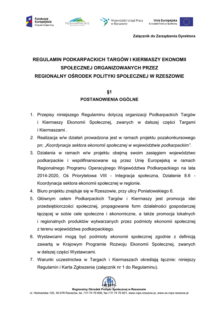 Załącznik do Zarządzenia Dyrektora REGULAMIN PODKARPACKICH TARGÓW I KIERMASZY EKONOMII SPOŁECZNEJ ORGANIZOWANYCH PRZEZ REGIONALNY OŚRODEK POLITYKI SPOŁECZNEJ W RZESZOWIE §1 POSTANOWIENIA OGÓLNE 1. Przepisy niniejszego Regulaminu dotyczą organizacji Podkarpackich Targów i Kiermaszy Ekonomii Społecznej, zwanych w dalszej części Targami i Kiermaszami . 2. Realizacja w/w działań prowadzona jest w ramach projektu pozakonkursowego pn: „Koordynacja sektora ekonomii społecznej w województwie podkarpackim”. 3. Działania w ramach w/w projektu obejmą swoim zasięgiem województwo podkarpackie i współfinansowane są przez Unię Europejską w ramach Regionalnego Programu Operacyjnego Województwa Podkarpackiego na lata 2014-2020, Oś Priorytetowa VIII - Integracja społeczna, Działanie 8.6 Koordynacja sektora ekonomii społecznej w regionie. 4. Biuro projektu znajduje się w Rzeszowie, przy ulicy Poniatowskiego 6. 5. Głównym celem Podkarpackich Targów i Kiermaszy jest promocja idei przedsiębiorczości społecznej, propagowanie form działalności gospodarczej łączącej w sobie cele społeczne i ekonomiczne, a także promocja lokalnych i regionalnych produktów wytwarzanych przez podmioty ekonomii społecznej z terenu województwa podkarpackiego. 6. Wystawcami mogą być podmioty ekonomii społecznej zgodnie z definicją zawartą w Krajowym Programie Rozwoju Ekonomii Społecznej, zwanych w dalszej części Wystawcami. 7. Warunki uczestnictwa w Targach i Kiermaszach określają łącznie: niniejszy Regulamin i Karta Zgłoszenia (załącznik nr 1 do Regulaminu). 8. Organizatorem Targów i Kiermaszy jest Regionalny Ośrodek Polityki Społecznej w Rzeszowie, ul. Hetmańska 120, 35-078 Rzeszów, zwany w dalszej części Organizatorem. 9. Targi i Kiermasze będą odbywać się w dniu, miejscu i czasie ustalonym przez Organizatora. §2 WARUNKI UDZIAŁU 1. Warunkiem uczestnictwa w Targach i Kiermaszach jest dostarczenie do siedziby Organizatora poprawnie wypełnionej Karty Zgłoszenia do dnia ustalonego przez Organizatora (zgłoszenie powinno być podpisane przez osobę do tego upoważnioną). 2. Liczba stanowisk wystawowych jest ograniczona. 3. Organizator zapewni reprezentację każdego rodzaju Wystawców z zachowaniem równych proporcji względem określonej liczby miejsc wystawowych. 4. W przypadku wolnych miejsc, miejsca te zapełniane będą przez pozostałych zgłoszonych Wystawców (decydować będzie data wpływu zgłoszenia od danego Wystawcy). 5. W przypadku większej liczby chętnych Wystawców niż miejsc, zostanie utworzona lista rezerwowa. 6. Potwierdzenie udziału Wystawcy w Targach i Kiermaszach nastąpi najpóźniej do dnia ustalonego przez Organizatora. 7. Wystawca ma prawo odstąpić od uczestnictwa w Targach i Kiermaszach. Odwołanie uczestnictwa wymaga formy pisemnej. Za datę odwołania uczestnictwa uważa się datę wpływu do siedziby Organizatora pisma poleconego zawierającego stosowne oświadczenie. 8. Organizator zastrzega sobie prawo do przesunięcia terminu Targów lub Kiermaszy, lub jego odwołania z przyczyn niezależnych od Organizatora - bez odszkodowania. 9. Udział w Targach i Kiermaszach jest bezpłatny. §3 PRZEPISY PORZĄDKOWE I ORGANIZACYJNE 1. Harmonogram Targów i Kiermaszy: przygotowanie stoiska w dniu i godzinach ustalonych przez Organizatora, godz. otwarcia stoiska dla zwiedzających w dniu i godzinach ustalonych przez Organizatora, likwidacja stoiska w dniu i godzinach ustalonych przez Organizatora. 2. Wystawca jest zobowiązany zapewnić nieprzerwaną obsługę stoiska w godzinach trwania Targów i Kiermaszy. 3. Wjazd i postój samochodów na terenie Targów możliwy jest wyłącznie na czas zaopatrzenia i tylko poza godzinami otwarcia. W celu otrzymania przepustki na wjazd Wystawca musi zgłosić pisemnie do Organizatora nr rej. i markę pojazdu najpóźniej na 2 tygodnie przed terminem Targów i Kiermaszu. 4. Udostępniona powierzchnia i mienie przeznaczone są wyłącznie dla Wystawcy zgłoszonego do udziału w Targach lub Kiermaszu. 5. Wystawcy są zobowiązani do wystawienia wyłącznie asortymentu podanego w Karcie Zgłoszenia i zaakceptowanego przez Organizatora. 6. Każdy wystawca ma prawo do prowadzenia akcji promocyjnych swoich towarów lub usług wyłącznie na własnym stoisku. Prezentacje nie mogą utrudniać lub uniemożliwiać bezpiecznego poruszania się uczestników i publiczności, stwarzać zagrożenia bezpieczeństwu ani zakłócać spokoju. Reklama poza stoiskiem wymaga pisemnej zgody Organizatora i może być realizowana wyłącznie za jego pośrednictwem. 7. Wystawcy zobowiązani są do przestrzegania obowiązujących przepisów dotyczących wprowadzenia do obrotu handlowego towarów odpowiednio oznakowanych, przestrzegania terminów przydatności do spożycia i higieny obrotu towarów spożywczych przeznaczonych do sprzedaży. 8. Wystawcy, którzy prowadzą sprzedaż żywności zobowiązani są do zapewnienia na stoisku warunków zgodnych z wymogami sanitarnymi. 9. Osoby prowadzące sprzedaż żywności mają obowiązek posiadania książeczki zdrowia. 10. Organizator ma prawo natychmiastowego zamknięcia stoiska i usunięcia Wystawcy w przypadku stwierdzenia naruszenia przez niego Regulaminu. 11. Elementy ekspozycji i inne urządzenia pozostawione po zakończeniu Targów lub Kiermaszu bez akceptacji Organizatora uważa się za mienie porzucone, które przechodzi bez odszkodowania na rzecz Organizatora. 12. Reklamy naruszające dobre obyczaje lub interesy Organizatora będą niedopuszczone do rozpowszechniania lub usunięte z terenów imprezy na koszt reklamodawcy, bez prawa do jakichkolwiek roszczeń i zwrotu należności. §4 STOISKA WYSTAWIENNICZE 1. Organizator określa lokalizację stoiska, oraz udostępnia Wystawcy powierzchnię wraz z zabudową o powierzchni: targi - 2mx3m, kiermasze – 2mx2m. 2. Organizator zapewnia dostęp do energii elektrycznej. 3. Wystawca przed rozpoczęciem Targów lub Kierm