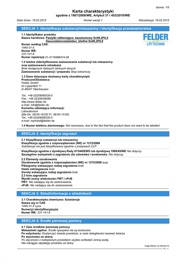 40.1.0 strona: 1/5 Karta charakterystyki zgodnie z 1907/2006/WE, Artykuł 31 i 453/2010/WE Data druku: 19.02.2015 Numer wersji 1 Aktualizacja: 19.02.2015 SEKCJA 1: Identyfikacja substancji/mieszaniny i identyfikacja przedsiębiorstwa 1.1 Identyfikator produktu Nazwa handlowa: Pastylki odtleniające, bezołowiowy Sn99,2P0,8 Desoxidationstabletten, bleifrei Sn99,2P0,8 Numer według CAS: 7440-31-5 Numer WE: 231-141-8 Numer rejestracji 01-2119486474-28 1.2 Istotne zidentyfikowane zastosowania substancji lub mieszaniny oraz zastosowania odradzane Brak dostępnych dalszych istotnych danych Zastosowanie substancji / preparatu Stop lutowniczy 1.3 Dane dotyczące dostawcy karty charakterystyki Producent/Dostawca: Felder GmbH Im Lipperfeld 11 D-46047 Oberhausen Tel.: +49 (0)208/85035-0 Fax.: +49 (0)208/26080 http://www.felder.de e-mail: [email protected] Komórka udzielająca informacji: Laboratorium (Mo-Do. 08:00-16:00/ Fr. 08:00-13:00) Tel.: +49 (0)208/85035-0 e-mail: [email protected] 1.4 Numer telefonu alarmowego: Not necessary, due to the fact that the product does not need to be labelled. SEKCJA 2: Identyfikacja zagrożeń 2.1 Klasyfikacja substancji lub mieszaniny Klasyfikacja zgodnie z rozporządzeniem (WE) nr 1272/2008 Substancja nie jest klasyfikowana zgodnie z przepisami CLP. Klasyfikacja zgodnie z dyrektywą Rady 67/548/EWG lub dyrektywą 1999/45/WE Nie dotyczy. Szczególne wskazówki o zagrożeniu dla człowieka i środowiska: Nie dotyczy. 2.2 Elementy oznakowania Oznakowanie zgodnie z rozporządzeniem (WE) nr 1272/2008 brak Piktogramy wskazujące rodzaj zagrożenia brak Hasło ostrzegawcze brak Zwroty wskazujące rodzaj zagrożenia brak 2.3 Inne zagrożenia Wyniki oceny właściwości PBT i vPvB PBT: Nie nadający się do zastosowania. vPvB: Nie nadający się do zastosowania. SEKCJA 3: Skład/informacja o składnikach 3.1 Charakterystyka chemiczna: Substancje Nazwa wg nr CAS 7440-31-5 cyna Numer(y) identyfikacyjny(e) Numer WE: 231-141-8 SEKCJA 4: Środki pierwszej pomocy 4.1 Opis środków pierwszej pomocy Wskazówki ogólne: Środki specjalne nie są konieczne. Po wdychaniu: Dostarczyć świeże powietrze, w razie dolegliwości wezwać lekarza. Po styczności ze skórą: Po styczności z roztopionym produktem szybko ochłodzić zimną wodą. Nie odciągać stężałego produktu od skóry. (ciąg dalszy na stronie 2) PL 40.1.0 strona: 2/5 Karta charakterystyki zgodnie z 1907/2006/WE, Artykuł 31 i 453/2010/WE Data druku: 19.02.2015 Numer wersji 1 Aktualizacja: 19.02.2015 Nazwa handlowa: Pastylki odtleniające, bezołowiowy Sn99,2P0,8 Desoxidationstabletten, bleifrei Sn99,2P0,8 (ciąg dalszy od strony 1) Odwieźć do lekarza. Po styczności z okiem: Płukać oczy z otwartą powieką przez kilka minut pod bieżącą wodą. Po przełknięciu: Przy trwałych dolegliwościach porozumieć się z lekarzem. 4.2 Najważniejsze ostre i opóźnione objawy oraz skutki narażenia Brak dostępnych dalszych istotnych danych 4.3 Wskazania dotyczące wszelkiej natychmiastowej pomocy lekarskiej i szczególnego postępowania z poszkodowanym Brak dostępnych dalszych istotnych danych SEKCJA 5: Postępowanie w przypadku pożaru 5.1 Środki gaśnicze Przydatne środki gaśnicze: CO2, proszek gaśniczy lub strumień wody. Większy pożar zwalczać strumieniem wody lub pianą odporną na działanie alkoholu. 5.2 Szczególne zagrożenia związane z substancją lub mieszaniną Brak dostępnych dalszych istotnych danych 5.3 Informacje dla straży pożarnej Specjalne wyposażenie ochronne: Środki specjalne nie są konieczne. SEKCJA 6: Postępowanie w przypadku niezamierzonego uwolnienia do środowiska 6.1 Indywidualne środki ostrożności, wyposażenie ochronne i procedury w sytuacjach awaryjnych Nie konieczne. 6.2 Środki ostrożności w zakresie ochrony środowiska: Nie dopuścić do przedostania się do kanalizacji lub zbiorników wodnych. 6.3 Metody i materiały zapobiegające rozprzestrzenianiu się skażenia i służące do usuwania skażenia: Pozostawić do stężenia, zdjąć mechanicznie. 6.4 Odniesienia do innych sekcji Informacje na temat bezpiecznej obsługi patrz rozdział 7. Informacje na temat osobistego wyposażenia ochronnego patrz rozdział 8. Informacje na temat utylizacji patrz rozdział 13. SEKCJA 7: Postępowanie z substancjami i mieszaninami oraz ich magazynowanie 7.1 Środki ostrożności dotyczące bezpiecznego postępowania W przypadku obróbki termicznej lub obróbki skrawaniem niezbędne są możliwości odsysania w miejscu lokalizacji obrabiarek. Wskazówki dla ochrony przeciwpożarowej i przeciwwybuchowej: Nie są potrzebne szczególne zabiegi. 7.2 Warunki bezpiecznego magazynowania, łącznie z informacjami dotyczącymi wszelkich wzajemnych niezgodności Składowanie: Wymagania w stosunku do pomieszczeń składowych i zbiorników: Brak szczególnych wymagań. Wskazówki odnośnie wspólnego składowania: Nie składować w styczności ze środkami spożywczymi. Dalsze wskazówki odnośnie warunków składowania: Składować w suchym miejscu. Klasa składowania: 11 7.3 Szczególne zastosowanie(-a) końcowe Brak dostępnych dalszych istotnych danych SEKCJA 8: Kontrola narażenia/środki ochrony indywidualnej Dodatkowe wskazówki dla wykonania urządzeń technicznych: Brak dalszych danych, patrz punkt 7. 8.1 Parametry dotyczące kontroli Składniki wraz z kontrolowanymi wartościami granicznymi zależnymi od miejsca pracy: 7440-31-5 cyna NDS NDS: 2 mg/m3 zalecanych procedur monitorowania zgodnie 453/2010/UE nr 8.1.2: 7440-31-5 cyna: NIOSH 7300, 7301, 7303(E), OSHA ID-121, ISO15202(E,F), MTA/MA-025/A92(ESP) Wskazówki dodatkowe: Podstawą były aktualnie obowiązujące wykazy. 8.2 Kontrola narażenia Osobiste wyposażenie ochronne: Ogólne środki ochrony i higieny: Unikać styczności materiałów stopionych ze skórą (ciąg dalszy na stronie 3) PL 40.1.0 strona: 3/5 Karta charakterystyki zgodnie z 1907/2006/WE, Artykuł 31 i 453/2010/WE Data druku: 19.02.2015 Numer wersji 1 Aktua