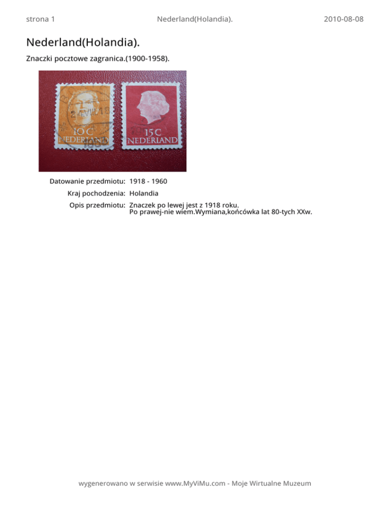 strona 1 Nederland(Holandia). Nederland(Holandia). Znaczki pocztowe zagranica.(1900-1958). Datowanie przedmiotu: 1918 - 1960 Kraj pochodzenia: Holandia Opis przedmiotu: Znaczek po lewej jest z 1918 roku. Po prawej-nie wiem.Wymiana,końcówka lat 80-tych XXw. wygenerowano w serwisie www.MyViMu.com - Moje Wirtualne Muzeum 2010-08-08 strona 1 Niemcy. Niemcy. Znaczki pocztowe zagranica.(1900-1958). Datowanie przedmiotu: 1933 - 1936 Kraj pochodzenia: Niemcy Opis przedmiotu: "Hindenburgi" z lat 1933-36.Wymiana w latach 1979-1980. wygenerowano w serwisie www.MyViMu.com - Moje Wirtualne Muzeum 2010-08-08 strona 1 Italia(Włochy). 2010-08-08 Italia(Włochy). Znaczki pocztowe zagranica.(1900-1958). Datowanie przedmiotu: 1934 Kraj pochodzenia: Włochy Opis przedmiotu: Znaczek z 1934 roku z przeznaczoną kwotą na armię.Wymiana,początek lat 90-tych XXw. wygenerowano w serwisie www.MyViMu.com - Moje Wirtualne Muzeum strona 1 Francja. Francja. Znaczki pocztowe zagranica.(1900-1958). Datowanie przedmiotu: 1900 - 1960 Kraj pochodzenia: Francja Opis przedmiotu: Znaczek (I) z lewej jest z 1960 roku.-Pam rodz. Znaczek(II) z prawej zaś jest z 1900roku.-kupiony. wygenerowano w serwisie www.MyViMu.com - Moje Wirtualne Muzeum 2010-08-08 strona 1 Generalna Gubernia(okupacja niemiecka). Generalna Gubernia(okupacja niemiecka). Znaczki pocztowe zagranica.(1900-1958). Datowanie przedmiotu: 1941 Opis przedmiotu: Znaczek GG z 1941 roku.Podarunek. wygenerowano w serwisie www.MyViMu.com - Moje Wirtualne Muzeum 2010-08-08 strona 1 Niemcy(II). 2010-08-08 Niemcy(II). Znaczki pocztowe zagranica.(1900-1958). Datowanie przedmiotu: 1940 - 1944 Kraj pochodzenia: Niemcy Opis przedmiotu: "Hitler" z lat 40-tych XXw.Podarunek,końcówka lat 80-tych XXw. wygenerowano w serwisie www.MyViMu.com - Moje Wirtualne Muzeum strona 1 Ostland(okupacja niemiecka). 2010-08-08 Ostland(okupacja niemiecka). Znaczki pocztowe zagranica.(1900-1958). Datowanie przedmiotu: 1941 - 1944 Kraj pochodzenia: Niemcy Opis przedmiotu: Znaczek z Ostland(Estonia,Łotwa,Litwa i Białoruś) wydawany po 1941r.Zakup. wygenerowano w serwisie www.MyViMu.com - Moje Wirtualne Muzeum strona 1 Vaticane(Watykan). 2010-08-08 Vaticane(Watykan). Znaczki pocztowe zagranica.(1900-1958). Datowanie przedmiotu: 1953 Kraj pochodzenia: Watykan Opis przedmiotu: Znaczek z Piusem XII z 1953 roku.Wymiana w połowie lat 80-tych XXw. wygenerowano w serwisie www.MyViMu.com - Moje Wirtualne Muzeum strona 1 Finland(Finlandia). Finland(Finlandia). Znaczki pocztowe zagranica.(1900-1958). Datowanie przedmiotu: 1953 Kraj pochodzenia: Finlandia Opis przedmiotu: 300 lecie miejscowości Hamina.Podarunek. wygenerowano w serwisie www.MyViMu.com - Moje Wirtualne Muzeum 2010-08-08 strona 1 Italia(II). 2010-08-08 Italia(II). Znaczki pocztowe zagranica.(1900-1958). Datowanie przedmiotu: 1955 Kraj pochodzenia: Włochy Opis przedmiotu: Włoskie znaczki z 1955 roku.Wymiana w końcówce lat 70-tych XXw. wygenerowano w serwisie www.MyViMu.com - Moje Wirtualne Muzeum strona 1 NRD(DDR). NRD(DDR). Znaczki pocztowe zagranica.(1900-1958). Datowanie przedmiotu: 1958 Opis przedmiotu: Znaczek z Niemieckiej Republiki Demokratycznej z 1958 roku.Podarunek z pocz.lat 2000-nych. wygenerowano w serwisie www.MyViMu.com - Moje Wirtualne Muzeum 2010-08-08 strona 1 Uganda,Kenya,Tanganika. 2010-08-08 Uganda,Kenya,Tanganika. Znaczki pocztowe zagranica.(1900-1958). Datowanie przedmiotu: 1959 Opis przedmiotu: Imperialny(kolonialny)znaczek brytyjski w obiegu w Ugandzie,Kenii i Tanganice(część obecnego Konga i Tanzanii).Wymiana,końcówka lat 80-tych XXw. wygenerowano w serwisie www.MyViMu.com - Moje Wirtualne Muzeum strona 1 Denmark(Dania). Denmark(Dania). Znaczki pocztowe zagranica.(1900-1958). Datowanie przedmiotu: 1967 Kraj pochodzenia: Dania Opis przedmiotu: Duńskie znaczki z 1967roku.Wymiana, do II poł.lat 80-tych. wygenerowano w serwisie www.MyViMu.com - Moje Wirtualne Muzeum 2010-08-08