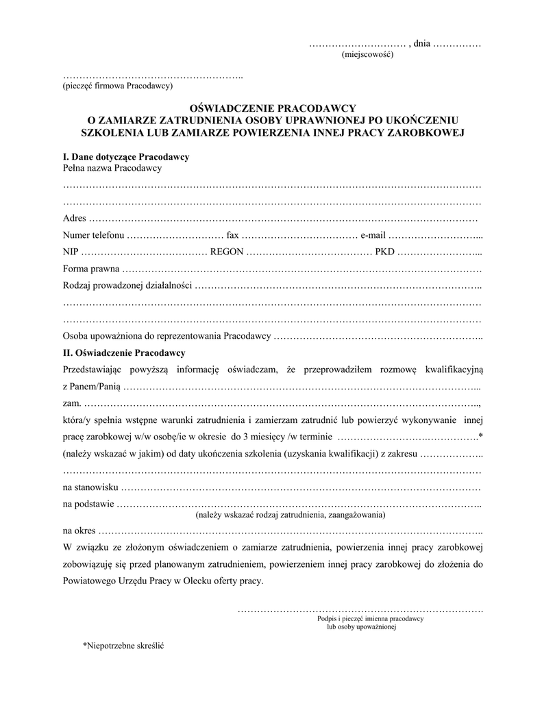 ………………………… , dnia …………… (miejscowość) ……………………………………………….. (pieczęć firmowa Pracodawcy) OŚWIADCZENIE PRACODAWCY O ZAMIARZE ZATRUDNIENIA OSOBY UPRAWNIONEJ PO UKOŃCZENIU SZKOLENIA LUB ZAMIARZE POWIERZENIA INNEJ PRACY ZAROBKOWEJ I. Dane dotyczące Pracodawcy Pełna nazwa Pracodawcy ………………………………………………………………………………………………………………… ………………………………………………………………………………………………………………… Adres ………………………………………………………………………………………………………… Numer telefonu ………………………… fax ……………………………… e-mail ………………………... NIP ………………………………… REGON ………………………………… PKD ……………………... Forma prawna ………………………………………………………………………………………………… Rodzaj prowadzonej działalności …………………………………………………………………………….. ………………………………………………………………………………………………………………… ………………………………………………………………………………………………………………… Osoba upoważniona do reprezentowania Pracodawcy ……………………………………………………….. II. Oświadczenie Pracodawcy Przedstawiając powyższą informację oświadczam, że przeprowadziłem rozmowę kwalifikacyjną z Panem/Panią ………………………………………………………………………………………………... zam. ………………………………………………………………………………………………………….., która/y spełnia wstępne warunki zatrudnienia i zamierzam zatrudnić lub powierzyć wykonywanie innej pracę zarobkowej w/w osobę/ie w okresie do 3 miesięcy /w terminie ……………………….…………….* (należy wskazać w jakim) od daty ukończenia szkolenia (uzyskania kwalifikacji) z zakresu ……………….. ………………………………………………………………………………………………………………… na stanowisku ………………………………………………………………………………………………… na podstawie ………………………………………………………………………………………………….. (należy wskazać rodzaj zatrudnienia, zaangażowania) na okres ……………………………………………………………………………………………………….. W związku ze złożonym oświadczeniem o zamiarze zatrudnienia, powierzenia innej pracy zarobkowej zobowiązuję się przed planowanym zatrudnieniem, powierzeniem innej pracy zarobkowej do złożenia do Powiatowego Urzędu Pracy w Olecku oferty pracy. …………………………………………………………………. Podpis i pieczęć imienna pracodawcy lub osoby upoważnionej *Niepotrzebne skreślić