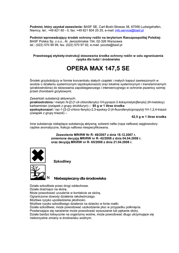 Podmiot, który uzyskał zezwolenie: BASF SE, Carl-Bosh-Strasse 38, 67056 Ludwigshafen, Niemcy, tel.: +49 621 60 - 0, fax: +49 621 604 25 25, e-mail: [email protected] Podmiot wprowadzający środek ochrony roślin na terytorium Rzeczpospolitej Polskiej: BASF Polska Sp. z o.o., Al. Jerozolimskie 154, 02-326 Warszawa tel.: (022) 570 99 99, fax. (022) 570 97 92, e-mail: [email protected] Przestrzegaj etykiety-instrukcji stosowania środka ochrony roślin w celu ograniczenia ryzyka dla ludzi i środowiska OPERA MAX 147,5 SE Środek grzybobójczy w formie koncentratu stałych cząstek i małych kapsuł zawieszonych w wodzie o działaniu systemicznym (epoksykonazol) oraz lokalnie systemicznym i translaminarnym (piraklostrobina) do stosowania zapobiegawczego i interwencyjnego w ochronie pszenicy ozimej przed chorobami grzybowymi. Zawartość substancji aktywnych: piraklostrobina / metylo N-{2-[1-(4-chlorofenylo)-1H-pyrazol-3 iloksymetylo]fenylo} (N-metoksy) karbaminian (związek z grupy strobiluryn) – 85 g w 1 litrze środka epoksykonazol / rac-1-[3-(2-chloro-fenylo)-2,3-epoksy-2-(4-fluorofenylo)propylo]-1H-1,2,4-triazol (związek z grupy triazoli) – 62,5 g w 1 litrze środka Inne substancje niebędące substancją aktywną: solwent nafta (ropa naftowa) węglowodory ciężkie aromatyczne, frakcja naftowa niespecyfikowana. Zezwolenie MRiRW Nr R- 48/2007 z dnia 18.12.2007 r. zmienione decyzją MRiRW nr R- 42/2008 z dnia 04.04.2008 r. oraz decyzją MRiRW nr R- 65/2008 z dnia 21.04.2008 r. Szkodliwy Niebezpieczny dla środowiska Działa szkodliwie przez drogi oddechowe. Działa drażniąco na skórę. Może powodować uczulenie w kontakcie ze skórą. Ograniczone dowody działania rakotwórczego. Możliwe ryzyko upośledzenia płodności. Możliwe ryzyko szkodliwego działania na dziecko w łonie matki. Działa szkodliwie; może powodować uszkodzenie płuc w przypadku połknięcia. Powtarzające się narażenie może powodować wysuszanie lub pękanie skóry. Działa bardzo toksycznie na organizmy wodne, może powodować długo utrzymujące się niekorzystne zmiany w środowisku wodnym. 2 Uwaga! 1. Zabrania się stosowania środka w strefie bezpośredniej ochrony ujęć wody oraz na terenie uzdrowisk, otulin parków narodowych i rezerwatów. 2. Nie zanieczyszczać wód środkiem ochrony roślin lub jego opakowaniem. ZAKRES STOSOWANIA TERMINY I DAWKI Rośliny rolnicze Zboża ozime pszenica ozima mączniak prawdziwy, łamliwość podstawy źdźbła, fuzaryjna zgorzel podstawy źdźbła Zalecana dawka: 1,5-2 l/ha Wyższą z zalecanych dawek stosować przy większym nasileniu chorób. rdza brunatna, brunatna plamistość liści, septorioza liści Zalecana dawka: 2 l/ha Zalecana ilość wody: 200-400 l/ha Zalecane opryskiwanie: drobnokropliste Środek stosować zapobiegawczo lub z chwilą wystąpienia pierwszych objawów chorób od fazy pierwszego kolanka do końca fazy strzelania w źdźbło. Maksymalnie wykonać 2 zabiegi w sezonie. Uwaga: Środek ogranicza występowanie fuzaryjnej zgorzeli podstawy źdźbła. OKRES KARENCJI (okres od dnia ostatniego zabiegu do dnia zbioru i przeznaczenia do konsumpcji): pszenica ozima - 35 dni. OKRES PREWENCJI DLA PSZCZÓŁ, LUDZI I ZWIERZĄT (okres zapobiegający zatruciu): NIE DOTYCZY. SPORZĄDZANIE CIECZY UŻYTKOWEJ Przed przystąpieniem do sporządzania cieczy użytkowej dokładnie ustalić potrzebną jej ilość. Przed użyciem wstrząsnąć zawartością opakowania. Odmierzoną ilość środka wlać do zbiornika opryskiwacza napełnionego częściowo wodą (z włączonym mieszadłem) i uzupełnić wodą do potrzebnej ilości. Opryskiwać z włączonym mieszadłem. Po wlaniu środka do zbiornika opryskiwacza nie wyposażonego w mieszadło hydrauliczne ciecz mechaniczne wymieszać. Opróżnione opakowania przepłukać trzykrotnie wodą, a popłuczyny wlać do zbiornika opryskiwacza z cieczą użytkową. Po pracy aparaturę dokładnie wymyć. PRZECHOWYWANIE Przechowywać wyłącznie w oryginalnym opakowaniu, w pojemnikach szczelnie zamkniętych, w chłodnym dobrze wentylowanym miejscu w temperaturze nie niższej niż 0oC i nie wyższej niż 30oC z dala od źródeł ciepła. Chronić przed dziećmi. Nie przechowywać razem z żywnością, napojami i paszami dla zwierząt. 3 WARUNKI BEZPIECZNEGO STOSOWANIA ŚRODKA Nie jeść i nie pić oraz nie palić tytoniu podczas stosowania produktu. Unikać zanieczyszczenia skóry. Nosić odpowiednią odzież ochronną i odpowiednie rękawice ochronne i okulary lub ochronę twarzy. W przypadku awarii lub jeżeli źle się poczujesz, niezwłocznie zasięgnij porady lekarza, jeżeli to możliwe pokaż etykietę. W razie połknięcia nie wywoływać wymiotów: niezwłocznie zasięgnąć porady lekarza i pokazać opakowanie lub etykietę. Środek i opakowanie usuwać jako odpad niebezpieczny. Resztki nieużytej cieczy użytkowej rozcieńczyć wodą i wypryskać na powierzchni poprzednio opryskiwanej. Wodę użytą do mycia aparatury wypryskać na powierzchni poprzednio opryskiwanej, stosując te same środki ochrony osobistej. Używać odpowiednich pojemników zapobiegających skażeniu środowiska. Opróżnione opakowania po środku zwrócić do sprzedawcy, u którego środek został zakupiony. Zabrania się spalania opakowań po środku ochrony roślin we własnym zakresie. PIERWSZA POMOC I INFORMACJA DLA LEKARZA W przypadku połknięcia natychmiast wypłukać usta i popić dużą ilością wody, unikać wymiotów; skonsultować się z lekarzem. Wskazówki dla lekarza: leczenie symptomatyczne (dekontaminacja, funkcje witalne). UWAGA ZABRANIA SIĘ WYKORZYSTYWANIA OPRÓŻNIONYCH OPAKOWAŃ PO ŚRODKACH OCHRONY ROŚLIN DO INNYCH CELÓW, W TYM TAKŻE TRAKTOWANIA ICH JAKO SUROWCE WTÓRNE. ANTIDOTUM: BRAK, STOSOWAĆ LECZENIE OBJAWOWE. Pomoc medyczna W zaistniałych sytuacjach, kiedy wymagana jest lub konieczna inna pomoc medyczna niż ujęta w wyżej wymienionych ostrzeżeniach skontaktować się z najbliższym ośrodkiem toksykol