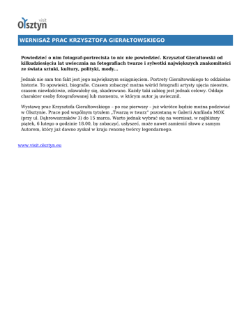 WERNISAŻ PRAC KRZYSZTOFA GIERAŁTOWSKIEGO Powiedzieć o nim fotograf-portrecista to nic nie powiedzieć. Krzysztof Gierałtowski od kilkudziesięciu lat uwiecznia na fotografiach twarze i sylwetki największych znakomitości ze świata sztuki, kultury, polityki, mody… Jednak nie sam ten fakt jest jego największym osiągnięciem. Portrety Gierałtowskiego to oddzielne historie. To opowieści, biografie. Czasem zobaczyć można wśród fotografii artysty ujęcia nieostre, czasem niewłaściwie, zdawałoby się, skadrowane. Każdy taki zabieg jest jednak celowy. Oddaje charakter osoby fotografowanej lub momentu, w którym autor ją uwiecznił. Wystawę prac Krzysztofa Gierałtowskiego – po raz pierwszy – już wkrótce będzie można podziwiać w Olsztynie. Prace pod wspólnym tytułem „Twarzą w twarz” pozostaną w Galerii Amfilada MOK (przy ul. Dąbrowszczaków 3) do 15 marca. Warto jednak wybrać się na wernisaż, w najbliższy piątek, 6 lutego o godzinie 18.00, by zobaczyć, usłyszeć, może nawet zamienić słowo z samym Autorem, który już dawno zyskał w kraju renomę twórcy legendarnego. www.visit.olsztyn.eu