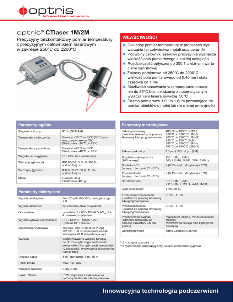optris® CTlaser 1M/2M WŁAŚCIWOŚCI Precyzyjny bezkontaktowy pomiar temperatury z precyzyjnym celownikiem laserowym w zakresie 250°C do 2200°C Dokładny pomiar temperatury w procesach wytwarzania i przetwórstwa metali oraz ceramiki Podwójny celownik laserowy precyzyjnie wyznacza wielkość pola pomiarowego z każdej odległości Rozdzielczość optyczna do 300:1 z różnymi wartociami ogniskowej Zakresy pomiarowe od 250°C do 2200°C, wielkość pola pomiarowego od 0,45mm i stała czasowa od 1 ms Możliwość stosowania w temperaturze otoczenia do 85°C bez chłodzenia z automatycznym wyłączaniem lasera powyżej 50°C Pasmo pomiarowe 1.0 lub 1.6µm pozwalające na pomiar obiektów o małej lub nieznanej emisyjności Parametry ogólne Parametry metrologiczne Stopień ochrony IP 65 (NEMA-4) Temperatura otoczenia Głowica: -20°C do 85°C (50°C przy włączonym laserze ON) Elektronika: -20°C do 85°C Temperatura przechow. Głowica: -40°C do 85°C Elektronika: -40°C do 85°C Wilgotność względna 10 - 95%, bez kondensacji Wibracje (głowica) IEC 68-2-6: 3 G, 11-200 Hz, w dowolnej osi Wstrząsy (głowica) IEC 68-2-27: 50 G, 11 ms, w dowolnej osi Masa Głowica: 40 g Elektronika: 420 g Parametry elektryczne Wyjścia analogowe 0/4 - 20 mA, 0-5/10 V, termopary typu J, K Wyjścia alarmowe 24 V/50 mA (otwarty kolektor) Opcjonalnie przkaźnik: 2 x 60 V DC/42 V ACeff; 0.4 A; izolowany optycznie Wyjścia cyfrowe (opcjonalnie) USB, RS232, RS485, CAN, Profibus DP, Ethernet Impedancja wyjściowa mA max. 500 Ω (dla 8-36 V DC) mV min. 100 kΩ impedancji obciąż. termopara 20 Ω (impedancja wy.) Wejścia programowalne wejścia funkcyjne do zewnętrznego zadawania emisyjności, kompensacji temperatury otoczenia, wyzwalania (kasowania funkcji hold) Długość kabla 3 m (standard), 8 m, 15 m Pobór prądu max. 160 mA Napięcie zasilania 8-36 V DC Laser 635 nm 1mW, włączanie i wyłączanie za pomocą elektroniki lub programowo 1) 2) Zakres pomiarowy (dowolnie skalowany za pomocą klawiatury lub oprogramowania) 485°C do 1050°C (1ML) 650°C do 1800°C (1MH) 800°C do 2200°C (1MH1) 250°C do 800°C (2ML) 385°C do 1600°C (2MH) 490°C do 2000°C (2MH1) Zakres spektralny 1.0 μm (1M)/1,6 µm (2M) Rozdzialczość optyczna (90% energii) 150:1 (1ML, 2ML) 300:1 (1MH, 1MH1, 2MH, 2MH1) Dokładność1) (w temp. otoczenia 23 ±5°C) ± (0.3% wart. odczytanej + 2°C) Powtarzalność (w temp. otoczenia 23 ±5°C) ± (0.1% wart. odczytanej + 1°C) Rozdzielczość 0.1 K (1ML, 2ML) 0.2 K (1MH, 1MH1, 2MH, 2MH1) Czas ekspozycji2) 1 ms (90 %) Emisyjność/wzmocnienie (ustalane za pomocą klawiatury lub oprogramowania) 0.100 - 1.100 Przepuszczalność (ustalana za pomocą klawiatury lub oprogramowania) 0.100 - 1.100 Przetwarzanie sygnału (parametr ustawiany za pomocą klawiatury lub programu) maksimum lokalne, minimum lokalne, średnia; rozszerzona funkcja hold z progierm i histerezą Oprogramowanie optris Compact Connect Ɛ = 1, stała czasowa 1 s z dynamiczną adaptacją przy niskich poziomach sygnału Innowacyjna technologia podczerwieni optris® CTlaser 1M/2M Charakterystyka optyczna Głowica pomiarowa 2 Elektronika TEST-THERM Sp. z o.o., Ul.Friedleina 4-6, 30-009 Kraków Tel.: 12 632 1301, 12 632 6188 • Fax: 12 632 1037 Email: offi[email protected] • Internet: http://test-therm.pl Specyfikacja może ulec zmianie bez uprzedzenia CTlaser1M2M-DS-PL2011-08-A Wymiary