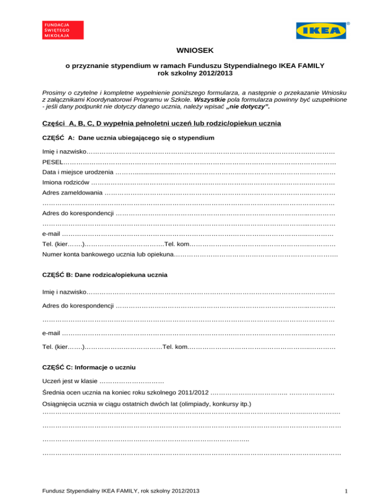 WNIOSEK o przyznanie stypendium w ramach Funduszu Stypendialnego IKEA FAMILY rok szkolny 2012/2013 Prosimy o czytelne i kompletne wypełnienie poniższego formularza, a następnie o przekazanie Wniosku z załącznikami Koordynatorowi Programu w Szkole. Wszystkie pola formularza powinny być uzupełnione - jeśli dany podpunkt nie dotyczy danego ucznia, należy wpisać „nie dotyczy”. Części A, B, C, D wypełnia pełnoletni uczeń lub rodzic/opiekun ucznia CZĘŚĆ A: Dane ucznia ubiegającego się o stypendium Imię i nazwisko………………………………………………………………………………………….………… PESEL……………………………………………………………………………………………………………… Data i miejsce urodzenia ……….......................……………………………………………………..………… Imiona rodziców ………………………………………………………………………………………..………… Adres zameldowania …………………………………………………………………………………..………… ……………………………………………………………………………………………………………………… Adres do korespondencji ……………………………………………………………………………...………… …………………………………………………………………………………………………………....………… e-mail …………………………………………………………………….……………………………..………… Tel. (kier…….)……………………………….Tel. kom………………………………………………..………… Numer konta bankowego ucznia lub opiekuna…………………………………………………………………. CZĘŚĆ B: Dane rodzica/opiekuna ucznia Imię i nazwisko………………………………………………………………………………………….………… Adres do korespondencji ……………………………………………………………………………...………… ……………………………………………………………………………………………………………………… e-mail …………………………………………………………………….……………………………...………… Tel. (kier…….)………………………………Tel. kom.………………………………………………..………… CZĘŚĆ C: Informacje o uczniu Uczeń jest w klasie ………………………… Średnia ocen ucznia na koniec roku szkolnego 2011/2012 .…………………………….. ………………… Osiągnięcia ucznia w ciągu ostatnich dwóch lat (olimpiady, konkursy itp.) …………………………………………………………………………………………………………..……………. ………………………………………………………………………………………………………………………… ……………………………………….………………………………………….. ………………………………………………………………………………………………………………………… Fundusz Stypendialny IKEA FAMILY, rok szkolny 2012/2013 1 ………………………………………………………………………………………………………………………… ………………………………………………… Dodatkowe umiejętności i zainteresowania ucznia (np. gra na pianinie, ma uzdolnienia plastyczne, interesuje się wybraną dziedziną nauki, hobby) …………………………………………………………………... …………………………………………………………………………………………………………………………… …………………………………………………………………………………………………………………………… …………………………………………………………………………………………………………………………… …………………………………………………………………………………………………………………………… …………………………………………………………………………………………………………………………… Aktywność społeczno – kulturalna ucznia (wolontariat, harcerstwo, działalność w lokalnych organizacjach, w tym szczególnie w organizacjach ekologicznych, aktywność w lokalnej parafii, w samorządzie szkolnym, udział w olimpiadach tematycznych, działalność artystyczna, redagowanie gazetki szkolnej, aktywność na rzecz kultury, itp.). Proszę określić częstotliwość danego zaangażowania (np. 1 raz w tygodniu 1 godz.) ……………………………………………………………………………………… ………………………………………………………………………………………………………………………….. ………………………………………………………………………………………………………………………… ………………………………………………………………………………………………………………………… ………………………………………………………………………………………………………………………… ………………………………………………………………………………………………………………………… ………………………………………………………………………………………………………