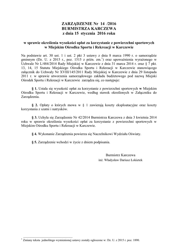 ZARZĄDZENIE Nr 14 /2016 BURMISTRZA KARCZEWA z dnia 15