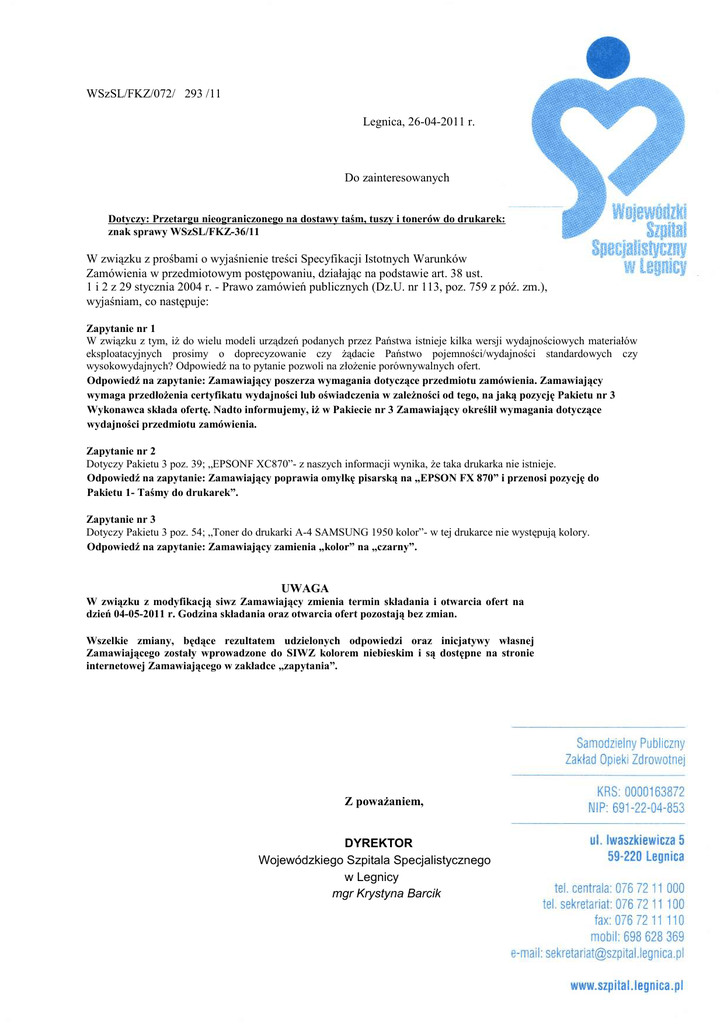 WSzSL/FKZ/072/ 293 /11 Legnica, 26-04-2011 r. Do zainteresowanych Dotyczy: Przetargu nieograniczonego na dostawy taśm, tuszy i tonerów do drukarek: znak sprawy WSzSL/FKZ-36/11 W związku z prośbami o wyjaśnienie treści Specyfikacji Istotnych Warunków Zamówienia w przedmiotowym postępowaniu, działając na podstawie art. 38 ust. 1 i 2 z 29 stycznia 2004 r. - Prawo zamówień publicznych (Dz.U. nr 113, poz. 759 z póź. zm.), wyjaśniam, co następuje: Zapytanie nr 1 W związku z tym, iż do wielu modeli urządzeń podanych przez Państwa istnieje kilka wersji wydajnościowych materiałów eksploatacyjnych prosimy o doprecyzowanie czy żądacie Państwo pojemności/wydajności standardowych czy wysokowydajnych? Odpowiedź na to pytanie pozwoli na złożenie porównywalnych ofert. Odpowiedź na zapytanie: Zamawiający poszerza wymagania dotyczące przedmiotu zamówienia. Zamawiający wymaga przedłożenia certyfikatu wydajności lub oświadczenia w zależności od tego, na jaką pozycję Pakietu nr 3 Wykonawca składa ofertę. Nadto informujemy, iż w Pakiecie nr 3 Zamawiający określił wymagania dotyczące wydajności przedmiotu zamówienia. Zapytanie nr 2 Dotyczy Pakietu 3 poz. 39; „EPSONF XC870”- z naszych informacji wynika, że taka drukarka nie istnieje. Odpowiedź na zapytanie: Zamawiający poprawia omyłkę pisarską na „EPSON FX 870” i przenosi pozycję do Pakietu 1- Taśmy do drukarek”. Zapytanie nr 3 Dotyczy Pakietu 3 poz. 54; „Toner do drukarki A-4 SAMSUNG 1950 kolor”- w tej drukarce nie występują kolory. Odpowiedź na zapytanie: Zamawiający zamienia „kolor” na „czarny”. UWAGA W związku z modyfikacją siwz Zamawiający zmienia termin składania i otwarcia ofert na dzień 04-05-2011 r. Godzina składania oraz otwarcia ofert pozostają bez zmian. Wszelkie zmiany, będące rezultatem udzielonych odpowiedzi oraz inicjatywy własnej Zamawiającego zostały wprowadzone do SIWZ kolorem niebieskim i są dostępne na stronie internetowej Zamawiającego w zakładce „zapytania”. Z poważaniem, DYREKTOR Wojewódzkiego Szpitala Specjalistycznego w Legnicy mgr Krystyna Barcik