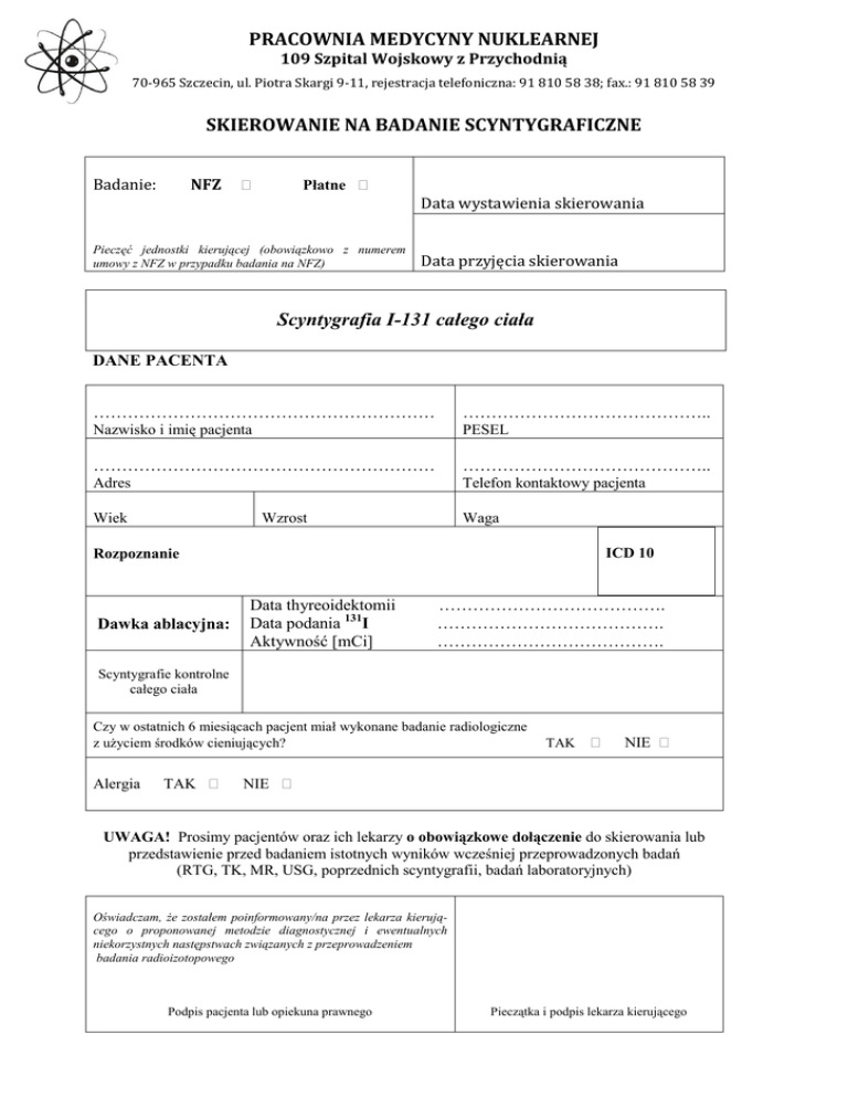 PRACOWNIA MEDYCYNY NUKLEARNEJ 109 Szpital Wojskowy z Przychodnią 70-965 Szczecin, ul. Piotra Skargi 9-11, rejestracja telefoniczna: 91 810 58 38; fax.: 91 810 58 39 SKIEROWANIE NA BADANIE SCYNTYGRAFICZNE Badanie: NFZ Płatne Data wystawienia skierowania Pieczęć jednostki kierującej (obowiązkowo z numerem umowy z NFZ w przypadku badania na NFZ) Data przyjęcia skierowania Scyntygrafia I-131 całego ciała DANE PACENTA …………………………………………………… …………………………………….. Nazwisko i imię pacjenta PESEL …………………………………………………… …………………………………….. Adres Telefon kontaktowy pacjenta Wiek Wzrost Waga ICD 10 Rozpoznanie Dawka ablacyjna: Data thyreoidektomii Data podania 131I Aktywność [mCi] …………………………………. …………………………………. …………………………………. Scyntygrafie kontrolne całego ciała Czy w ostatnich 6 miesiącach pacjent miał wykonane badanie radiologiczne z użyciem środków cieniujących? Alergia TAK TAK NIE NIE UWAGA! Prosimy pacjentów oraz ich lekarzy o obowiązkowe dołączenie do skierowania lub przedstawienie przed badaniem istotnych wyników wcześniej przeprowadzonych badań (RTG, TK, MR, USG, poprzednich scyntygrafii, badań laboratoryjnych) Oświadczam, że zostałem poinformowany/na przez lekarza kierującego o proponowanej metodzie diagnostycznej i ewentualnych niekorzystnych następstwach związanych z przeprowadzeniem badania radioizotopowego Podpis pacjenta lub opiekuna prawnego Pieczątka i podpis lekarza kierującego