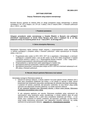 WG.2600.4.2015 ZAPYTANIE OFERTOWE Dotyczy: Świadczenie usług audytora wewnętrznego Burmistrz Byczyny zaprasza do złożenia oferty na usługę prowadzenia audytu wewnętrznego w zakresie wynikającym z art. 272 w związku z art. 274 ust. 3 ustawy z dnia 27 sierpnia 2009 r. o finansach publicznych (Dz.U. z 2013 r., poz. 885). I. Przedmiot zamówienia: Usługowe prowadzenie audytu wewnętrznego w Urzędzie Miejskim w Byczynie oraz podległych jednostkach organizacyjnych na terenie Gminy Byczyna przez okres 2 kolejnych lat, tj. od daty podpisania umowy nie wcześniej jednak niż od 1 marca 2015 r. do 28 lutego 2017 r. II. Zakres obowiązków Wykonawcy Obowiązkiem Wykonawcy będzie realizacja działań związana z przeprowadzaniem audytu wewnętrznego w zakresie wynikającym z przepisów ustawy o finansach publicznych i aktów wykonawczych do niniejszej ustawy, w tym m.in.: 1. Przygotowanie planu audytu na 2015, 2016 i 2017 rok w uzgodnieniu z Zamawiającym, w terminach wynikających z przepisów prawa, z tym że plan audytu na rok 2015 należy przygotować w możliwie najszybszym terminie w oparciu o § 11 Rozporządzenia Ministra Finansów z dnia 1 lutego 2010 r. w sprawie przeprowadzania i dokumentowania audytu wewnętrznego 2. Przeprowadzenie co najmniej trzech zadań zapewniających w każdym roku; 3. Sporządzanie pisemnych sprawozdań z realizacji zadań zapewniających; 4. Sporządzanie sprawozdań z wykonania planu audytu za 2015 i 2016 rok w terminach wskazanych w art. 283 ustawy o finansach publicznych. III. Warunki, których spełnienie Wykonawca musi wykazać Zamawiający wymaga by Wykonawca wykazał, że: wykonał lub wykonuje należycie, w okresie ostatnich 5 lat przed upływem terminu składania ofert a jeżeli okres prowadzenia działalności jest krótszy- w tym okresie co najmniej 5 zadań, których przedmiotem było świadczenie usług audytu wewnętrznego dla Jednostek samorządu terytorialnego, z podaniem ich wartości, przedmiotu, dat wykonania i podmiotów, na rzecz których usługi zostały wykonane oraz załączeniem dowodów (referencji), czy zostały wykonane należycie. W celu wykazania spełniania przez Wykonawcę warunku, o którym mowa powyżej, Wykonawca zobowiązany jest przedłożyć wraz z ofertą: W celu wykazania spełnienia w/w warunku Wykonawca przedkłada wykaz wykonanych lub wykonywanych usług świadczenia audytu wewnętrznego, w okresie ostatnich pięciu lat przed upływem terminu składania ofert, a jeżeli okres prowadzenia działalności jest krótszy – w tym okresie, wraz z podaniem ich wartości, przedmiotu, dat wykonania i podmiotów, na rzecz których usługi zostały wykonane/są wykonywane, oraz załączeniem dowodów (referencji), czy zostały wykonane lub są wykonywane należycie;– załącznik nr 2 – Doświadczenie zawodowe 1 dysponuje co najmniej jedną osobą posiadającą kwalifikacje/uprawnienia audytora wewnętrznego określone w art. 286 ustawy o finansach publicznych, tj.: 1) posiadać obywatelstwo państwa członkowskiego Unii Europejskiej lub innego państwa, którego obywatelom, na podstawie umów międzynarodowych lub przepisów prawa wspólnotowego, przysługuje prawo podjęcia zatrudnienia na terytorium Rzeczypospolitej Polskiej; 2) mieć pełną zdolność do czynności prawnych oraz korzystania z pełni praw publicznych; 3) być osobą niekaraną za umyślne przestępstwo lub umyślne przestępstwo skarbowe; 4) posiadać wyższe wykształcenie; 5) posiadać następujące kwalifikacje do przeprowadzania audytu wewnętrznego: a) jeden z certyfikatów: CertifiedInternalAuditor (CIA), CertifiedGovernment Auditing Professional (CGAP), Certified Information Systems Auditor (CISA), Association of CharteredCertifiedAccountants (ACCA), Certified Fraud Examiner (CFE), Certification in Control SelfAssessment (CCSA), Certified Financial Services Auditor (CFSA) lub Chartered Financial Analyst (CFA) lub b) złożył w latach 2003-2006, z wynikiem pozytywnym egzamin na audytora wewnętrznego przed Komisją Egzaminacyjną powołaną przez Ministra Finansów lub c) mieć uprawnienia biegłego rewidenta lub d) mieć dwuletnią praktykę w zakresie audytu wewnętrznego i legitymuje się dyplomem ukończenia studiów podyplomowych w zakresie audytu wewnętrznego, wydanym przez jednostkę organizacyjną, która w dniu wydania dyplomu była uprawniona, zgodnie z odrębnymi ustawami, do nadawania stopnia naukowego doktora nauk ekonomicznych lub prawnych. Za praktykę w zakresie audytu wewnętrznego, o której mowa w ust. 1 pkt 5 lit. d, uważa się udokumentowane przez kierownika jednostki wykonywanie czynności, w wymiarze czasu pracy nie mniejszym niż 1/2 etatu, związanych z: 1) przeprowadzaniem audytu wewnętrznego pod nadzorem audytora wewnętrznego; 2) realizacją przez inspektorów kontroli skarbowej czynności z zakresu certyfikacji i wydawania deklaracji zamknięcia pomocy finansowej ze środków pochodzących z Unii Europejskiej, o których mowa w ustawie z dnia 28 września 1991 r. o kontroli skarbowej (Dz. U. z 2011 r. Nr 41, poz. 214, z późn. zm.); 3) nadzorowaniem lub wykonywaniem czynności kontrolnych, o których mowa w ustawie z dnia 23 grudnia 1994 r. o Najwyższej Izbie Kontroli (Dz. U. z 2012 r. poz. 82, 1529 i 1544). W celu wykazania spełniania przez Wykonawcę warunku, o którym mowa powyżej, Wykonawca zobowiązany jest przedłożyć wraz z ofertą: a) wykaz osób, które będą uczestniczyć w wykonywaniu zamówienia (wystarczające będzie wykazanie wyłącznie osób, o których mowa powyżej), wraz z informacjami na temat ich kwalifikacji zawodowych niezbędnych do wykonania zamówienia, a także zakresu wykonywanych przez nie czynności oraz informacją o podstawie do dysponowania tymi osobami – zgodnie z załącznikiem nr 3 – wykaz osób; wraz z następującymi dokumentami dotyczącymi tych osób: dyplom potwierdzający wyższe wykształcenie, jeden z certyfikatów dokument potwierdzający jeden z p