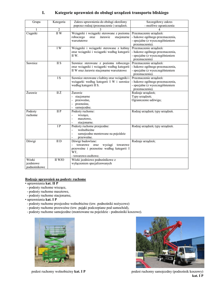 I. Grupa 1 Cięgniki Kategorie uprawnień do obsługi urządzeń transportu bliskiego Kategoria 2 II W IW Suwnice II S IS Żurawie II Ż Podesty ruchome II P IP Dźwigi Wózki jezdniowe podnośnikowe II D II WJO Zakres uprawnienia do obsługi określony Szczegółowy zakres poprzez rodzaj (przeznaczenie ) urządzeń. - możliwe ograniczenia 3 4 Wciągniki i wciągarki sterowane z poziomu Przeznaczenie urządzeń: roboczego oraz żurawie stacjonarne - hakowe ogólnego przeznaczenia, warsztatowe - specjalne (z wyszczególnieniem przeznaczenia). Wciągniki i wciągarki sterowane z kabiny Przeznaczenie urządzeń: oraz wciągniki i wciągarki według kategorii - hakowe ogólnego przeznaczenia, II W. - specjalne (z wyszczególnieniem przeznaczenia) Suwnice sterowane z poziomu roboczego Przeznaczenie urządzeń: oraz wciągniki i wciągarki według kategorii - hakowe ogólnego przeznaczenia, II W oraz żurawie stacjonarne warsztatowe - specjalne (z wyszczególnieniem przeznaczenia). Suwnice sterowane z kabiny oraz wciągniki i Przeznaczenie urządzeń: wciągarki według kategorii I W i suwnice - hakowe ogólnego przeznaczenia, według kategorii II S. - specjalne (z wyszczególnieniem przeznaczenia). Żurawie Rodzaje urządzeń; - stacjonarne Typy urządzeń; - przewoźne, Ograniczenie udźwigu; - przenośne, - samojezdne. Podesty ruchome: Rodzaj urządzeń; typy urządzeń. wiszące, masztowe, stacjonarne. Podesty ruchome przejezdne: Rodzaj urządzeń; typy urządzeń. wolnobieżne samojezdne montowane na pojeździe przewoźne. Dźwigi budowlane: Rodzaje urządzeń; - towarowe oraz wyciągi towarowe przewoźne i przenośne według kategorii I WT, - towarowo-osobowe. Wózki jezdniowe podnośnikowe z wyłączeniem specjalizowanych Rodzaje uprawnień na podesty ruchome • uprawnienia kat. II P - podesty ruchome wiszące, - podesty ruchome masztowe, - podesty ruchome stacjonarne, • uprawnienia kat. I P - podesty ruchome przejezdne wolnobieżne (tzw. podnośniki nożycowe) - podesty ruchome przewoźne (tzw. pająki podczepiane pod samochód), - podesty ruchome samojezdne (montowane na pojeździe - podnośniki koszowe). podest ruchomy wolnobieżny kat. I P podest ruchomy samojezdny (podnośnik koszowy) kat. I P Rodzaje uprawnień wciągniki i wciągarki • uprawnienia kat. II W - wciągniki i wciągarki sterowane z poziomu roboczego w tym bezprzewodowo • uprawnienia kat. I W - wciągniki i wciągarki sterowane z kabiny (przeznaczenie urządzeń: hakowe lub specjalne) wciągnik linowy kat. II W wciągarka linowa kat. I W