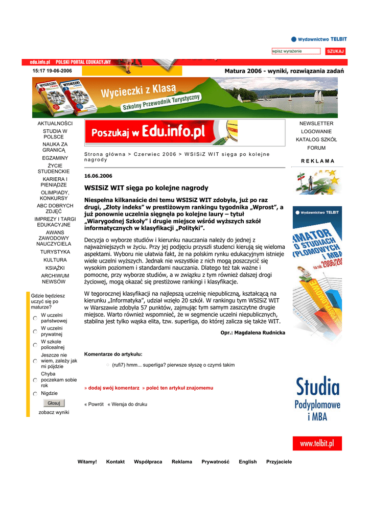 wpisz wyrażenie Matura 2006 - wyniki, rozwiązania zadań 15:17 19-06-2006 NEWSLETTER AKTUALNOŚCI STUDIA W POLSCE NAUKA ZA GRANICĄ EGZAMINY ŻYCIE STUDENCKIE KARIERA I PIENIĄDZE OLIMPIADY, KONKURSY ABC DOBRYCH ZDJĘĆ IMPREZY I TARGI EDUKACYJNE AWANS ZAWODOWY NAUCZYCIELA TURYSTYKA KULTURA KSIĄŻKI ARCHIWUM NEWSÓW Gdzie będziesz uczyć się po maturze? W uczelni j państwowej k l m n LOGOWANIE KATALOG SZKÓŁ FORUM Strona główna > Czerwiec 2006 > WSISiZ WIT sięga po kolejne nagrody 16.06.2006 WSISiZ WIT sięga po kolejne nagrody Niespełna kilkanaście dni temu WSISiZ WIT zdobyła, już po raz drugi, „Złoty indeks” w prestiżowym rankingu tygodnika „Wprost”, a już ponownie uczelnia sięgnęła po kolejne laury – tytuł „Wiarygodnej Szkoły” i drugie miejsce wśród wyższych szkół informatycznych w klasyfikacji „Polityki”. Decyzja o wyborze studiów i kierunku nauczania należy do jednej z najważniejszych w życiu. Przy jej podjęciu przyszli studenci kierują się wieloma aspektami. Wyboru nie ułatwia fakt, że na polskim rynku edukacyjnym istnieje wiele uczelni wyższych. Jednak nie wszystkie z nich mogą poszczycić się wysokim poziomem i standardami nauczania. Dlatego też tak ważne i pomocne, przy wyborze studiów, a w związku z tym również dalszej drogi życiowej, mogą okazać się prestiżowe rankingi i klasyfikacje. W tegorocznej klasyfikacji na najlepszą uczelnię niepubliczną, kształcącą na kierunku „Informatyka”, udział wzięło 20 szkół. W rankingu tym WSISiZ WIT w Warszawie zdobyła 57 punktów, zajmując tym samym zaszczytne drugie miejsce. Warto również wspomnieć, że w segmencie uczelni niepublicznych, stabilna jest tylko wąska elita, tzw. superliga, do której zalicza się także WIT. W uczelni j prywatnej k l m n Opr.: Magdalena Rudnicka W szkole j policealnej k l m n Jeszcze nie Komentarze do artykułu: j wiem, zależy jak k l m n (rufi7) hmm... superliga? pierwsze słyszę o czymś takim mi pójdzie Chyba j poczekam sobie k l m n rok j Nigdzie k l m n Głosuj » dodaj swój komentarz » poleć ten artykuł znajomemu « Powrót « Wersja do druku zobacz wyniki Witamy! Kontakt Współpraca Reklama Prywatność English Przyjaciele REKLAMA