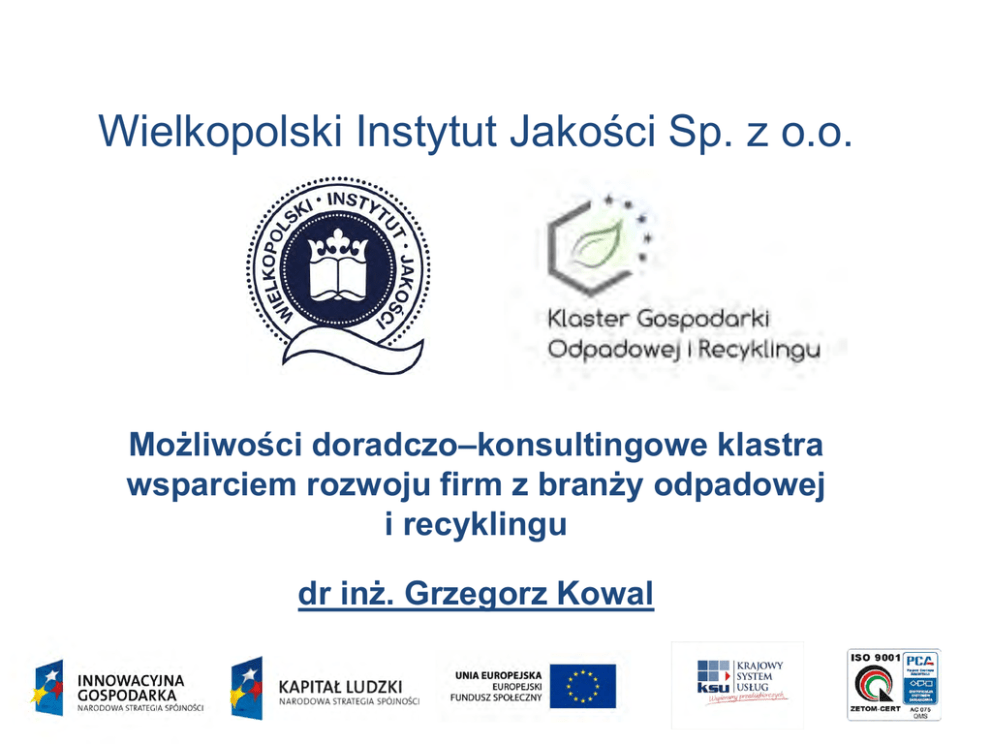 Wielkopolski Instytut Jakości Sp. z o.o. Możliwości doradczo–konsultingowe klastra wsparciem rozwoju firm z branży odpadowej i recyklingu dr inż. Grzegorz Kowal Plan prezentacji Kim jesteśmy? Czym się zajmujemy? Wybrane projekty / elementy oferty Co możemy razem? Kim jesteśmy? Wielkopolski Instytut Jakości Sp. z o.o. – partner klastra Gospodarki Odpadowej i Recyklingu działamy od 1995 roku świadcząc usługi doradcze na rzecz środowisk gospodarczych, w których funkcjonujemy realizujemy projekty, które pozwalają świadczyć usługi doradcze dla MŚP nieodpłatnie lub na preferencyjnych warunkach (m.in. projekty finansowane przez PARP) Kim jesteśmy? wspieramy przedsięwzięcia inwestycyjne, szczególnie o wysokim stopniu innowacyjności tworzymy środowisko ekspertów związanych z życiem gospodarczym, naukowym i administracją publiczną wspieramy i rozwijamy klastry – jesteśmy organizatorem i liderem klastra oraz wspieramy klastry jako ich członkowie i partnerzy – dzielimy się wiedzą i doświadczeniem Czym się zajmujemy? Oferta Instytutu jako wsparcie doradcze dla Klastra Gospodarki Odpadowej i Recyklingu oraz element oferty klastra skierowanej do jego otoczenia: doradztwo inwestycyjne zarządzanie i certyfikację doradztwo produktowe usługi proinnowacyjne komunikacja i pomoc wejścia na rynki zagraniczne Doradztwo inwestycyjne Inkubator Instytutu Wsparcie doradcze i inwestycyjne (do 800 tys. zł) firm i osób z pomysłem na biznes – innowacyjny i z perspektywami rozwoju Inkubator w partnerstwie Technologicznym INTERIOR z Parkiem Naukowo- Współpraca z funduszami inwestycyjnymi nastawiona na doradztwo i realizację projektów inwestycyjnych Doradztwo inwestycyjne Wybrane branże, które wspieramy: biotechnologia energia odnawialna ekologia ochrona środowiska Zarządzanie i certyfikacja Wdrażanie Systemów Zarządzania i pomoc w zarządzaniu, np. wprowadzaniu koncepcji optymalizacji Pomoc w zdobywaniu certyfikatów zarządzania, znaków produktowych, środowiskowych i bezpieczeństwa, np. CE Wdrażanie Modelu EFQM i wsparcie w konkursach o regionalne, Polską i Europejską Nagrodę Jakości Doradztwo produktowe lepszyprodukt.pl – projekt finansowany przez PARP w ramach działania 5.2 POiG – usługi świadczone dla MŚP nieodpłatnie Badania preferencji klientów ukierunkowane na optymalizację jakościową produktów lub usług analizy ekonomiczne ukierunkowane na optymalizację ekonomiczną procesów wytwórczych, serwisu, zbiórki i zagospodarowania zużytych produktów Analizy środowiskowe ukierunkowane na optymalizację środowiskową produktów i usług w cyklu ich życia lub jego wybranych etapach Usługi proinnowacyjne USŁUGA DORADCZA O CHARAKTERZE PROINNOWACYJNYM – DORADZTWO WE WDROŻENIU INNOWACJI – dla mikroprzedsiębiorców, małych i średnich przedsiębiorców jako wsparcie dla rozwoju firm z branży odpadowej i recyklingu Komunikacja i pomoc wejścia na rynki zagraniczne Współpraca buduje – nasze działania oraz doświadcznie elementem oferty klastra i jego otoczenia Doświadczenia w realizacji projektów klastrowych Klastry, w których działamy: Powiązanie kooperacyjne marketingu i reklamy „Marka jutra” – Instytut koordynatorem klastra ProBio Cluster – wykonawca projektu „Wsparcie rozwoju gospodarczego i innowacyjności produktów w oparciu o naturalne technologie mikrobiologiczne”, finansowanego w ramach działania 5.1 POiG – Instytut członkiem klastra Klaster Gospodarki Odpadowej i Recyklingu – Instytut partnerem klastra Wspieranie doradcze innych przedsięwzięć klastrowych Nasze doświadczenie – doświadczeniem Klastra Wielkość przedsiębiorstwa Ilość zrealizowanych usług informacyjno-doradczych Mikro-przedsiębiorstwa 1321 Małe przedsiębiorstwa 780 Średnie przedsiębiorstwa 391 Duże przedsiębiorstwa 38 SUMA 2530 Z kim współpracujemy / dla kogo jesteśmy? przedsiębiorstwa z wielu branż i o zróżnicowanej skali działalności, partnerzy klastra oraz ich otoczenie instytucje naukowe, samodzielne i wewnętrzne komórki badawczo-rozwojowe organy administracji publicznej i samorządowe osoby poszukujące wsparcia przy zakładaniu i prowadzeniu działalności gospodarczej (ramy KSU) Co możemy zrealizować? Zapraszamy do współpracy Hala F stoisko 54 Dziękuje za uwagę Wielkopolski Instytut Jakości ul. Szelągowska 49, 61-626 Poznań Tel. 61 855-39-90 Fax 61 855-39-92 e-mail: [email protected] www.instytut.poznan.pl