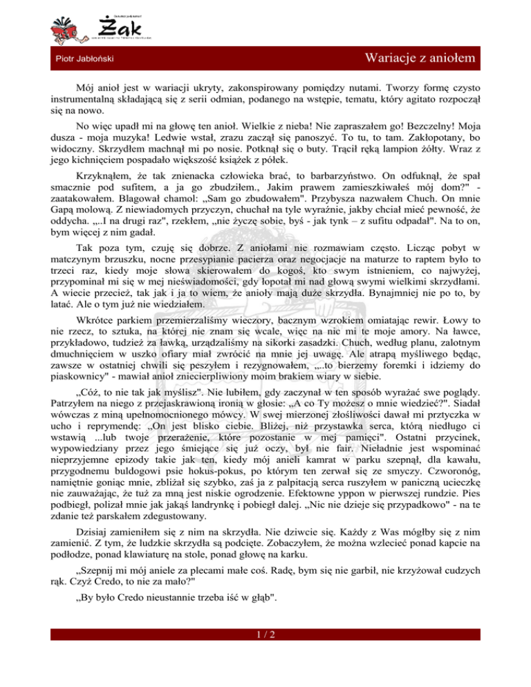 Wariacje z aniołem Piotr Jabłoński Mój anioł jest w wariacji ukryty, zakonspirowany pomiędzy nutami. Tworzy formę czysto instrumentalną składającą się z serii odmian, podanego na wstępie, tematu, który agitato rozpoczął się na nowo. No więc upadł mi na głowę ten anioł. Wielkie z nieba! Nie zapraszałem go! Bezczelny! Moja dusza - moja muzyka! Ledwie wstał, zrazu zaczął się panoszyć. To tu, to tam. Zakłopotany, bo widoczny. Skrzydłem machnął mi po nosie. Potknął się o buty. Trącił ręką lampion żółty. Wraz z jego kichnięciem pospadało większość książek z półek. Krzyknąłem, że tak znienacka człowieka brać, to barbarzyństwo. On odfuknął, że spał smacznie pod sufitem, a ja go zbudziłem., Jakim prawem zamieszkiwałeś mój dom?" zaatakowałem. Blagował chamol: „Sam go zbudowałem". Przybysza nazwałem Chuch. On mnie Gapą molową. Z niewiadomych przyczyn, chuchał na tyle wyraźnie, jakby chciał mieć pewność, że oddycha. „..I na drugi raz", rzekłem, „nie życzę sobie, byś - jak tynk – z sufitu odpadał". Na to on, bym więcej z nim gadał. Tak poza tym, czuję się dobrze. Z aniołami nie rozmawiam często. Licząc pobyt w matczynym brzuszku, nocne przesypianie pacierza oraz negocjacje na maturze to raptem było to trzeci raz, kiedy moje słowa skierowałem do kogoś, kto swym istnieniem, co najwyżej, przypominał mi się w mej nieświadomości, gdy łopotał mi nad głową swymi wielkimi skrzydłami. A wiecie przecież, tak jak i ja to wiem, że anioły mają duże skrzydła. Bynajmniej nie po to, by latać. Ale o tym już nie wiedziałem. Wkrótce parkiem przemierzaliśmy wieczory, bacznym wzrokiem omiatając rewir. Łowy to nie rzecz, to sztuka, na której nie znam się wcale, więc na nic mi te moje amory. Na ławce, przykładowo, tudzież za ławką, urządzaliśmy na sikorki zasadzki. Chuch, według planu, zalotnym dmuchnięciem w uszko ofiary miał zwrócić na mnie jej uwagę. Ale atrapą myśliwego będąc, zawsze w ostatniej chwili się peszyłem i rezygnowałem, „..to bierzemy foremki i idziemy do piaskownicy" - mawiał anioł zniecierpliwiony moim brakiem wiary w siebie. „Cóż, to nie tak jak myślisz". Nie lubiłem, gdy zaczynał w ten sposób wyrażać swe poglądy. Patrzyłem na niego z przejaskrawioną ironią w głosie: „A co Ty możesz o mnie wiedzieć?". Siadał wówczas z miną upełnomocnionego mówcy. W swej mierzonej złośliwości dawał mi prztyczka w ucho i reprymendę: „On jest blisko ciebie. Bliżej, niż przystawka serca, którą niedługo ci wstawią ...lub twoje przerażenie, które pozostanie w mej pamięci". Ostatni przycinek, wypowiedziany przez jego śmiejące się już oczy, był nie fair. Nieładnie jest wspominać nieprzyjemne epizody takie jak ten, kiedy mój anieli kamrat w parku szepnął, dla kawału, przygodnemu buldogowi psie hokus-pokus, po którym ten zerwał się ze smyczy. Czworonóg, namiętnie goniąc mnie, zbliżał się szybko, zaś ja z palpitacją serca ruszyłem w paniczną ucieczkę nie zauważając, że tuż za mną jest niskie ogrodzenie. Efektowne yppon w pierwszej rundzie. Pies podbiegł, polizał mnie jak jakąś landrynkę i pobiegł dalej. „Nic nie dzieje się przypadkowo" - na te zdanie też parskałem zdegustowany. Dzisiaj zamieniłem się z nim na skrzydła. Nie dziwcie się. Każdy z Was mógłby się z nim zamienić. Z tym, że ludzkie skrzydła są podcięte. Zobaczyłem, że można wzlecieć ponad kapcie na podłodze, ponad klawiaturę na stole, ponad głowę na karku. „Szepnij mi mój aniele za plecami małe coś. Radę, bym się nie garbił, nie krzyżował cudzych rąk. Czyż Credo, to nie za mało?" „By było Credo nieustannie trzeba iść w głąb". 1/2 Wariacje z aniołem Piotr Jabłoński Pary skrzydeł, modelu Manumissio, nie doczekałem się. Chuch obiecał, że przyniesie mi takie, jak wróci z podróży służbowej. Nie wrócił do teraz. Wyjdę więc na zewnątrz i poszukam jakiegoś strusia. Przecież na kurzych skrzydłach nie ulecę pod mą ambicję. Zagram również nowymi nutkami gamę chamolową. Na cześć kumpla. On jest i łopoce. Będzie chuchał nadal. Anioł, z zasady, chodzi w parze z człowiekiem. 2/2