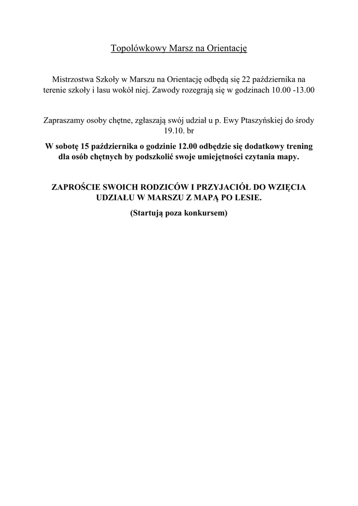 Topolówkowy Marsz na Orientację Mistrzostwa Szkoły w Marszu na Orientację odbędą się 22 października na terenie szkoły i lasu wokół niej. Zawody rozegrają się w godzinach 10.00 -13.00 Zapraszamy osoby chętne, zgłaszają swój udział u p. Ewy Ptaszyńskiej do środy 19.10. br W sobotę 15 października o godzinie 12.00 odbędzie się dodatkowy trening dla osób chętnych by podszkolić swoje umiejętności czytania mapy. ZAPROŚCIE SWOICH RODZICÓW I PRZYJACIÓŁ DO WZIĘCIA UDZIAŁU W MARSZU Z MAPĄ PO LESIE. (Startują poza konkursem)