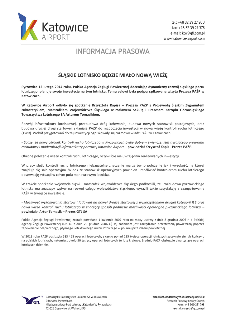 ŚLĄSKIE LOTNISKO BĘDZIE MIAŁO NOWĄ WIEŻĘ Pyrzowice 12 lutego 2014 roku, Polska Agencja Żeglugi Powietrznej doceniając dynamiczny rozwój śląskiego portu lotniczego, planuje swoje inwestycje na tym lotnisku. Temu celowi była podporządkowana wizyta Prezesa PAŻP w Katowicach. W Katowice Airport odbyło się spotkanie Krzysztofa Kapisa – Prezesa PAŻP z Wojewodą Śląskim Zygmuntem Łukaszczykiem, Marszałkiem Województwa Śląskiego Mirosławem Sekułą i Prezesem Zarządu Górnośląskiego Towarzystwa Lotniczego SA Arturem Tomasikiem. Rozwój infrastruktury lotniskowej, przebudowa dróg kołowania, budowa nowych stanowisk postojowych, oraz budowa drugiej drogi startowej, skłaniają PAŻP do rozpoczęcia inwestycji w nową wieżę kontroli ruchu lotniczego (TWR). Wokół przygotowań do tej inwestycji ogniskowały się rozmowy władz PAŻP w Katowicach. - Sądzę, że nowy ośrodek kontroli ruchu lotniczego w Pyrzowicach byłby dobrym zwieńczeniem trwającego programu rozbudowy i modernizacji infrastruktury portowej Katowice Airport – powiedział Krzysztof Kapis - Prezes PAŻP. Obecne położenie wieży kontroli ruchu lotniczego, oczywiście nie uwzględnia realizowanych inwestycji. W pracy służb kontroli ruchu lotniczego niebagatelne znaczenie ma zarówno położenie jak i wysokość, na której znajduje się sala operacyjna. Widok ze stanowisk operacyjnych powinien umożliwiać kontrolerom ruchu lotniczego obserwację sytuacji w całym polu manewrowym lotniska. W trakcie spotkanie wojewoda śląski i marszałek województwa śląskiego podkreślili, że rozbudowa pyrzowickiego lotniska ma znaczący wpływ na rozwój całego województwa śląskiego, wyrazili także satysfakcję z zaangażowanie PAŻP w trwające inwestycje. - Możliwość wykonywania startów i lądowań na nowej drodze startowej z wykorzystaniem drugiej kategorii ILS oraz nowa wieża kontroli ruchu lotniczego w znaczący sposób podniesie możliwości operacyjne pyrzowickiego lotniska – powiedział Artur Tomasik – Prezes GTL SA Polska Agencja Żeglugi Powietrznej została powołana 1 kwietnia 2007 roku na mocy ustawy z dnia 8 grudnia 2006 r. o Polskiej Agencji Żeglugi Powietrznej (Dz. U. z dnia 29 grudnia 2006 r.) Jej zadaniem jest zarządzanie przestrzenią powietrzną poprzez zapewnienie bezpiecznego, płynnego i efektywnego ruchu lotniczego w polskiej przestrzeni powietrznej. W 2013 roku PAŻP obsłużyła 683 468 operacji lotniczych, z czego ponad 235 tysięcy operacji lotniczych zaczynało się lub kończyło na polskich lotniskach, natomiast około 50 tysięcy operacji lotniczych to loty krajowe. Średnio PAŻP obsługuje dwa tysiące operacji lotniczych dziennie.
