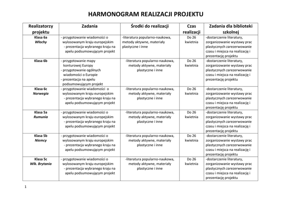 HARMONOGRAM REALIZACJI PROJEKTU Realizatorzy projektu Środki do realizacji -literatura popularno-naukowa, metody aktywne, materiały plastyczne i inne Czas realizacji Klasa 6a Włochy - przygotowanie wiadomości o wylosowanym kraju europejskim - prezentacja wybranego kraju na apelu podsumowującym projekt Klasa 6b - przygotowanie mapy konturowej Europy - przygotowanie ogólnych wiadomości o Europie - prezentacja na apelu podsumowującym projekt - przygotowanie wiadomości o wylosowanym kraju europejskim - prezentacja wybranego kraju na apelu podsumowującym projekt -literatura popularno-naukowa, metody aktywne, materiały plastyczne i inne Do 26 kwietnia -literatura popularno-naukowa, metody aktywne, materiały plastyczne i inne Do 26 kwietnia Klasa 5a Rumunia - przygotowanie wiadomości o wylosowanym kraju europejskim - prezentacja wybranego kraju na apelu podsumowującym projekt -literatura popularno-naukowa, metody aktywne, materiały plastyczne i inne Do 26 kwietnia Klasa 5b Niemcy - przygotowanie wiadomości o wylosowanym kraju europejskim - prezentacja wybranego kraju na apelu podsumowującym projekt -literatura popularno-naukowa, metody aktywne, materiały plastyczne i inne Do 26 kwietnia Klasa 5c Wlk. Brytania - przygotowanie wiadomości o wylosowanym kraju europejskim - prezentacja wybranego kraju na apelu podsumowującym projekt -literatura popularno-naukowa, metody aktywne, materiały plastyczne i inne Do 26 kwietnia Klasa 6c Norwegia 1 Zadania Do 26 kwietnia Zadania dla biblioteki szkolnej -dostarczenie literatury, zorganizowanie wystawy prac plastycznych zarezerwowanie czasu i miejsca na realizację i prezentację projektu -dostarczenie literatury, zorganizowanie wystawy prac plastycznych zarezerwowanie czasu i miejsca na realizację i prezentację projektu -dostarczenie literatury, zorganizowanie wystawy prac plastycznych zarezerwowanie czasu i miejsca na realizację i prezentację projektu -dostarczenie literatury, zorganizowanie wystawy prac plastycznych zarezerwowanie czasu i miejsca na realizację i prezentację projektu -dostarczenie literatury, zorganizowanie wystawy prac plastycznych zarezerwowanie czasu i miejsca na realizację i prezentację projektu -dostarczenie literatury, zorganizowanie wystawy prac plastycznych zarezerwowanie czasu i miejsca na realizację i prezentację projektu 2 Klasa5d Rosja - przygotowanie wiadomości o wylosowanym kraju europejskim - prezentacja wybranego kraju na apelu podsumowującym projekt -literatura popularno-naukowa, metody aktywne, materiały plastyczne i inne Do 26 kwietnia Klasa4a - przygotowanie wiadomości o budowie baśni - prezentacja na apelu -literatura popularno-naukowa, metody aktywne, materiały plastyczne i inne Do 26 kwietnia Klasa4b Dania - przygotowanie wiadomości o wylosowanym kraju europejskim - prezentacja wybranego kraju na apelu podsumowującym projekt -literatura popularno-naukowa, metody aktywne, materiały plastyczne i inne Do 26 kwietnia Klasa4c Czechy - przygotowanie wiadomości o wylosowanym kraju europejskim - prezentacja wybranego kraju na apelu podsumowującym projekt -literatura popularno-naukowa, metody aktywne, materiały plastyczne i inne Do 26 kwietnia Klasa4d Francja - przygotowanie wiadomości o wylosowanym kraju europejskim - prezentacja wybranego kraju na apelu podsumowującym projekt -literatura popularno-naukowa, metody aktywne, materiały plastyczne i inne Do 26 kwietnia Klasa3a Niemcy -opowiadanie wybranej baśni -prezentacja z wykorzystaniem rekwizytów -wypożyczenie książek, przygotowanie rekwizytów Do 26 kwietnia Klasa3b Włochy - opowiadanie wybranej baśni -prezentacja z wykorzystaniem rekwizytów -wypożyczenie książek, przygotowanie rekwizytów Do 26 kwietnia -dostarczenie literatury, zorganizowanie wystawy prac plastycznych zarezerwowanie czasu i miejsca na realizację i prezentację projektu -dostarczenie literatury, zorganizowanie wystawy prac plastycznych zarezerwowanie czasu i miejsca na realizację i prezentację projektu -dostarczenie literatury, zorganizowanie wystawy prac plastycznych zarezerwowanie czasu i miejsca na realizację i prezentację projektu -dostarczenie literatury, zorganizowanie wystawy prac plastycznych zarezerwowanie czasu i miejsca na realizację i prezentację projektu -dostarczenie literatury, zorganizowanie wystawy prac plastycznych zarezerwowanie czasu i miejsca na realizację i prezentację projektu -dostarczenie literatury, zorganizowanie wystawy prac plastycznych zarezerwowanie czasu i miejsca na realizację i prezentację projektu -dostarczenie literatury, zorganizowanie wystawy prac plastycznych zarezerwowanie czasu i miejsca na realizację i prezentację projektu Klasa3c Norwegia - opowiadanie wybranej baśni -prezentacja z wykorzystaniem rekwizytów -wypożyczenie książek, przygotowanie rekwizytów Do 26 kwietnia Klasa3d Rosja - opowiadanie wybranej baśni -prezentacja z wykorzystaniem rekwizytów -wypożyczenie książek, przygotowanie rekwizytów Do 26 kwietnia Klasa2a Rumunia - przedstawienie scenki z wybranego fragmentu baśni -prezentacja z wykorzystaniem rekwizytów -wypożyczenie książek, przygotowanie rekwizytów Do 26 kwietnia Klasa2b Francja - przedstawienie scenki z wybranego fragmentu baśni -prezentacja z wykorzystaniem rekwizytów -wypożyczenie książek, przygotowanie rekwizytów Do 26 kwietnia Klasa2c Czechy - przedstawienie scenki z wybranego fragmentu baśni -prezentacja z wykorzystaniem rekwizytów -wypożyczenie książek, przygotowanie rekwizytów Do 26 kwietnia Klasa2d Dania - przedstawienie scenki z wybranego -wypożyczenie książek, fragmentu baśni przygotowanie rekwizytów -prezentacja z wykorzystaniem rekwizytów Do 26 kwietnia Klasa 2e - przedstawienie scenki z wybranego fragmentu baśni -prezentacja z wykorzystaniem rekwizytów Do 26 kwietnia Wlk. Brytania 3 -wypożyczenie książek, przygotowanie rekwizytów -dostarczenie literatury, zorganizowanie wystawy prac plastycznych zarezerwowanie czasu i mie