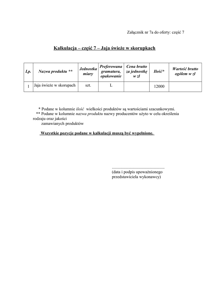 Załącznik nr 7a do oferty: część 7 Kalkulacja – część 7 – Jaja świeże w skorupkach Lp. Nazwa produktu ** 1 Jaja świeże w skorupach Preferowana Cena brutto Jednostka gramatura, za jednostkę miary opakowanie w zł szt. L Ilość* Wartość brutto ogółem w zł 12000 * Podane w kolumnie ilość wielkości produktów są wartościami szacunkowymi. ** Podane w kolumnie nazwa produktu nazwy producentów użyto w celu określenia rodzaju oraz jakości zamawianych produktów Wszystkie pozycje podane w kalkulacji muszą być wypełnione. .................................................. (data i podpis upoważnionego przedstawiciela wykonawcy)