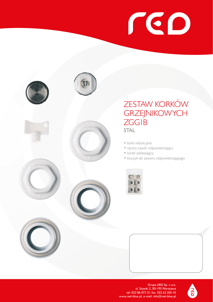 ZESTAW KORKÓW GRZEJNIKOWYCH ZGG1B STAL • korki redukcyjne • ręczny zawór odpowietrzający • korek zaślepiający • kluczyk do zaworu odpowietrzającego Grupa ABG Sp. z o.o. ul. Stawki 2, 00-193 Warszawa tel: 022 86 073 31, fax. 022 63 505 45 www.red-blue.pl, e-mail: [email protected] ZGG1B - zestaw korków grzejnikowych kod artykułu ZGG1B opis • 2 x korki redukcyjne 1” x 1/2” lewy z uszczelką • 2 x korki redukcyjne 1” x 1/2” prawy z uszczelką • ręczny zawór odpowietrzający 1/2” • korek zaślepiający 1/2” • kluczyk do zaworu odpowietrzającego www.red-blue.pl