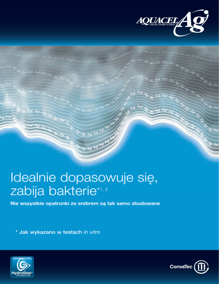 Idealnie dopasowuje się, zabija bakterie* 1, 2 Nie wszystkie opatrunki ze srebrem są tak samo zbudowane * Jak wykazano w testach in vitro Kluczowe wyzwania w procesie leczenia ran Główne wyzwanie w walce z infekcją rany to kontrolowanie zakażenia na jej powierzchni.2 Wybór właściwego opatrunku może odgrywać istotną rolę w walce z zakażeniem rany poprzez: •Z apobieganie powstawaniu pustych przestrzeni, w których gromadzi się wysięk oraz mogą namnażać się bakterie •Maksymalne zwiększenie ekspozycji powierzchni rany na działanie antybakteryjne Realizacja wyzwań Opatrunek AQUACEL® Ag pomaga kontrolować zakażenie rany2 Wyzwanie: Kontrolowanie powierzchownego zakażenia Niezwykle ważne jest osiągnięcie maksymalnej ekspozycji łożyska rany na działanie opatrunku antybakteryjnego. Osiągnięcie bliskiego kontaktu pomiędzy opatrunkiem antybakteryjnym a dnem rany powoduje zmniejszenie do minimum pustych przestrzeni, w których gromadzi się wysięk i mogą namnażać się bakterie. Rozwiązanie* Opatrunek AQUACEL® Ag wykonany jest w Technologii Hydrofiber®, dzięki temu żeluje w kontakcie z wysiękiem oraz idealnie dopasowuje się do powierzchni rany. Dzięki dopasowaniu minimalizuje wolne przestrzenie, w których może dochodzić do namnażania się bakterii, a srebro jonowe zawarte w opatrunku ma bezpośredni kontakt z patogenami w ranie.1, 4 * Jak wykazano w testach in vitro Opatrunek AQUACEL® Ag jest jedynym dostępnym opatrunkiem ze srebrem wykonanym w Technologii Hydrofiber®.3 Opatrunek AQUACEL® Ag może skutecznie wesprzeć realizację tych wyzwań. Jak to działa Opatrunek AQUACEL® Ag wykorzystuje Technologię Hydrofiber®, dzięki której żeluje w kontakcie z wysiękiem oraz idealnie dopasowuje się do powierzchni rany, eliminując puste przestrzenie.1 Opatrunek AQUACEL® Ag pokryto opatrunkiem Granuflex® Extra Thin i zastosowano na prezentowanym modelu rany Opatrunek AQUACEL® Ag rozpoczyna żelowanie w kontakcie z wysiękiem Opatrunek AQUACEL® Ag idealnie dopasowuje się do powierzchni rany, ograniczając wolne przestrzenie, w których mogą namnażać się bakterie Możliwości dopasowania się samoprzylepnego konkurencyjnego opatrunku piankowego ze srebrem nr 1 do nierównej powierzchni rany Jak wykazano w teście in vitro, możliwości dopasowania się konkurencyjnego samoprzylepnego opatrunku piankowego ze srebrem nr 1 były mniejsze, aniżeli opatrunku AQUACEL® Ag. Ponadto odnotowano gromadzenie się płynu pomiędzy opatrunkiem a modelem rany.5 Możliwości dopasowania się konkurencyjnego opatrunku piankowego ze srebrem nr 2 do nierównej powierzchni rany Jak wykazano w teście in vitro, możliwości dopasowania się konkurencyjnego opatrunku piankowego ze srebrem nr 2 były mniejsze aniżeli opatrunku AQUACEL® Ag. Ponadto odnotowano gromadzenie się płynu pomiędzy opatrunkiem a modelem rany.5 W obserwacji tej kawałkami opatrunku pokryto symulowaną tkankę rany (boczek wieprzowy). Za pomocą igły i strzykawki wstrzyknięto zabarwiony roztwór soli fizjologicznej (0,9% roztwór NaCl), aby zobrazować rozprzestrzenianie się wysięku w ranie. Strzałki wskazują kierunek rozprzestrzeniania się płynu.5 Nie wszystkie opatrunki ze srebrem są takie same… W przedstawianym teście in vitro, opatrunek AQUACEL® Ag zabił więcej bakterii Staphylococcus aureus aniżeli konkurencyjny samoprzylepny opatrunek piankowy ze srebrem nr 1 czy konkurencyjny opatrunek piankowy ze srebrem nr 2. Wyniki przedstawiono poniżej. Po zastosowaniu opatrunku AQUACEL® Ag wykazano istotnie mniejszą ilość namnożonych bakterii Staphylococcus aureus (0,4%) w porównaniu do konkurencyjnego przylepnego opatrunku piankowego ze srebrem nr 1 (25,7%) czy konkurencyjnego opatrunku piankowego ze srebrem nr 2 (73,2%).5 Staphylococcus aureus Opatrunek AQUACEL® Ag pokryto samoprzylepnym opatrunkiem nowej generacji Versiva® XC™ Konkurencyjny samoprzylepny opatrunek piankowy ze srebrem nr 1 Konkurencyjny opatrunek piankowy ze srebrem nr 2 Dodatkowo pod opatrunkiem AQUACEL® Ag zaobserwowano lepszą kontrolę nad rozprzestrzenianiem się bakterii, w porównaniu do konkurencyjnego samoprzylepnego opatrunku piankowego ze srebrem nr 1 czy konkurencyjnego opatrunku piankowego ze srebrem nr 2. Strzałki wskazują wzrost bakterii nawet poza obszarem nałożenia opatrunku na powierzchni zakażonej płytki. Opatrunek AQUACEL® Ag – Idealnie dopasowuje się, zabija bakterie1, 2 * Test in vitro symulujący modelową płytką ranę zakażoną bakteriami S. aureus i P. aeruginosa. Omawiane badanie porównawcze przeprowadzono trzykrotnie. Wykres procentowy przedstawia średnie wyniki tych trzech testów. Zdjęcia pokazują przykładowe wyniki. Opatrunek, próba, zasięg: • Opatrunek AQUACEL® Ag pokryty samoprzylepnym opatrunkiem nowej generacji Versiva® XC™ (S. aureus 0,0% – 1,2%; P. aeruginosa 2,7% – 20,8%) • Konkurencyjny samoprzylepny opatrunek piankowy ze srebrem nr 1 (S. aureus 21,0% – 30,8%; P. aeruginosa pełne 100%) • Konkurencyjny opatrunek piankowy ze srebrem nr 2 (S. aureus 65,9% – 80,6%; P. aeruginosa pełne 100%) Jak wykazano w testach in vitro opatrunek AQUACEL® Ag zabija więcej bakterii aniżeli konkurencyjny opatrunek piankowy ze srebrem.*5 Dodatkowo wykazano lepszą kontrolę opatrunku AQUACEL® Ag nad rozprzestrzenianiem się bakterii w porównaniu do konkurencyjnego opatrunku piankowego ze srebrem nr 2.5 S. aureus Opatrunek AQUACEL® Ag pokryty samoprzylepnym opatrunkiem nowej generacji Versiva® XC™ % wzrostu bakterii w zainfekowanym obszarze (na zagłębieniu płytki agarowej) 80 60 40 20 73,2 Opatrunek nr 2 Opatrunek nr 2 Opatrunek AQUACEL® Ag Średnia wzrostu bakterii (%) 100 0,4 0 Zaobserwowany wzrost bakterii na zewnątrz zainfekowanego obszaru (poza obszarem zagłębienia) P. aeruginosa Opatrunek AQUACEL® Ag pokryty samoprzylepnym opatrunkiem nowej generacji Versiva® XC™ % wzrostu bakterii w zainfekowanym obszarze (na 