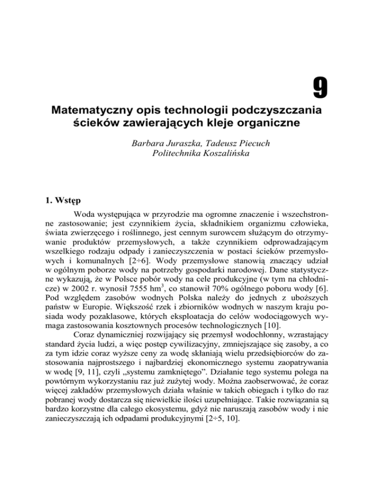 9 Matematyczny opis technologii podczyszczania ścieków zawierających kleje organiczne Barbara Juraszka, Tadeusz Piecuch Politechnika Koszalińska 1. Wstęp Woda występująca w przyrodzie ma ogromne znaczenie i wszechstronne zastosowanie; jest czynnikiem życia, składnikiem organizmu człowieka, świata zwierzęcego i roślinnego, jest cennym surowcem służącym do otrzymywanie produktów przemysłowych, a także czynnikiem odprowadzającym wszelkiego rodzaju odpady i zanieczyszczenia w postaci ścieków przemysłowych i komunalnych [2÷6]. Wody przemysłowe stanowią znaczący udział w ogólnym poborze wody na potrzeby gospodarki narodowej. Dane statystyczne wykazują, że w Polsce pobór wody na cele produkcyjne (w tym na chłodnicze) w 2002 r. wynosił 7555 hm3, co stanowił 70% ogólnego poboru wody [6]. Pod względem zasobów wodnych Polska należy do jednych z uboższych państw w Europie. Większość rzek i zbiorników wodnych w naszym kraju posiada wody pozaklasowe, których eksploatacja do celów wodociągowych wymaga zastosowania kosztownych procesów technologicznych [10]. Coraz dynamiczniej rozwijający się przemysł wodochłonny, wzrastający standard życia ludzi, a więc postęp cywilizacyjny, zmniejszające się zasoby, a co za tym idzie coraz wyższe ceny za wodę skłaniają wielu przedsiębiorców do zastosowania najprostszego i najbardziej ekonomicznego systemu zaopatrywania w wodę [9, 11], czyli „systemu zamkniętego”. Działanie tego systemu polega na powtórnym wykorzystaniu raz już zużytej wody. Można zaobserwować, że coraz więcej zakładów przemysłowych działa właśnie w takich obiegach i tylko do raz pobranej wody dostarcza się niewielkie ilości uzupełniające. Takie rozwiązania są bardzo korzystne dla całego ekosystemu, gdyż nie naruszają zasobów wody i nie zanieczyszczają ich odpadami produkcyjnymi [2÷5, 10]. Barbara Juraszka, Tadeusz Piecuch 2. Propozycja układu technologicznego podczyszczania ścieków zawierających kleje organiczne Począwszy od roku 2001 Katedra Techniki Wodno Mułowej i Utylizacji Odpadów Politechniki Koszalińskiej nawiązała współpracę z Przedsiębiorstwem DREWEXiM zajmującym się produkcją okien i drzwi oraz innych elementów drewnianych zlokalizowanym w miejscowości Nowe Bielice koło Koszalina. Gospodarka ściekowa ograniczała się do wprowadzania ścieków do kanalizacji zbiorczej. Ten fakt spowodował konsekwencje w postaci zniszczenia kultury bakteryjnej lokalnej oczyszczalni ścieków w Niedalinie. Pod groźbą wypowiedzenia umowy o odbiorze i utylizacji ścieków zakład produkcyjny w Nowych Bielicach podjął kroki zmierzające ku polepszeniu wartości wskaźników zanieczyszczeń ścieków do kanalizacji. Powyższe determinowało rozpoczęcie prace w ramach tej dysertacji badań nad możliwością podczyszczania tych ścieków w procesach mechanicznych i fizykochemicznych, które to procesy zestawione w układ technologiczny powinny dać konkretny, realny i wymierny w przypadku wdrożenia efekt dla szeroko rozumianej ochrony środowiska. Ścieki będące przedmiotem badań powstają na drodze płukania instalacji klejowych a przede wszystkim wałków nanoszących kleje na elementy klejone Na podstawie wielu badań rozpoznawczych zaproponowano układ technologiczny podczyszczania ścieków przedstawiony na rys. 1. W pierwszym etapie badań ścieki surowe podaje się do procesu koagulacji (I węzeł technologiczny – rysunek 1). Proces koagulacji prowadzono z zastosowaniem trzech różnych koagulantów tj.: 18 hydrat siarczanu(VI) glinu(III), Al2(SO4)3 · 18H2O, wodorotlenku wapnia Ca(OH)2, 6 hydrat chlorku żelaza(III), FeCl3 · 6H2O. Ciecz nadosadowa po procesach koagulacji, a następnie sedymentacji grawitacyjnej, podawana jest do kolejnego węzła technologicznego tj. do procesu filtracji grawitacyjnej (II węzeł technologiczny – rysunek 1). Filtrat otrzymany po procesie filtracji grawitacyjnej doczyszcza się w procesie sorpcji – (III węzeł technologiczny – rysunek 1). Otrzymany eluat po procesie sorpcji można zawracać do produkcji lub odprowadzać do sieci kanalizacyjnej. Osady powstałe po procesach koagulacji i sedymentacji grawitacyjnej, zostają podane do procesu sedymentacji odśrodkowej (IV węzeł technologiczny – rysunek 1). Odwodnione osady ze względu na właściwości klejące nie mogą być zagospodarowane (np. w celach rolniczych), kieruje się do procesu spalania 108 Środkowo-Pomorskie Towarzystwo Naukowe Ochrony Środowiska Matematyczny opis technologii podczyszczania ścieków zawierających ... (V węzeł – rysunek 1). Po spalaniu otrzymuje się popioły, które można utylizować poprzez ich solidyfikację (VI węzeł technologiczny – rysunek 1). Obieg wodno-mułowy może pracować w układzie zamkniętym, co oznacza, że odsącz po procesie sedymentacji odśrodkowej można zawrócić do I węzła technologicznego, czyli do procesu koagulacji i sedymentacji grawitacyjnej bez negatywnego skutku dla jakości tych procesów. Informuje się czytelnika, że główny cel tej pracy to badania technologiczne oczyszczania ścieków, natomiast proces spalania oraz solidyfikacji jest tylko próbą utylizacji odwodnionych osadów pokoagulacyjnych. W aspekcie aplikacyjnego ujęcia całości problemu oczyszczania tych ścieków uwaga ta rzutuje na szersze podejście do zagadnienia i nakazuje skupić się w badaniach na parametrach powszechnie uznanych jako najistotniejsze. Rys. 1. Schemat układu technologicznego podczyszczania ścieków poprodukcyjnych z Zakładu DREWEXiM Fig. 1. Diagram of the technological installation for pre-treatment of wastewater from the DREWEXiM company Tom 9. Rok 2007 109 Barbara Juraszka, Tadeusz Piecuch 3. Aproksymacja metodą punktu centralnego Badanie związków pomiędzy wieloma zmiennymi niezależnymi a zmienną zależną dokonano stosując aproksymacyjną metodę punktu centralnego. Metodę tą opracował i zastosował w s