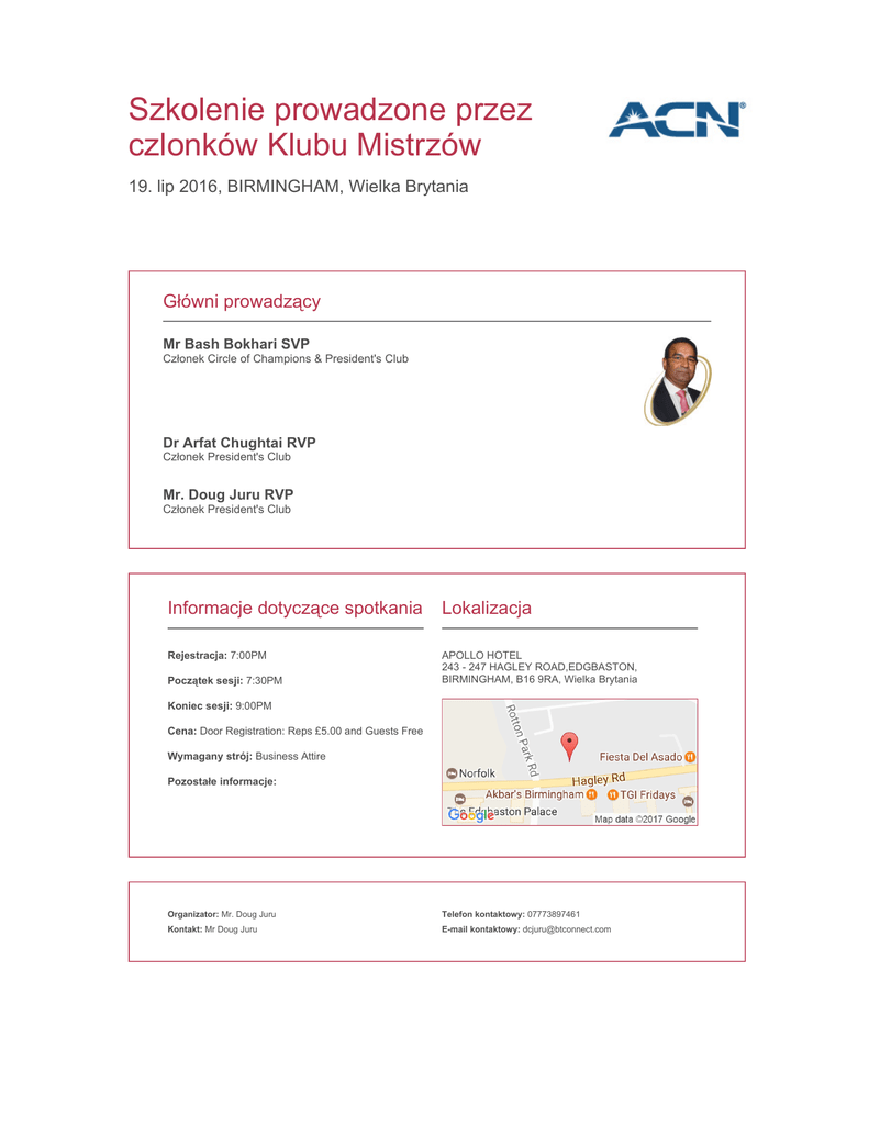 Szkolenie prowadzone przez czlonków Klubu Mistrzów 19. lip 2016, BIRMINGHAM, Wielka Brytania Główni prowadzący Mr Bash Bokhari SVP Członek Circle of Champions & President's Club Dr Arfat Chughtai RVP Członek President's Club Mr. Doug Juru RVP Członek President's Club Informacje dotyczące spotkania Lokalizacja Rejestracja: 7:00PM APOLLO HOTEL 243 - 247 HAGLEY ROAD,EDGBASTON, BIRMINGHAM, B16 9RA, Wielka Brytania Początek sesji: 7:30PM Koniec sesji: 9:00PM Cena: Door Registration: Reps £5.00 and Guests Free Wymagany strój: Business Attire Pozostałe informacje: Organizator: Mr. Doug Juru Telefon kontaktowy: 07773897461 Kontakt: Mr Doug Juru E-mail kontaktowy: [email protected]