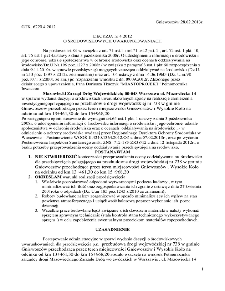 Gniewoszów 28.02.2013r. GTK. 6220.4.2012 DECYZJA nr 4.2012 O ŚRODOWISKOWYCH UWARUNKOWANIACH Na postawie art.84 w związku z art. 71 ust.1 i art.71 ust.2 pkt. 2 , art. 72 ust. 1 pkt. 10, art. 75 ust.1 pkt 4,ustawy z dnia 3 października 2008r. O udostępnieniu informacji o środowisku i jego ochronie, udziale społeczeństwa w ochronie środowiska oraz ocenach oddziaływania na środowisko/Dz.U.Nr.199 poz.1227 z 2008r / w związku z paragraf 3 ust.1 pkt.60 rozporządzenia z dnia 9.11.2010r. w sprawie przedsięwzięć mogących znacząco oddziaływać na środowisko (Dz.U. nr 213 poz. 1397 z 2012r. ze zmianami) oraz art. 104 ustawy z dnia 14.06.1960r (Dz. U.nr.98 poz.1071 z 2000r. ze zm.) po rozpatrzeniu wniosku z dn. 09.09.2012r. Złożonego przez działającego z upoważnienia, Pana Dariusza Tkaczyk ”MIASTOPROJEKT” Pełnomocnika Inwestora. Mazowiecki Zarząd Dróg Wojewódzkich; 00-048 Warszawa ul. Mazowiecka 14 w sprawie wydania decyzji o środowiskach uwarunkowanych zgody na realizacje zamierzenia inwestycyjnegopolegającego na przebudowie drogi wojewódzkiej nr 738 w gminie Gniewoszów przechodząca przez teren miejscowości Gniewoszów i Wysokie Koło na odcinku od km 13+461,30 do km 15+968,20 Po zasięgnięciu opinii stosownie do wymagań art.64 ust.1 pkt. 1 ustawy z dnia 3 października 2008r. o udostępnianiu informacji o środowisku informacji o środowisku i jego ochronie, udziale społeczeństwa w ochronie środowiska oraz o ocenach oddziaływania na środowisko ..- w odniesieniu o ochrony środowiska wydanej przez Regionalnego Dyrektora Ochrony Środowiska w Warszawie – Postanowienie WOOŚ-II.4240.1364.2012.OZ z dnia 07.02.2013r , oraz po wydaniu Postanowienia Inspektora Sanitarnego znak. ZNS. 712-185-ZR38/12 z dnia 12 listopada 2012r., o braku potrzeby przeprowadzenia oceny oddziaływania przedsięwzięcia na środowisko. POSTANAWIAM 1. NIE STWRIERDZIĆ konieczności przeprowadzenia oceny oddziaływania na środowisko dla przedsięwzięcia polegającego na przebudowie drogi wojewódzkiej nr 738 w gminie Gniewoszów przechodząca przez teren miejscowości Gniewoszów i Wysokie Koło na odcinku od km 13+461,30 do km 15+968,20 2. OKREŚLAM warunki realizacji przedsięwzięcia : 1. Właściwie gospodarować odpadami wytworzonymi podczas budowy , w tym minimalizować ich ilość oraz zagospodarowania ich zgonie z ustawą z dnia 27 kwietnia 2001roku o odpadach (Dz. U.nr.185 poz.1243 z 2010 ze zmianami); 2. Roboty budowlane należy zorganizować w sposób minimalizujący ich wpływ na stan powietrza atmosferycznego i uciążliwość hałasową poprzez wykonanie ich porze dziennej; 3. Wszelkie prace budowlane bądź związane z ich dowozem materiałów należy wykonać sprzętem sprawnym technicznie (stała kontrola stanu technicznego wykorzystywanego sprzętu ) w celu zapobieżenia ewentualnym przeciekom materiałów ropopochodnych. UZASADNIENIE Postępowanie administracyjne w sprawi wydania decyzji o środowiskowych uwarunkowaniach dla przedsięwzięcia p.n. przebudowa drogi wojewódzkiej nr 738 w gminie Gniewoszów przechodząca przez teren miejscowości Gniewoszów i Wysokie Koło na odcinku od km 13+461,30 do km 15+968,20 zostało wszczęte na wniosek Pełnomocnika zarządcy drogi Mazowieckiego Zarządu Dróg wojewódzkich w Warszawie , ul. Mazowiecka 14 1 Dla całego terenu przewidzianego po inwestycję brak jest obowiązującego planu miejscowego zagospodarowania przestrzennego. Projektowana inwestycja jest przedsięwzięciem mogącym znacząco oddziaływać na środowisko / paragraf 3 ust. 1 pkt. 60 rozporządzenia Rady Ministrów z dn. 9 listopada 2010r w sprawie określenia rodzajów przedsięwzięć mogących znacząco oddziaływać na środowisko Dz. U. nr 213 poz. 1397 z 2010r/. Obwieszczenie zostało podane o publicznej wiadomości w dniu 06.09.2012r. W sposób zwyczajowo przyjęty , poprzez zamieszczenie informacji na tablicy ogłoszeń w siedzibie gminy Gniewoszów; w okresie 21 dni to jest od dnia 06.09.2012 o 27.09.2012r i w miejscu projektowanego zamierzania inwestycyjnego. W okresie 21 dni nie złożono żadnych wniosków i uwag w sprawie projektowanego zamierzenia inwestycyjnego. Odstąpiono od przeprowadzenia rozprawy administracyjnej. Dla niniejszej inwestycji zgodnie z Postanowieniem Wójta Gniewoszów znak GTK. 6220.4.2012 z dnia 15 lutego 2013r. odstąpiono od przeprowadzenia oceny oddziaływania na środowisko, po uprzednim zasięgnięciu opinii Regionalnego Dyrektora Ochrony Środowiska – Postanowienie sygn. WOOŚ-II.4240.1364.2012.OZ z dnia 07 lutego 2013r. , I Państwowego Powiatowego Inspektora Sanitarnego – opinia, sygn. ZNS. 712-185-ZR 38/12 z dnia12 listopada 2012r. Realizacja inwestycji z racji jej charakteru, nie pociąga za sobą zagrożeń, tym bardziej znaczących oddziaływań. Dotyczy to oddziaływania bezpośredniego , długoterminowego, wtórnego i kumulującego. Oddziaływanie to nie wpłynie na pogorszenie stanu środowiska przyrodniczego. Organ biorąc pod uwagę rodzaj, parametry techniczne oraz zasięg potencjalnego oddziaływania przedsięwzięcia na środowisko, które to parametry zaliczają ją do grupy przedsięwzięć wymienionych w paragraf 3 ust. 1 pkt.60 rozporządzenia Rady Ministrów z dnia 9 listopada 2010r w sprawie przedsięwzięć mogących znacząco oddziaływać na środowisko (Dz.U.Nr. 213 poz. 1397 z 2010r), po wnikliwej analizie dostarczonych wraz z wnioskami materiałów, uwzględniając łącznie uwarunkowania przestawione w art. 63 ust. 1 ustawy 'ooś' i w oparciu o uzyskane opinie organów uprawnionych postanowił wyrazić opinie o braku konieczności przeprowadzenia oceny na środowisko argumentując to w odniesieniu do poszczególnych uwarunkowań przedstawionych poniżej 1) Rodzaj i charakterystyka przedsięwzięcia , z uwzględnieniem: Rodzaj, skala i usytuowanie przedsięwzięcia Przedmiotowe przedsięwzięcie polegać będzie na przebudowie drogi wojewódzkiej w obrębie miejscowości gminnej Gn