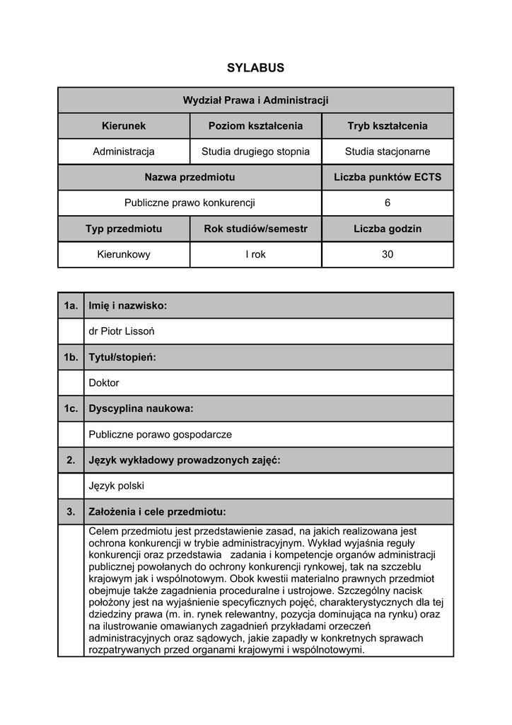 SYLABUS Wydział Prawa i Administracji 1a. Kierunek Poziom kształcenia Tryb kształcenia Administracja Studia drugiego stopnia Studia stacjonarne Nazwa przedmiotu Liczba punktów ECTS Publiczne prawo konkurencji 6 Typ przedmiotu Rok studiów/semestr Liczba godzin Kierunkowy I rok 30 Imię i nazwisko: dr Piotr Lissoń 1b. Tytuł/stopień: Doktor 1c. Dyscyplina naukowa: Publiczne porawo gospodarcze 2. Język wykładowy prowadzonych zajęć: Język polski 3. Założenia i cele przedmiotu: Celem przedmiotu jest przedstawienie zasad, na jakich realizowana jest ochrona konkurencji w trybie administracyjnym. Wykład wyjaśnia reguły konkurencji oraz przedstawia zadania i kompetencje organów administracji publicznej powołanych do ochrony konkurencji rynkowej, tak na szczeblu krajowym jak i wspólnotowym. Obok kwestii materialno prawnych przedmiot obejmuje także zagadnienia proceduralne i ustrojowe. Szczególny nacisk położony jest na wyjaśnienie specyficznych pojęć, charakterystycznych dla tej dziedziny prawa (m. in. rynek relewantny, pozycja dominująca na rynku) oraz na ilustrowanie omawianych zagadnień przykładami orzeczeń administracyjnych oraz sądowych, jakie zapadły w konkretnych sprawach rozpatrywanych przed organami krajowymi i wspólnotowymi. Wiedza przekazywana w ramach przedmiotu ma niebagatelne znaczenie dla porzyszłych administratywistów, zatrudnianych zarówno w strukturach przedsiębiorstw, jak również w organach administracji publicznej odpowiedzialnych za gospodarowanie usług w ogólnym interesie gospodarczym (usług użyteczności publicznej), które podlegają regułom konkurencji. 4. Wymagania wstępne: brak 5. Metody dydaktyczne: 6. Forma i warunki zaliczania przedmiotu: egzamin pisemny, pytania otwarte 7. Treści kształcenia (programowe): 1. Publiczne a prywatne prawo konkurencji. Cele publicznoprawnej interwencji w stosunki konkurencji rynkowej 2. Istota i zakres publicznego prawa konkurencji. Przepisy kwajowe a przepisy wspólnotowe. Europejska sieć konkurencji 3. Pozycja ustrojowa, zadania i kompetencje Prezesa Urzędu Ochrony Konkurencji i Konsumentów 4. Zakazzawierania porozumień ograniczających konkurenbcję 5. Zakaz nadużywania pozycji dominującej na rynku 6. Postępowania w sprawach praktyk ograniczajhących konkurencję. Rodzaje decyzji Prezesa Urzędu Ochrony Konkurencji i Konsumentów. Rodzaje sankcji za stosowanie praktyk 7. Koncentracja przedsiębiorców i zasady jej kontroli 8. Postępowania w sprawach kontroli koncentracji przedsiębiorców 9. Instytucja Leniency w przepisach ustawy o ochronie konkurencji i konsumentów 10. Zasady nadzorowania pomocy publicznej dla przedsiębiorców 8. Wykaz literatury podstawowej: 1. I. Nestoruk: Prawo konkurencji (teksty, kazusy, tablice), Warszawa 2008 2. M. Bernatt, A. Jurkowska, T. Skoczny: Ochrona konkurencji i konsumentów, Warszawa 2007 3. K. Strzyczkowski, Prawo gospodarcze publiczne, wydanie IV, Warsawa 2008 (rozdział IX i X) 4. K. Kohutek, M. Sieradzka: Ustawa o ochronie konkurencji i konsumentów. Komentarz, Warszawa 2008 5. B. Pęczalska, Ochrona konkurencji, Warszawa 2007 6. E. Modzelewska-Wąchal: Ustawa o ochronie konkurencji i konsumentów. Komentarz, Warszawa 2002 9. Wykaz literatury uzupełniającej: