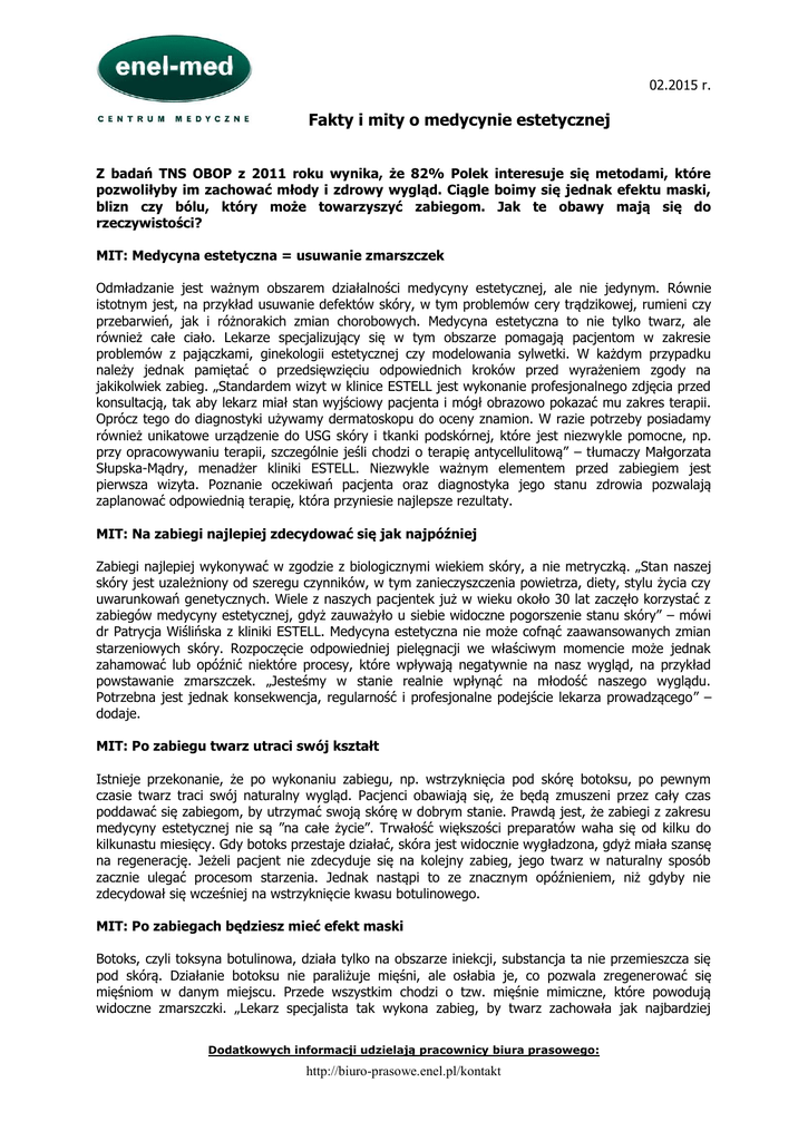 02.2015 r. Fakty i mity o medycynie estetycznej Z badań TNS OBOP z 2011 roku wynika, że 82% Polek interesuje się metodami, które pozwoliłyby im zachować młody i zdrowy wygląd. Ciągle boimy się jednak efektu maski, blizn czy bólu, który może towarzyszyć zabiegom. Jak te obawy mają się do rzeczywistości? MIT: Medycyna estetyczna = usuwanie zmarszczek Odmładzanie jest ważnym obszarem działalności medycyny estetycznej, ale nie jedynym. Równie istotnym jest, na przykład usuwanie defektów skóry, w tym problemów cery trądzikowej, rumieni czy przebarwień, jak i różnorakich zmian chorobowych. Medycyna estetyczna to nie tylko twarz, ale również całe ciało. Lekarze specjalizujący się w tym obszarze pomagają pacjentom w zakresie problemów z pajączkami, ginekologii estetycznej czy modelowania sylwetki. W każdym przypadku należy jednak pamiętać o przedsięwzięciu odpowiednich kroków przed wyrażeniem zgody na jakikolwiek zabieg. „Standardem wizyt w klinice ESTELL jest wykonanie profesjonalnego zdjęcia przed konsultacją, tak aby lekarz miał stan wyjściowy pacjenta i mógł obrazowo pokazać mu zakres terapii. Oprócz tego do diagnostyki używamy dermatoskopu do oceny znamion. W razie potrzeby posiadamy również unikatowe urządzenie do USG skóry i tkanki podskórnej, które jest niezwykle pomocne, np. przy opracowywaniu terapii, szczególnie jeśli chodzi o terapię antycellulitową” – tłumaczy Małgorzata Słupska-Mądry, menadżer kliniki ESTELL. Niezwykle ważnym elementem przed zabiegiem jest pierwsza wizyta. Poznanie oczekiwań pacjenta oraz diagnostyka jego stanu zdrowia pozwalają zaplanować odpowiednią terapię, która przyniesie najlepsze rezultaty. MIT: Na zabiegi najlepiej zdecydować się jak najpóźniej Zabiegi najlepiej wykonywać w zgodzie z biologicznymi wiekiem skóry, a nie metryczką. „Stan naszej skóry jest uzależniony od szeregu czynników, w tym zanieczyszczenia powietrza, diety, stylu życia czy uwarunkowań genetycznych. Wiele z naszych pacjentek już w wieku około 30 lat zaczęło korzystać z zabiegów medycyny estetycznej, gdyż zauważyło u siebie widoczne pogorszenie stanu skóry” – mówi dr Patrycja Wiślińska z kliniki ESTELL. Medycyna estetyczna nie może cofnąć zaawansowanych zmian starzeniowych skóry. Rozpoczęcie odpowiedniej pielęgnacji we właściwym momencie może jednak zahamować lub opóźnić niektóre procesy, które wpływają negatywnie na nasz wygląd, na przykład powstawanie zmarszczek. „Jesteśmy w stanie realnie wpłynąć na młodość naszego wyglądu. Potrzebna jest jednak konsekwencja, regularność i profesjonalne podejście lekarza prowadzącego” – dodaje. MIT: Po zabiegu twarz utraci swój kształt Istnieje przekonanie, że po wykonaniu zabiegu, np. wstrzyknięcia pod skórę botoksu, po pewnym czasie twarz traci swój naturalny wygląd. Pacjenci obawiają się, że będą zmuszeni przez cały czas poddawać się zabiegom, by utrzymać swoją skórę w dobrym stanie. Prawdą jest, że zabiegi z zakresu medycyny estetycznej nie są ”na całe życie”. Trwałość większości preparatów waha się od kilku do kilkunastu miesięcy. Gdy botoks przestaje działać, skóra jest widocznie wygładzona, gdyż miała szansę na regenerację. Jeżeli pacjent nie zdecyduje się na kolejny zabieg, jego twarz w naturalny sposób zacznie ulegać procesom starzenia. Jednak nastąpi to ze znacznym opóźnieniem, niż gdyby nie zdecydował się wcześniej na wstrzyknięcie kwasu botulinowego. MIT: Po zabiegach będziesz mieć efekt maski Botoks, czyli toksyna botulinowa, działa tylko na obszarze iniekcji, substancja ta nie przemieszcza się pod skórą. Działanie botoksu nie paraliżuje mięśni, ale osłabia je, co pozwala zregenerować się mięśniom w danym miejscu. Przede wszystkim chodzi o tzw. mięśnie mimiczne, które powodują widoczne zmarszczki. „Lekarz specjalista tak wykona zabieg, by twarz zachowała jak najbardziej Dodatkowych informacji udzielają pracownicy biura prasowego: http://biuro-prasowe.enel.pl/kontakt naturalny wygląd, włącznie z mimiką charakterystyczną dla pacjenta. Dopiero wstrzyknięcie nadmiernej ilości toksyny botulinowej może przyczynić się do powstania efektu maski, który można zaobserwować u niektórych celebrytów. Jest to jednak skutek nieumiejętnego przeprowadzenia zabiegu albo prośby pacjenta” – mówi dr Wiślińska. MIT: Usta mają nienaturalny kształt Od pierwszych filmów z udziałem Angeliny Jolie, wiele kobiet zaczęło marzyć, by mieć duże usta jak ta aktorka. W telewizji oraz kolorowej prasie, niestety, często można oglądać efekty nieudolnie wykonanych zabiegów powiększania ust. „Kwas hialuronowy, który wykorzystuje się przy tego typu zabiegach, jest bezpieczny dla organizmu człowieka, nie wywołuje zazwyczaj żadnych reakcji alergicznych. Zabieg powiększania ust, jeśli jest wykonywany przez specjalistę lekarza medycyny estetycznej, daje efekt naturalnie wyglądających większych ust, który utrzymuje się do około kilkunastu miesięcy” – tłumaczy specjalistka z ESTELL. Rozpatrując zabieg powiększania ust, warto poszukać kliniki, która specjalizuje się w tego typu zabiegach i posiada odpowiednie certyfikaty. W przypadku medycyny estetycznej powinniśmy kierować się nie ceną, ale przede wszystkim profesjonalizmem oraz doświadczeniem osób, w których ręce powierzamy nasze ciało. MIT: Zabiegi medycyny estetycznej nie są bezpieczne Z definicji zabiegi niosą ze sobą określone ryzyko powikłań, z którymi pacjent jest zawsze zapoznawany przed podjęciem jakiegokolwiek działania ze strony lekarza. Stopień zagrożenia w przypadku medycyny estetycznej jest niewielki. Generalnie bezpieczniej jest korzystać z usług doświadczonych i profesjonalnych klinik wyposażonych w wysokiej jakości sprzęt. „Priorytetem dla każdej kliniki powinna być wykwalifikowana kadra oraz profes
