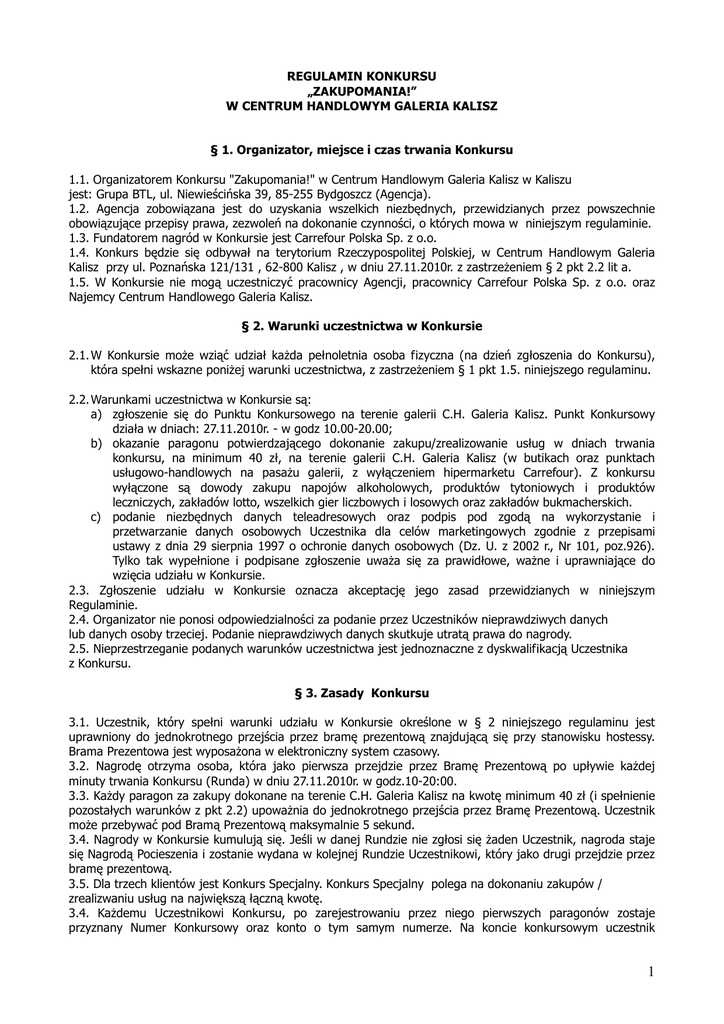 REGULAMIN KONKURSU „ZAKUPOMANIA!” W CENTRUM HANDLOWYM GALERIA KALISZ § 1. Organizator, miejsce i czas trwania Konkursu 1.1. Organizatorem Konkursu "Zakupomania!" w Centrum Handlowym Galeria Kalisz w Kaliszu jest: Grupa BTL, ul. Niewieścińska 39, 85-255 Bydgoszcz (Agencja). 1.2. Agencja zobowiązana jest do uzyskania wszelkich niezbędnych, przewidzianych przez powszechnie obowiązujące przepisy prawa, zezwoleń na dokonanie czynności, o których mowa w niniejszym regulaminie. 1.3. Fundatorem nagród w Konkursie jest Carrefour Polska Sp. z o.o. 1.4. Konkurs będzie się odbywał na terytorium Rzeczypospolitej Polskiej, w Centrum Handlowym Galeria Kalisz przy ul. Poznańska 121/131 , 62-800 Kalisz , w dniu 27.11.2010r. z zastrzeŜeniem § 2 pkt 2.2 lit a. 1.5. W Konkursie nie mogą uczestniczyć pracownicy Agencji, pracownicy Carrefour Polska Sp. z o.o. oraz Najemcy Centrum Handlowego Galeria Kalisz. § 2. Warunki uczestnictwa w Konkursie 2.1. W Konkursie moŜe wziąć udział kaŜda pełnoletnia osoba fizyczna (na dzień zgłoszenia do Konkursu), która spełni wskazne poniŜej warunki uczestnictwa, z zastrzeŜeniem § 1 pkt 1.5. niniejszego regulaminu. 2.2. Warunkami uczestnictwa w Konkursie są: a) zgłoszenie się do Punktu Konkursowego na terenie galerii C.H. Galeria Kalisz. Punkt Konkursowy działa w dniach: 27.11.2010r. - w godz 10.00-20.00; b) okazanie paragonu potwierdzającego dokonanie zakupu/zrealizowanie usług w dniach trwania konkursu, na minimum 40 zł, na terenie galerii C.H. Galeria Kalisz (w butikach oraz punktach usługowo-handlowych na pasaŜu galerii, z wyłączeniem hipermarketu Carrefour). Z konkursu wyłączone są dowody zakupu napojów alkoholowych, produktów tytoniowych i produktów leczniczych, zakładów lotto, wszelkich gier liczbowych i losowych oraz zakładów bukmacherskich. c) podanie niezbędnych danych teleadresowych oraz podpis pod zgodą na wykorzystanie i przetwarzanie danych osobowych Uczestnika dla celów marketingowych zgodnie z przepisami ustawy z dnia 29 sierpnia 1997 o ochronie danych osobowych (Dz. U. z 2002 r., Nr 101, poz.926). Tylko tak wypełnione i podpisane zgłoszenie uwaŜa się za prawidłowe, waŜne i uprawniające do wzięcia udziału w Konkursie. 2.3. Zgłoszenie udziału w Konkursie oznacza akceptację jego zasad przewidzianych w niniejszym Regulaminie. 2.4. Organizator nie ponosi odpowiedzialności za podanie przez Uczestników nieprawdziwych danych lub danych osoby trzeciej. Podanie nieprawdziwych danych skutkuje utratą prawa do nagrody. 2.5. Nieprzestrzeganie podanych warunków uczestnictwa jest jednoznaczne z dyskwalifikacją Uczestnika z Konkursu. § 3. Zasady Konkursu 3.1._Uczestnik, który spełni warunki udziału w Konkursie określone w § 2 niniejszego regulaminu jest uprawniony do jednokrotnego przejścia przez bramę prezentową znajdującą się przy stanowisku hostessy. Brama Prezentowa jest wyposaŜona w elektroniczny system czasowy. 3.2. Nagrodę otrzyma osoba, która jako pierwsza przejdzie przez Bramę Prezentową po upływie kaŜdej minuty trwania Konkursu (Runda) w dniu 27.11.2010r. w godz.10-20:00. 3.3. KaŜdy paragon za zakupy dokonane na terenie C.H. Galeria Kalisz na kwotę minimum 40 zł (i spełnienie pozostałych warunków z pkt 2.2) upowaŜnia do jednokrotnego przejścia przez Bramę Prezentową. Uczestnik moŜe przebywać pod Bramą Prezentową maksymalnie 5 sekund. 3.4. Nagrody w Konkursie kumulują się. Jeśli w danej Rundzie nie zgłosi się Ŝaden Uczestnik, nagroda staje się Nagrodą Pocieszenia i zostanie wydana w kolejnej Rundzie Uczestnikowi, który jako drugi przejdzie przez bramę prezentową. 3.5. Dla trzech klientów jest Konkurs Specjalny. Konkurs Specjalny polega na dokonaniu zakupów / zrealizwaniu usług na największą łączną kwotę. 3.4. KaŜdemu Uczestnikowi Konkursu, po zarejestrowaniu przez niego pierwszych paragonów zostaje przyznany Numer Konkursowy oraz konto o tym samym numerze. Na koncie konkursowym uczestnik 1 Konkursu będzie mógł rejestrować kolejne paragony, z zastrzeŜeniem, Ŝe kaŜdy kolejny paragon musi opiewać na kwotę minimum 40 złotych brutto - taki paragon uprawnia do przejście przez Bramę Prezentową. 3.5. Rozstrzygnięcie Konkursu nastąpi w dniu 27.11.2010 r. o godzinach 13.00, 14.00 i 16.00 w wyznaczonym przez Carrefour Polska Sp. z o.o. miejscu na terenie galerii Centrum Handlowego Galeria Kalisz. 3.6. Przedstawiciel Organizatora przygotuje Listę 5 Uczestników Konkursu tzw. Listę Finalistów – wyłonionych przez system jako Uczestników, którzy uzyskali na przyznanym Uczestnikowi koncie największą łączną wartość za dokonane zakupy/zrealizowane usługi, na podstawie zgłoszonych paragonów. Przy czym Uczestnik, któremu został nadany numer 1 na Liście Finalistów zebrał największą łączną wartość a Uczestnik, któremu nadano numer 5 zebrał najniŜszą łączną wartość zarejestrowanych paragonów wśród Listy Finalistów. W przypadku równej wartości sumy paragonów dwóch lub większej liczby osób, o kolejności wpisania na Listę Finalistów zadecyduje data i godzina dokonania zgłoszenia do konkursu – pierwszeństwo mają uczestnicy, którzy do Konkursu zgłosili się najbliŜej godziny 13.00, 14.00 lub 16.00 w dniu 27.11.2010 roku. 3.7. Osoba wyznaczona przez Organizatora w dniu 27.11.2010 roku o godzinie 13.00 rozpocznie wyczytywanie z Listy Finalistów 5 pierwszych nazwisk - uczestników Konkursu. Warunkiem przyznania Uczestnikowi nagrody jest: a) obecność podczas wyczytania; b) posiadanie i przedstawienie hostessie konkursowej paragonu/ów, który/e został/y zarejestrowane/e do konkursu; c) okazanie dokumentu potwierdzającego toŜsamość Uczestnika. 3.8. Wręczenie nagrody nastąpi kaŜdorazowo, natychmiast po jej przyznaniu. Warunkiem odbioru nagrody jest podpisanie przez Uczestnika protokołu Potwierdzenia Odbioru Nagrody i podanie wszystkich danych koniecznych do jego wypełnienia. 3.9. Jeden