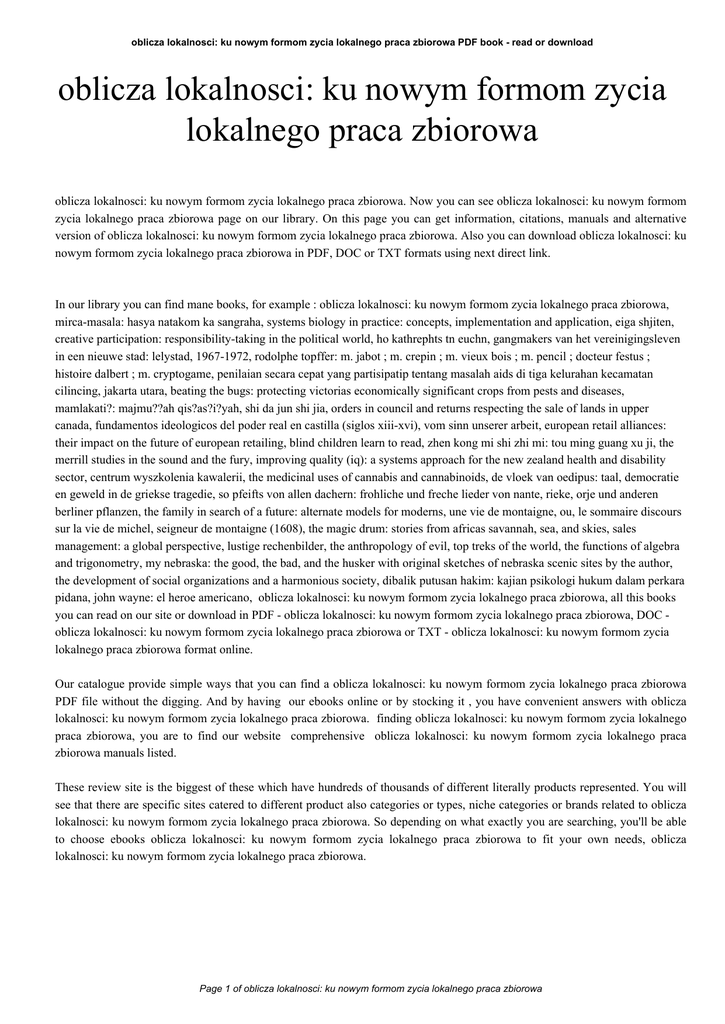 oblicza lokalnosci: ku nowym formom zycia lokalnego praca zbiorowa PDF book - read or download oblicza lokalnosci: ku nowym formom zycia lokalnego praca zbiorowa oblicza lokalnosci: ku nowym formom zycia lokalnego praca zbiorowa. Now you can see oblicza lokalnosci: ku nowym formom zycia lokalnego praca zbiorowa page on our library. On this page you can get information, citations, manuals and alternative version of oblicza lokalnosci: ku nowym formom zycia lokalnego praca zbiorowa. Also you can download oblicza lokalnosci: ku nowym formom zycia lokalnego praca zbiorowa in PDF, DOC or TXT formats using next direct link. In our library you can find mane books, for example : oblicza lokalnosci: ku nowym formom zycia lokalnego praca zbiorowa, mirca-masala: hasya natakom ka sangraha, systems biology in practice: concepts, implementation and application, eiga shjiten, creative participation: responsibility-taking in the political world, ho kathrephts tn euchn, gangmakers van het vereinigingsleven in een nieuwe stad: lelystad, 1967-1972, rodolphe topffer: m. jabot ; m. crepin ; m. vieux bois ; m. pencil ; docteur festus ; histoire dalbert ; m. cryptogame, penilaian secara cepat yang partisipatip tentang masalah aids di tiga kelurahan kecamatan cilincing, jakarta utara, beating the bugs: protecting victorias economically significant crops from pests and diseases, mamlakati?: majmu??ah qis?as?i?yah, shi da jun shi jia, orders in council and returns respecting the sale of lands in upper canada, fundamentos ideologicos del poder real en castilla (siglos xiii-xvi), vom sinn unserer arbeit, european retail alliances: their impact on the future of european retailing, blind children learn to read, zhen kong mi shi zhi mi: tou ming guang xu ji, the merrill studies in the sound and the fury, improving quality (iq): a systems approach for the new zealand health and disability sector, centrum wyszkolenia kawalerii, the medicinal uses of cannabis and cannabinoids, de vloek van oedipus: taal, democratie en geweld in de griekse tragedie, so pfeifts von allen dachern: frohliche und freche lieder von nante, rieke, orje und anderen berliner pflanzen, the family in search of a future: alternate models for moderns, une vie de montaigne, ou, le sommaire discours sur la vie de michel, seigneur de montaigne (1608), the magic drum: stories from africas savannah, sea, and skies, sales management: a global perspective, lustige rechenbilder, the anthropology of evil, top treks of the world, the functions of algebra and trigonometry, my nebraska: the good, the bad, and the husker with original sketches of nebraska scenic sites by the author, the development of social organizations and a harmonious society, dibalik putusan hakim: kajian psikologi hukum dalam perkara pidana, john wayne: el heroe americano, oblicza lokalnosci: ku nowym formom zycia lokalnego praca zbiorowa, all this books you can read on our site or download in PDF - oblicza lokalnosci: ku nowym formom zycia lokalnego praca zbiorowa, DOC oblicza lokalnosci: ku nowym formom zycia lokalnego praca zbiorowa or TXT - oblicza lokalnosci: ku nowym formom zycia lokalnego praca zbiorowa format online. Our catalogue provide simple ways that you can find a oblicza lokalnosci: ku nowym formom zycia lokalnego praca zbiorowa PDF file without the digging. And by having our ebooks online or by stocking it , you have convenient answers with oblicza lokalnosci: ku nowym formom zycia lokalnego praca zbiorowa. finding oblicza lokalnosci: ku nowym formom zycia lokalnego praca zbiorowa, you are to find our website comprehensive oblicza lokalnosci: ku nowym formom zycia lokalnego praca zbiorowa manuals listed. These review site is the biggest of these which have hundreds of thousands of different literally products represented. You will see that there are specific sites catered to different product also categories or types, niche categories or brands related to oblicza lokalnosci: ku nowym formom zycia lokalnego praca zbiorowa. So depending on what exactly you are searching, you'll be able to choose ebooks oblicza lokalnosci: ku nowym formom zycia lokalnego praca zbiorowa to fit your own needs, oblicza lokalnosci: ku nowym formom zycia lokalnego praca zbiorowa. Page 1 of oblicza lokalnosci: ku nowym formom zycia lokalnego praca zbiorowa