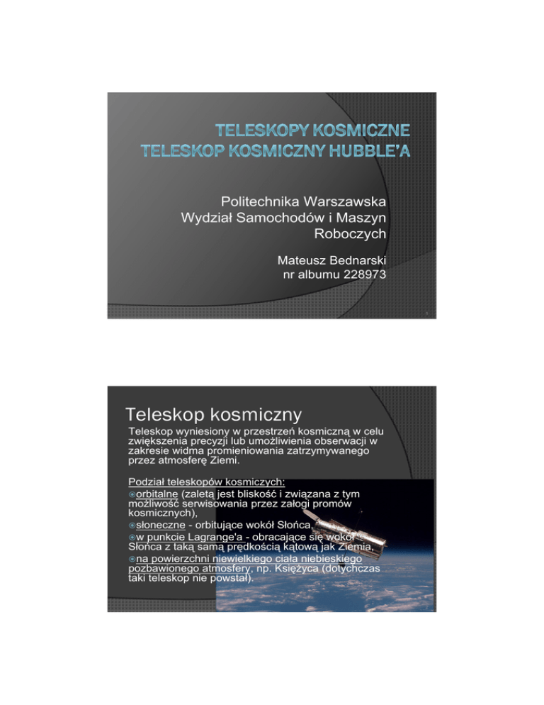 Politechnika Warszawska Wydział Samochodów i Maszyn Roboczych Mateusz Bednarski nr albumu 228973 1 Teleskop kosmiczny Teleskop wyniesiony w przestrzeń kosmiczną w celu zwiększenia precyzji lub umożliwienia obserwacji w zakresie widma promieniowania zatrzymywanego przez atmosferę Ziemi. Podział teleskopów kosmiczych: orbitalne (zaletą jest bliskość i związana z tym możliwość serwisowania przez załogi promów kosmicznych), słoneczne - orbitujące wokół Słońca, w punkcie Lagrange'a - obracające się wokół Słońca z taką samą prędkością kątową jak Ziemia, na powierzchni niewielkiego ciała niebieskiego pozbawionego atmosfery, np. Księżyca (dotychczas taki teleskop nie powstał). 2 Punkt libracyjny (punkt libracji, punkt Lagrange'a) Miejsce w przestrzeni, w układzie dwóch ciał powiązanych grawitacją, w którym ciało o pomijalnej masie może pozostawać w spoczynku względem ciał układu. Punkt libracyjny nazywany jest także punktem Lagrange'a od nazwiska jego odkrywcy Josepha Lagrange'a 3 Punkt libracyjny (punkt libracji, punkt Lagrange'a) Miejsce w przestrzeni, w układzie dwóch ciał powiązanych grawitacją, w którym ciało o pomijalnej masie może pozostawać w spoczynku względem ciał układu. Punkt libracyjny nazywany jest także punktem Lagrange'a od nazwiska jego odkrywcy Josepha Lagrange'a 4 Teleskopy kosmiczne Confirmed Planets: 966 Planet Candidates: 3,845 Eclipsing Binary Stars: 2,165 5 Kosmiczny Teleskop Hubble’a Orbita ziemska 24.04.1990 Zakres widma: światło widzialne i ultrafiolet 6 Teleskop Hubble’a - chronologia 1946 Astrofizyk Lyman Spitzer przedstawia pomysł umieszczenia teleskopu na orbicie okołoziemskiej. 1969 Narodowa Akademia Nauk (National Academy of Science) przedkłada ideę projekty NASA. 1971 w NASA powstaje zespół naukowy (Large Space Telescope Science Steering Group) z zadaniem sporządzenia studium wykonalności zadania. 1975 Do projektu włącza się Europejska Agencja Kosmiczna (ESA). Następuje zmiana specyfikacji technicznej. Średnica zwierciadła zostaje zmniejszona z 3 m do 2,4 m. 1977 Kongres Stanów Zjednoczonych podejmuje decyzję o finansowaniu programu. 1981 Zakończenie prac nad nad zwierciadłem teleskopu (które później okaże się wadliwe). Powołano Instytut Naukowy Teleskopu Kosmicznego (STSI) do zarządzania projektem. 1983 Teleskop oficjalnie otrzymuje nazwę, nadaną mu na cześć Edwina Hubble'a. 1984 Zakończenie montażu systemów optycznych. 1985 Zakończenie montażu statku kosmicznego (Kosmicznego Teleskopu Hubble'a). 1986 Zaplanowany na jesień start zostaje odwołany na skutek katastrofy promu Challengera. 1990 24 kwietnia teleskop zostaje wyniesiony na orbitę przez prom Discovery (STS-31). 20 maja pierwszy obraz. W czerwcu naukowcy ustalają , że nieostre obrazy, które otrzymują z teleskopu, to skutek wady zwierciadła. 1993 W grudniu misja serwisowa nr 1 (STS-61) montuje w teleskopie optyczny moduł korekcyjny. 1994 Teleskop obserwuje uderzenia fragmentów komety Shoemaker-Levy 9 w Jowisza. 1997 W lutym druga misja serwisowa (STS-82) wymienia niektóre części teleskopu. 1998 Dzięki teleskopowi stwierdzono, że ekspansja Wszechświata przyspiesza. 1999 W grudniu misja serwisowa 3A (STS-103) dokonuje wymiany wszystkich żyroskopów. 2002 W marcu kolejna misja serwisowa 3B (STS-109) wymienia panele słoneczne (to trzecia wymiana paneli) i instaluje Zaawansowaną Kamerę Przeglądową (ACS). 2004 Katastrofa Columbii w 2003 roku sprawia, że kolejne misje serwisowe wydają się mało realne. 2005 Administrator NASA, Michael Griffin, podejmuje starania, by wznowić serwisowanie teleskopu. 2006 Zapada decyzja o przeprowadzeniu kolejnej misji serwisowej. 2009 W maju kolejna misja serwisowa nr 4 (STS-125). Astronauci instalują Kamerę Szerokokątną 3 (WFC3) I Spektrograf Początków Wszechświata (COS) oraz dokonują napraw Zaawansowanej Kamery Przeglądowej i Spektrometru Obrazującego Teleskopu Kosmicznego (STIS). Usuwają i zabierają na Ziemię zbędny moduł korekcyjny, zamontowany w 1993 roku. Wszystkie te prace mają przedłużyć funkcjonowanie teleskopu co najmniej do 2013 roku 7 8 Hubble – wyniki - Do końca 2011 roku na podstawie danych z Hubble'a napisano ponad 10 000 prac naukowych, - Określenie odległości do Cefeid prowadzące do lepszego oszacowania stałej Hubble’a, - Udowodnienie licznego istnienia czarnych dziur, - Udowodnienie istnienia planet pozasłonecznych krążących wokół gwiazd podobnych do słońca, - wykrycie atmosfery na planecie nienależącej do Układu Słonecznego 9 Głębokie Pola Hubble’a Fotografie niewielkich obszarów nieba, które są najdalej sięgającymi astronomicznie zdjęciami jakie kiedykolwiek wykonano w świetle widzialnym. Głębokie Pole Hubble'a Głębokie Południowe Pole Hubble'a Ultragłębokie Pole Hubble'a Ekstremalnie Głębokie Pole Hubble'a 10 Głębokie Pole Hubble'a Głębokie Pole Hubble'a (HDF) – obraz niewielkiego, z pozoru pustego, obszaru w gwiazdozbiorze Wielkiej Niedźwiedzicy, bazujący na serii obserwacji Kosmicznym Teleskopem Hubble'a. Zdjęcie jest złożeniem 342 osobnych ekspozycji wykonywanych przy pomocy Wide Field and Planetary Camera 2 przez dziesięć kolejnych dni, pomiędzy 18 grudnia, a 28 grudnia 1995 r. Sfotografowany obszar ma rozmiary kątowe zaledwie 144" mniej więcej tyle, ile średnica piłki tenisowej widziana z odległości stu metrów. 11 Głębokie Pole Hubble'a Głębokie Pole Hubble'a (HDF) – obraz niewielkiego, z pozoru pustego, obszaru w gwiazdozbiorze Wielkiej Niedźwiedzicy, bazujący na serii obserwacji Kosmicznym Teleskopem Hubble'a. Zdjęcie jest złożeniem 342 osobnych ekspozycji wykonywanych przy pomocy Wide Field and Planetary Camera 2 przez dziesięć kolejnych dni, pomiędzy 18 grudnia, a 28 grudnia 1995 r. Sfotografowany obszar ma rozmiary kątowe zaledwie 144" mniej więcej tyle, ile średnica piłki tenisowej widziana z odległości stu metrów. 12